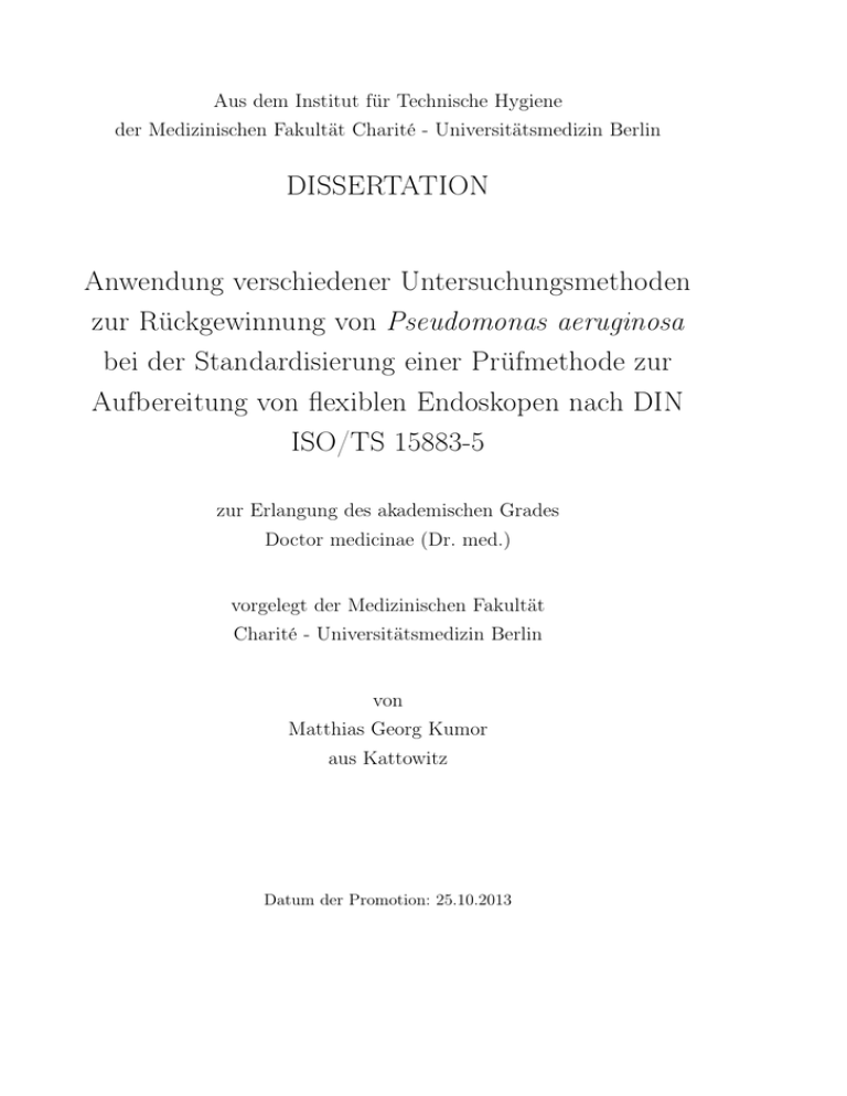 Aus dem Institut für Technische Hygiene der Medizinischen Fakultät Charité - Universitätsmedizin Berlin DISSERTATION Anwendung verschiedener Untersuchungsmethoden zur Rückgewinnung von Pseudomonas aeruginosa bei der Standardisierung einer Prüfmethode zur Aufbereitung von flexiblen Endoskopen nach DIN ISO/TS 15883-5 zur Erlangung des akademischen Grades Doctor medicinae (Dr. med.) vorgelegt der Medizinischen Fakultät Charité - Universitätsmedizin Berlin von Matthias Georg Kumor aus Kattowitz Datum der Promotion: 25.10.2013 2 Inhaltsverzeichnis 1 Einleitung 1.1 Aufbereitung . . . . . . . . . . . . . . . . . . . . . . . . . 1.1.1 Reinigung . . . . . . . . . . . . . . . . . . . . . . . 1.1.2 Desinfektion . . . . . . . . . . . . . . . . . . . . . . 1.1.2.1 Manuelle Desinfektion . . . . . . . . . . . 1.1.2.2 Teilmaschinelle Desinfektion . . . . . . . . 1.1.2.3 Maschinelle Desinfektion . . . . . . . . . . 1.1.3 Sterilisation . . . . . . . . . . . . . . . . . . . . . . 1.1.4 Reinigungs- und Desinfektionsmittellösungen . . . . 1.1.5 Anforderung an die Aufbereitung . . . . . . . . . . 1.2 Aufbau von flexiblen Endoskopen . . . . . . . . . . . . . . 1.3 Mit endoskopischen Eingriffen assoziierte Infektionserreger 1.3.1 Bakterien . . . . . . . . . . . . . . . . . . . . . . . 1.3.1.1 Pseudomonas spp. . . . . . . . . . . . . . 1.3.1.2 Salmonella spp. . . . . . . . . . . . . . . . 1.3.1.3 Serratia spp. . . . . . . . . . . . . . . . . 1.3.1.4 Helicobacter spp. . . . . . . . . . . . . . . 1.3.1.5 Mycobacterium spp. . . . . . . . . . . . . 1.3.1.6 Legionella pneumophila . . . . . . . . . . 1.3.2 Viren . . . . . . . . . . . . . . . . . . . . . . . . . . 1.3.3 Pilze . . . . . . . . . . . . . . . . . . . . . . . . . . 1.3.4 Prionen . . . . . . . . . . . . . . . . . . . . . . . . 1.4 Zusammenfassung . . . . . . . . . . . . . . . . . . . . . . . 1.5 Zielstellung der Arbeit . . . . . . . . . . . . . . . . . . . . . . . . . . . . . . . . . . . . . . . . . . . . . . . . . . . . . . . . . . . . . . . . . . . . . . . . . . . . . . . . . . . . . . . . . . . . . . . . . . . . . . . . . . . . . . . . . . . . . . . . . . . . . . . . . . . . . . . . . . . . . . . . . . . . . . . . . . . . . . . . . . . . . . . . . . . . . . . . . . . . . . . . . . . . . . . . . . . . . . . . . . . . 7 9 10 11 12 12 12 13 13 14 15 17 18 18 22 22 23 23 24 24 26 26 27 28 2 Materialien und Methoden 31 2.1 Materialien . . . . . . . . . . . . . . . . . . . . . . . . . . . . . . . . . . 31 2.1.1 Blut . . . . . . . . . . . . . . . . . . . . . . . . . . . . . . . . . . 31 3 Inhaltsverzeichnis 2.2 2.1.2 Testorganismus . . . . . . . . . . . . . . . . . . . . . . . . . . . . 32 2.1.3 Caseinpepton-Sojamehlpepton-Bouillon . . . . . . . . . . . . . . . 32 2.1.4 Bakterienbouillon . . . . . . . . . . . . . . . . . . . . . . . . . . . 32 2.1.5 Blut-Bakteriensuspension . . . . . . . . . . . . . . . . . . . . . . 32 2.1.6 Caseinpepton-Sojamehlpepton-Agar . . . . . . . . . . . . . . . . . 32 2.1.7 Bakteriensuspension . . . . . . . . . . . . . . . . . . . . . . . . . 33 2.1.8 Prüfkörper . . . . . . . . . . . . . . . . . . . . . . . . . . . . . . . 33 2.1.9 Spüllösungen . . . . . . . . . . . . . . . . . . . . . . . . . . . . . 33 2.1.10 Geräte . . . . . . . . . . . . . . . . . . . . . . . . . . . . . . . . . 34 Methoden . . . . . . . . . . . . . . . . . . . . . . . . . . . . . . . . . . . 35 2.2.1 Herstellung der Bakterienbouillon . . . . . . . . . . . . . . . . . . 35 2.2.2 Herstellung der Bakteriensuspension . . . . . . . . . . . . . . . . 36 2.2.3 Herstellung der Blut-Bakteriensuspension . . . . . . . . . . . . . . 37 2.2.4 Herstellung der Testanschmutzung . . . . . . . . . . . . . . . . . 37 2.2.5 Anschmutzung der Prüfkörper . . . . . . . . . . . . . . . . . . . . 37 2.2.6 Probengewinnung . . . . . . . . . . . . . . . . . . . . . . . . . . . 37 2.2.7 Versuchsreihen . . . . . . . . . . . . . . . . . . . . . . . . . . . . 38 2.2.7.1 Wirksamkeit von Ultraschall im Reagenzglas . . . . . . . 39 2.2.7.2 Überlebensverhalten von P. aeruginosa im Ultraschallbad 39 2.2.8 Durchführung der Versuchsreihen . . . . . . . . . . . . . . . . . . 39 2.2.9 Verdünnungsreihen . . . . . . . . . . . . . . . . . . . . . . . . . . 41 2.2.10 Ergebnisgewinnung . . . . . . . . . . . . . . . . . . . . . . . . . . 42 3 Versuchszusammenfassung und -auswertung 3.1 Unterschiedliche Spüllösungen . . . . . . . . . . . . . . . . . . . . . . . . 43 3.2 Unterschiedliche Spültechniken . . . . . . . . . . . . . . . . . . . . . . . . 43 3.3 Überlebensverhalten von P. aeruginosa im Ultraschallbad . . . . . . . . . 43 3.4 Spülung nach Ultraschallbehandlung . . . . . . . . . . . . . . . . . . . . 44 3.5 Weitere Auswertung . . . . . . . . . . . . . . . . . . . . . . . . . . . . . 44 4 Ergebnisse 4 43 45 4.1 Spülung mit unterschiedlichen Lösungen . . . . . . . . . . . . . . . . . . 45 4.2 Spülung mit unterschiedlichen Techniken . . . . . . . . . . . . . . . . . . 47 4.3 Überlebensverhalten von P. aeruginosa im Ultraschallbad . . . . . . . . . 51 4.4 Spülung nach Einsatz der Ultraschallbehandlung . . . . . . . . . . . . . . 53 Inhaltsverzeichnis 5 Diskussion 5.1 Bewertung der Methode . . . . . . . . . . . . . . . . . . . . . . . . . 5.1.1 Reproduzierbarkeit . . . . . . . . . . . . . . . . . . . . . . . . 5.1.2 Testanschmutzung . . . . . . . . . . . . . . . . . . . . . . . . 5.1.2.1 Bemerkung zur Entwicklung einer Testanschmutzung 5.1.3 Testorganismus . . . . . . . . . . . . . . . . . . . . . . . . . . 5.1.3.1 Biofilmbildung . . . . . . . . . . . . . . . . . . . . . 5.1.4 Prüfkörper . . . . . . . . . . . . . . . . . . . . . . . . . . . . . 5.1.4.1 Anforderung an die Aufbereitung . . . . . . . . . . . 5.2 Diskussion der Ergebnisse . . . . . . . . . . . . . . . . . . . . . . . . 5.2.1 Der Einsatz verschiedener Spüllösungen . . . . . . . . . . . . . 5.2.2 Der Einsatz verschiedener Spültechniken . . . . . . . . . . . . 5.2.3 Überlebensverhalten von P. aeruginosa . . . . . .