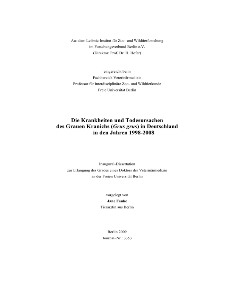 Aus dem Leibniz-Institut für Zoo- und Wildtierforschung im Forschungsverbund Berlin e.V. (Direktor: Prof. Dr. H. Hofer) eingereicht beim Fachbereich Veterinärmedizin Professur für interdisziplinäre Zoo- und Wildtierkunde Freie Universität Berlin Die Krankheiten und Todesursachen des Grauen Kranichs (Grus grus) in Deutschland in den Jahren 1998-2008 Inaugural-Dissertation zur Erlangung des Grades eines Doktors der Veterinärmedizin an der Freien Universität Berlin vorgelegt von Jane Fanke Tierärztin aus Berlin Berlin 2009 Journal–Nr.: 3353 Gedruckt mit Genehmigung des Fachbereichs Veterinärmedizin der Freien Universität Berlin Dekan: Univ.-Prof. Dr. Leo Brunnberg Erster Gutachter: Prof. Dr. Heribert Hofer Zweiter Gutachter: Univ.-Prof. Dr. Achim Gruber Dritter Gutachter: Prof. Dr. Hartwig Prange Deskriptoren (nach CAB-Thesaurus): grus, wild birds, avian diseases, disease prevalence, coccidiosis, hazards, mortality, power lines, poisoning, zinc, organophosphorus pesticides, rodents, parasites, coccidia, Eimeria, oligochaeta, intermediate host, Porrocaecum, Avipoxvirus, pathology, histology, parasitology Tag der Promotion: 26.03.2010 Bibliografische Information der Deutschen Nationalbibliothek Die Deutsche Nationalbibliothek verzeichnet diese Publikation in der Deutschen Nationalbibliografie; detaillierte bibliografische Daten sind im Internet über <http://dnb.ddb.de> abrufbar. ISBN: 978-3-86664-778-7 Zugl.: Berlin, Freie Univ., Diss., 2009 Dissertation, Freie Universität Berlin D 188 Dieses Werk ist urheberrechtlich geschützt. Alle Rechte, auch die der Übersetzung, des Nachdruckes und der Vervielfältigung des Buches, oder Teilen daraus, vorbehalten. Kein Teil des Werkes darf ohne schriftliche Genehmigung des Verlages in irgendeiner Form reproduziert oder unter Verwendung elektronischer Systeme verarbeitet, vervielfältigt oder verbreitet werden. Die Wiedergabe von Gebrauchsnamen, Warenbezeichnungen, usw. in diesem Werk berechtigt auch ohne besondere K ennzeichnung nicht zu der Annahme, dass solch e Namen im Sin ne de r Ware nzeichen- un d Markenschutz-Gesetzgebung als frei zu betrachte n wär en und d aher von jedermann benutzt werden dürfen. This document is protected by copyright law. No part of this document may be reproduced in any form by any means without prior written authorization of the publisher. alle Rechte vorbehalten | all rights reserved choriner str. 85 - 10119 berlin © mensch und buch verlag 2010 [email protected] – www.menschundbuch.de Abb. 1: Kranich-Rastplatz im Oberen Rhinluch (2005) abgedruckt mit freundlicher Genehmigung von Detlef Hase INHALT 1 ABKÜRZUNGSVERZEICHNIS 7 2 ABBILDUNGSVERZEICHNIS 8 3 TABELLENVERZEICHNIS 9 4 EINLEITUNG 10 5 LITERATURÜBERSICHT 12 5.1 Klassifizierung der Kraniche 12 5.2 Vorkommen des Grauen Kranichs 12 5.3 Biologie und Verhalten des Kranichs 12 5.3.1 5.3.2 5.3.3 5.3.4 5.3.5 Zug und Rast Überwinterung Fortpflanzung, Brut und Jungenaufzucht Nahrungsspektrum Alter, Mauser und Körpermaße 12 15 16 17 18 5.4 Bestandsentwicklung und Bestandssituation in Deutschland 19 5.5 5.5.1 5.5.2 Todesursachen bei Kranichen Traumatische Todesursachen Intoxikationen 21 21 24 5.6 5.6.1 5.6.2 5.6.3 5.6.4 5.6.4.1 5.6.4.2 5.6.4.3 5.6.4.4 5.6.4.5 5.6.4.6 Infektionskrankheiten Bakterielle Infektionen Pilzinfektionen Virale Infektionen Parasitäre Infektionen Protozoa Nematoda Trematoda Acanthocephala Cestoda Ektoparasiten 26 26 28 28 30 31 34 35 36 36 37 5.7 Regenwürmer als Zwischenwirte für Porrocaecum spp. 38 5.8 Sonstige Veränderungen 39 6 MATERIAL UND METHODEN 40 6.1 6.1.1 6.1.2 6.1.3 Pathologische Untersuchungen Herkunft und Fundumstände Äußere Besichtigung der Tierkörper Röntgenologische Untersuchung 40 40 42 43 4 INHALT 6.1.4 6.1.5 6.1.6 Sektion der Tierkörper Mikroskopische Untersuchungen Weitere Untersuchungen 43 44 44 6.2 6.2.1 6.2.2 Parasitologische Untersuchungen Teilsektion Koproskopische Untersuchungen 45 45 47 6.3 Regenwurmanalysen 49 6.4 Molekularparasitologische Untersuchungen 51 6.5 Weitere Hilfsmittel 55 6.6 Statistische Analyse 55 7 ERGEBNISSE 56 7.1 Körperkondition 56 7.2 Fundumstände 63 7.3 7.3.1 7.3.2 7.3.3 7.3.4 Todesursachen Traumatisch bedingte Todesursachen Intoxikation Infektionskrankheiten Sonstige Todesursachen 64 65 66 66 67 7.4 7.4.1 7.4.2 7.4.2.1 7.4.2.2 7.4.2.3 7.4.3 7.4.4 7.4.5 7.4.6 Organveränderungen Traumatisch bedingte Verletzungen Entzündungen Fokale Entzündungen Multifokale Entzündungen Diffuse Entzündungen Stoffwechselbedingte Organveränderungen Kreislaufbedingte Organveränderungen Neoplastische Organveränderungen Sonstige Organveränderungen 68 68 72 72 74 80 81 83 84 86 7.5 7.5.1 7.5.2 7.5.3 7.5.4 7.5.5 7.5.6 Ergebnisse der Teilsektion Protozoa Nematoda Trematoda Acanthocephala Cestoda Ektoparasiten 86 88 88 92 95 95 95 7.6 7.6.1 7.6.2 Ergebnisse der koproskopischen Untersuchungen Eimeria spp. Porrocaecum spp. 5 95 99 101 7.6.3 7.6.4 7.6.5 7.6.6 7.6.7 Capillaria spp. Luftröhrennematoden Trematoden Sporulation von Eimeria spp. Embryogenese von Porrocaecum ardeae 102 103 103 104 105 7.7 7.7.1 7.7.2 7.7.3 Ergebnisse der Regenwurmanalysen Freilandregenwürmer Experimentelle Infektion von Regenwürmern Phylogenetische Analyse des 5.8S- und ITS-2-Fragments 107 107 111 112 8 DISKUSSION 114 8.1 8.1.1 8.1.2 8.1.3 8.1.4 Pathologische Untersuchungen Körperkondition Traumatische Todesursachen Vergiftungen Krankheiten und Organveränderungen 114 114 115 118 119 8.2 Parasitologische Untersuchungen 123 9 ZUSAMMENFASSUNG 131 10 SUMMARY 133 11 LITERATURVERZEICHNIS 135 12 ANHANG 168 6 ABKÜRZUNGSVERZEICHNIS 1 VERWENDETE ABKÜRZUNGEN UND DEFINITIONEN Abb. ANOVA BCI df DNA DVC E. EG G. ggr. HE hgr. HS i.B. ITS Kap. kV K-W ly. max. Mitt. mgr. MP n NJ o.b.B. P. PAS PCR pers. r ssp. STR ± Tab. Abbildung Analysis of Variance Body Condition Index degrees of freedom Desoxyribonukleinsäure Disseminierte Viszerale Kokzidiose Eimeria Europäische Gemeinschaft Grus geringgradig Hämatoxylin-Eosin-Färbung h