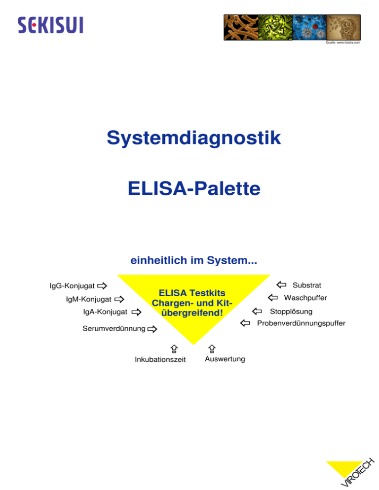 Quelle: www.fotolia.com Systemdiagnostik ELISA-Palette einheitlich im System... IgG-Konjugat IgM-Konjugat IgA-Konjugat Serumverdünnung ELISA Testkits Chargen- und Kitübergreifend! Inkubationszeit Substrat Waschpuffer Stopplösung Probenverdünnungspuffer Auswertung Virotech ELISA Produktpalette auf einen Blick Die Virotech ELISA Produktpalette umfasst >40 CE gekennzeichnete ELISA Testsysteme für qualitative und quantitative Ergebnisse für wichtige Parameter der Infektionsserologie. Sie dienen der Diagnostik von spezifischen IgG - , IgM - und IgA – Antikörpern in Humanserum. Folgende Nachweise stehen Ihnen zur Verfügung: Mykosen Panel Candida IgG/IgM/IgA Zecken Panel Borrelia afzelii + VlsE IgG FSME IgG/IgM VlsE IgG Impfschutztiter Diphtherie IgG Tetanus IgG Herpes Panel CMV IgG/IgM HSV 1 (gG1) IgG/IgM HSV 2 (gG2) IgG/IgM HSV Screen IgG/IgM EBV EBNA IgG EBV VCA IgG/IgM EBV Early IgG EBV Screen IgG/IgM VZV IgG/IgM/IgA Respiratorisches Panel Adenovirus IgG/IgM/IgA Bordetella pertussis IgG/IgA Pertussis Toxin IgM Influenza A IgG/IgM/IgA Pandemic New Influenza A IgG/IgA Influenza B IgG/IgM/IgA Mycoplasma pneumoniae IgG/IgM/IgA Parainfluenza 1 bis 3 IgG/IgM/IgA Parascreen IgG/IgM/IgA RSV IgG/IgM/IgA Spezial Panel Brucella IgG/IgM Enterovirus IgG/IgM/IgA Helicobacter pylori IgG/IgA Masern IgG/IgM Mumps IgG/IgM Yersinia enterocolitica IgG/IgA Treponema pallidum Screen (polyvalent) Validierungskit Diagnostik mit System Das Virotech System bietet ein hohes Maß an Flexibilität durch die Möglichkeit, Verdünnungs- und Waschpuffer, TMB, Citrat-Stopplösung sowie Konjugate parameterübergreifend einzusetzen. Alle Teste zeichnen sich durch folgende Merkmale aus DIN konformes Testdesign Einheitliches, anwenderfreundliches Protokoll Einheitliche Serenverdünnung Einheitliche Auswertung über gebrauchsfertige Cut-off Kontrollen Gebrauchsfertige Kontrollen, Konjugate und Substrate Konjugate und Kontrollen nach Antikörperklasse durch verschiedene Deckelfarben optisch unterscheidbar Mikrotiterplatten parameterspezifisch farbcodiert Mikrotiterplatten mit brechbaren Kavitäten Gleiche Inkubationszeiten (30`/30`/30`) Einheitliche Graubereiche 9VE – 11VE Für alle ELISA Prozessoren geeignet Bedienerfreundliche Software Auswertung nach der neuen RiliBÄK möglich Packungsinhalte Quantitative ELISA Testkits 12 brechbare, farbcodierte Mikrotiterstreifen Verdünnungspuffer, Waschlösung Kontrollen sowie 6 Standards zum Erstellen einer Standardkurve Anti-Human-Konjugat IgG Substratlösung, Stopplösung Testprotokollblatt Qualitative ELISA Testkits 12 brechbare, farbcodierte Mikrotiterstreifen Verdünnungspuffer, Waschlösung Kontrollen: negativ, cut-off, positiv, IgG, IgM, IgA je nach Testformat Anti-Human-Konjugate IgG, IgM, IgA je nach Testformat Substratlösung, Stopplösung Testprotokollblatt Alle Kontrollen als Sets ebenfalls nachlieferbar! Auch alle anderen Komponenten können einzeln bestellt werden. Liquor Diagnostik Wir können Ihnen in der Infektionsserologie eine umfangreiche Liquorpalette zur Bestimmung von spezifischen Antikörpern in Serum und Liquor anbieten. Unsere LiquorELISA-Testsysteme sind seit vielen Jahren im Markt und in der Routinediagnostik bewährt. Dank der langjährigen Zusammenarbeit mit Liquorspezialisten konnten wir eine umfangreiche Evaluierung mit über 100 Liquor-Serum-Paaren verschiedenster neurologischer Krankheitsbilder durchführen. Auch die Liquor ELISAs können im bekannten Virotechsystem abgearbeitet werden. Mit Hilfe einer gemessenen Kurve über 4 Standards oder einer vorgegebenen festen Standardkurve können die für die Antikörperindex-Berechnung erforderlichen Quotienten aus Liquor- und Serumantikörpern bestimmt werden. Die Antikörperindexbestimmung erfolgt nach Reiber. Durch die geeignete Wahl des Verdünnungsverhältnisses von Liquor und Serum können Matrixeffekte annähernd eliminiert werden. Vorteile der Virotech Liquor Diagnostik Brechbare, farbcodierte Mikrotiterplatten Einheitliche und anwenderfreundliche Serum- bzw. Liquorverdünnung Übergreifende Konjugate, Substrate, Stopplösungen Gebrauchsfertige Reagenzien (Ausnahme: Waschlösung) Parallele Abarbeitung von Liquordiagnostik und Serologie auf einer Platte Gemessene Standardkurve aus 4 Standards oder feste Standardkurve Für alle Prozessoren geeignete bedienerfreundliche Auswertesoftware Hohe Präzision und Richtigkeit ausgewiesen in Ringversuchen Liquor Standards Borrelia afzelii + VlsE CMV EBV FSME HSV 1 (gG1) HSV 2 (gG2) HSV Screen Influenza B (nur feste Kurve) Masern Mumps VZV Rubella Antikörperindexkontrolle Überprüfung der Richtigkeit und Präzision Ihrer AI-Bestimmung Qualitätskontrolle in der täglichen Liquor Routinediagnostik Liquor/Serum-Kontrollpaar für den Normalbereich (AI <1,5) Liquor/Serum-Kontrollpaar für den pathologischen Bereich (AI >1,5) Special Features Borrelia afzelii + VlsE IgG PKo Stamm (europäischer B.afzelii Stamm), B. garinii Stamm PBr und B. burgdorferi Stamm ZS7 Zusätzlich: In vivo exprimiertes Antigen VlsE zur Sensitivitätssteigerung bei frühen Borreliosen im IgG Virotech Borrelia Europe LINE und Borrelia in vivo LINE Immuno Assay verfügbar, auch für die Liquordiagnostik Borrelia afzelii IgM PKo Stamm (europäischer B.afzelii Stamm), B. garinii Stamm PBr und B. burgdorferi Stamm ZS7 Hohe Sensitivität durch einen stark OspC-exprimierenden Borrelia afzelii Stamm PKo Virotech Borrelien Europe LINE und Borrelia in vivo LINE Immuno Assay verfügbar, auch für die Liquordiagnostik Diphtherie & Tetanus Überprüfung des Impfstatus und Impferfolges – regelmäßiger Abgleich mit WHO Standard quantitative Bestimmung in IU/ml (WHO-Std.) über 4PL-Methode möglich EBV EBV Screen, EBV EA-D, EBV EBNA 1, EBV VCA IgG, EBV VCA IgM gp 125 Diagnostischer Faktor für eine klare Unterscheidung von Primärinfektion und abgelaufener Infektion, wenn EBNA 1 IgG und VCA IgM positiv sind Virotech EBV LINE Immuno Assay vorhanden; Doppel-Cut-Off Strategie zur EBNA 1 Beurteilun