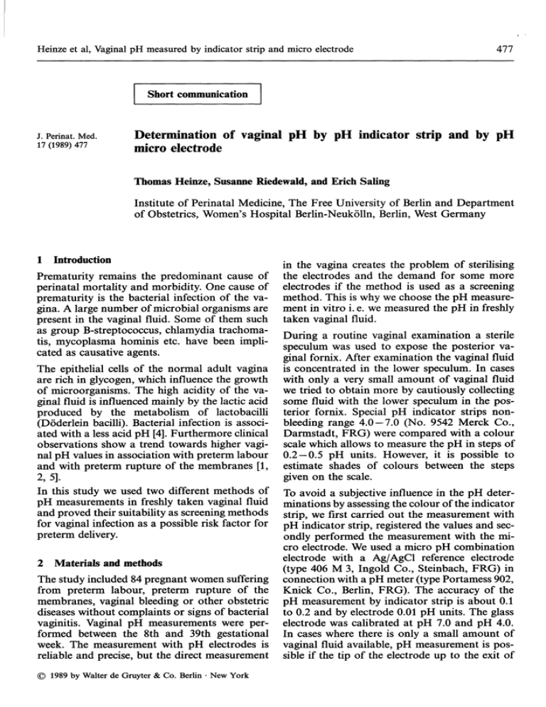 Heinze et al, Vaginal pH measured by indicator strip and micro electrode 477 Short communication J. Perinat. Med. 17 (1989) 477 Determination of vaginal pH by pH indicator strip and by pH micro electrode Thomas Heinze, Susanne Riedewald, and Erich Saling Institute of Perinatal Medicine, The Free University of Berlin and Department of Obstetrics, Women's Hospital Berlin-Neukölln, Berlin, West Germany 1 Introduction Prematurity remains the predominant cause of perinatal mortality and morbidity. One cause of prematurity is the bacterial infection of the vagina. A large number of microbial organisms are present in the vaginal fluid. Some of them such as group B-streptococcus, chlamydia trachomatis, mycoplasma hominis etc. have been implicated as causative agents. The epithelial cells of the normal adult vagina are rich in glycogen, which influence the growth of microorganisms. The high acidity of the vaginal fluid is influenced mainly by the lactic acid produced by the metabolism of lactobacilli (Döderlein bacilli). Bacterial infection is associated with a less acid pH [4]. Furthermore clinical observations show a trend towards higher vaginal pH values in association with preterm labour and with preterm rupture of the membranes [1, 2,5]. In this study we used two different methods of pH measurements in freshly taken vaginal fluid and proved their suitability as screening methods for vaginal infection as a possible risk factor for preterm delivery. 2 Materials and methods The study included 84 pregnant women suffering from preterm labour, preterm rupture of the membranes, vaginal bleeding or other obstetric diseases without complaints or signs of bacterial vaginitis. Vaginal pH measurements were performed between the 8th and 39th gestational week. The measurement with pH electrodes is reliable and precise, but the direct measurement 1989 by Walter de Gruyter & Co. Berlin · New York in the vagina creates the problem of sterilising the electrodes and the demand for some more electrodes if the method is used as a screening method. This is why we choose the pH measurement in vitro i. e. we measured the pH in freshly taken vaginal fluid. During a routine vaginal examination a sterile speculum was used to expose the posterior vaginal fornix. After examination the vaginal fluid is concentrated in the lower speculum. In cases with only a very small amount of vaginal fluid we tried to obtain more by cautiously collecting some fluid with the lower speculum in the posterior fornix. Special pH indicator strips nonbleeding range 4.0-7.0 (No. 9542 Merck Co., Darmstadt, FRG) were compared with a colour scale which allows to measure the pH in steps of 0.2 — 0.5 pH units. However, it is possible to estimate shades of colours between the steps given on the scale. To avoid a subjective influence in the pH determinations by assessing the colour of the indicator strip, we first carried out the measurement with pH indicator strip, registered the values and secondly performed the measurement with the micro electrode. We used a micro pH combination electrode with a Ag/AgCl reference electrode (type 406 M 3, Ingold Co., Steinbach, FRG) in connection with a pH meter (type Portamess 902, Knick Co., Berlin, FRG). The accuracy of the pH measurement by indicator strip is about 0.1 to 0.2 and by electrode 0.01 pH units. The glass electrode was calibrated at pH 7.0 and pH 4.O. In cases where there is only a small amount of vaginal fluid available, pH measurement is possible if the tip of the electrode up to the exit of 478 Heinze et al, Vaginal pH measured by indicator strip and micro electrode the reference electrode is completely covered by a film of the vaginal fluid. A minimum of 50 — 100 μΐ (i.e. 1—2 drops) is required for the pH measurement with indicator strip on its own, when performing both methods, we need 200 — 300 μΐ vaginal fluid. In a very small number of cases we failed in getting enough vaginal smear for both determinations or the measurement was prohibited by vaginal bleeding. 3 7-, 6- 5- y = 0.994 χ + 0.036 r = 0.9633 £ ι Results and discussion The figure shows the results of 84 measurements of pH values by both methods. We received a highly significant correlation between both methods (p = 0.0000) in the range from pH = 4.0 to 7.0. The pH measurement by the indicator strip we used is limited in the range from pH = 4.0 to 7.0. Values under pH = 4.0 show a normal vaginal flora and are not of further clinical interest. The advantages of the vaginal pH determination by indicator strip are: it is easy to handle and low in cost, requires a very small amount of vaginal fluid, excludes the risk of infection and needs no calibration. The disadvantage is the relatively low accuracy of the pH determination (0.1—0.2 pH units), caused by subjective interpretation of the colour of the indicator strip. The advantages of the micro glass electrode are: the good accuracy (0.01 pH units), no problems with subjective interpretation, the small amount of vaginal fluid (ca. 200 μΐ) needed and by performing the measurement in vitro no risk of infection either. pH indicator strip Figure 1. pH values determined by pH micro glass electrode compared to those by indicator strip. Linear regression and standard deviation. We recommend the pH determination of the vaginal fluid by indicator strip in combination with the micro glass electrode as a screening method for vaginal infection. Risks of preterm labour and preterm delivery increased when the vaginal pH is higher than 4.3 [5] resp. 4.4 [2] or 4.5 [3]. Therefore up to a pH value =4.3 it is sufficient to use indicator strips. In all cases with a possible risk of infection (pH values > 4.3) and in all cases where a precise determination of the pH value is needed, the micro electrode should be used. In cases where measurements are necessary at particular points of the vagina e. g. in case of preterm rupture of membranes a direct measurement inside the vagina with 