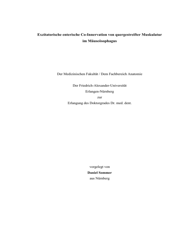 Exzitatorische enterische Co-Innervation von quergestreifter Muskulatur im Mäuseösophagus Der Medizinischen Fakultät / Dem Fachbereich Anatomie Der Friedrich-Alexander-Universität Erlangen-Nürnberg zur Erlangung des Doktorgrades Dr. med. dent. vorgelegt von Daniel Sommer aus Nürnberg 2 Als Dissertation genehmigt von der Medizinischen Fakultät / vom Fachbereich Anatomie der Friedrich-Alexander-Universität Erlangen-Nürnberg Tag der mündlichen Prüfung: 04.09.2013 Vorsitzender des Promotionsorgans: Prof. Dr. Jürgen Schüttler Gutachter: Prof. Dr. Jürgen Wörl Prof. Dr. Winfried Neuhuber 3 Inhaltsverzeichnis 1. 2. 3. Zusammenfassung 1.1. Hintergrund und Ziele 1.2. Methoden 1.3. Ergebnisse und Beobachtungen 4 4 4 5 1.4. Praktische Schlussfolgerungen 5 Summary 2.1. Background and aims 6 6 2.2. Methods 2.3. Results and observations 2.4. Practical conclusions 6 7 7 Einleitung 3.1. Aufbau und Funktion des Ösophagus 3.2. Die enterische Co-Innervation der quergestreiften Ösophagusmuskulatur 8 8 9 3.3. Tachykinine im Gastrointestinaltrakt 3.4. Ziele der Arbeit 9 11 Methoden 12 4.1. Gewebe, Präparation und Fixation 4.2. Kryostatschnitte und Immunzytochemie 4.3. Mikroskopie 12 12 15 Ergebnisse 16 5.1. Motorische Endplatten: enterische Co-Innervation und Co-Innervationsrate 5.2. Myenterische Neurone 16 20 5.3. Hirnstamm 20 6. Diskussion 22 7. Literaturverzeichnis 25 8. Danksagung 29 9. Lebenslauf 30 4. 5. 4 1. Zusammenfassung 1.1. Hintergrund und Ziele Quergestreifte Muskelzellen im Ösophagus werden zum einen von vagalen, cholinergen Nervenfasern aus dem Hirnstamm und zum anderen von enterischen Nervenfasern aus dem Plexus myentericus innerviert. Bisher wurden in den enterischen, coinnervierenden Nervenfasern morphologisch Neuropeptide nachgewiesen, die im restlichen glattmuskulären Verdauungstrakt vor allem eine hemmende Funktion ausüben. Erste funktionelle Untersuchungen mit ausgewählten Neuropeptiden an Invitro-Präparationen bestätigten diese Wirkung auf die vagal-induzierte Kontraktion der quergestreiften Ösophagusmuskulatur. Typischerweise kommen im glattmuskulären Verdauungstrakt auch exzitatorische Neurone vor, die oft Tachykinine als Transmitter benutzen. Eine Beteiligung dieser exzitatorischen Neurone an der enterischen CoInnervation von motorischen Endplatten im Ösophagus ist nicht geklärt. Ziel der vorliegenden Untersuchung war der morphologische Nachweis von enterischen tachykinergen, co-innervierenden Nervenfasern an motorischen Endplatten im Mäuseösophagus, um einen möglichen exzitatorischen Einfluss von enterischen Neuronen auf die Ösophagusperistaltik einschätzen zu können. 1.2. Methoden Die Untersuchung wurde an adulten C57/Bl6 Mäusen beider Geschlechter durchgeführt, denen nach Perfusionsfixierung mit Formaldhydlösung die Speiseröhre und der Hirnstamm entnommen wurden. Der Ösophagus wurde in vier gleich große Stücke unterteilt, die in etwa dem zervikalen, oberen und unteren thorakalen und abdominalen Ösophagusabschnitt entsprachen. Kryostatschnitte des Ösophagus und des Hirnstamms wurden für immunhistochemische Mehrfachfärbungen aufgearbeitet. Substanz P und Neurokinin A wurden zur Charakterisierung von tachykinergen, exzitatorischen, enterischen Neuronen, der vesikuläre Azetylcholintransporter (VAChT) zur Markierung von cholinergen Neuronen im Plexus myentericus und im Hirnstamm und von cholinergen Endigungen an motorischen Endplatten und α-Bungarotoxin (α-BT) zur Markierung von motorischen Endplatten im Ösophagus verwendet. Die 5 immunzytochemischen Färbungen wurden qualitativ und quantitativ mit konventioneller und konfokaler Laserscanning-Mikroskopie ausgewertet. 1.3. Ergebnisse und Beobachtungen Sowohl Substanz P- als auch Neurokinin A-positive Nervenendigungen konnten an vagal-innervierten, motorischen Endplatten im Mäuseösophagus nachgewiesen werden. Die durchschnittliche enterische Co-Innervationsrate lag bei Substanz P bei ca. sieben Prozent und bei Neurokinin A bei ca. drei Prozent. Substanz P bzw. Neurokinin A waren teilweise mit VAChT in eher kleinen Endigungen an der motorischen Endplatte co-lokalisiert, die immer von großen VAChT-immunreaktiven und Substanz P- bzw. Neurokinin A-negativen Endigungen getrennt waren. Co-Lokalisation von Substanz P bzw. Neurokinin A und VAChT war auch in wenigen myenterischen Neuronen nachweisbar. Hirnstammuntersuchungen zeigten, dass in der kompakten Formation des Nucleus ambiguus Neurone vorkamen, die immunreaktiv für VAChT, aber negativ für Substanz P und Neurokinin A waren. 1.4. Praktische Schlussfolgerungen In der quergestreiften Ösophagusmuskulatur der Maus existiert neben einer inhibitorischen eine schwach ausgeprägte cholinerge und tachykinerge, enterische CoInnervation. Das Vorhandensein dieser vermutlich exzitatorischen, enterischen Innervationskomponente im Ösophagus deutet an, dass die Innervationsprinzipien der glattmuskulären Verdauungsabschnitte auch im quergestreiften Ösophagusabschnitt existieren, allerdings in modifizierter Form. Der exzitatorische, periphere Anteil dürfte gegenüber der dominierenden exzitatorischen, vagalen Innervation aus dem Nucleus ambiguus an der motorischen Endplatte eine eher untergeordnete Rolle spielen. 6 2. Summary 2.1. Background and aims Striated muscle fibers in the esophagus receive a dual innervation both from vagal cholinergic nerve fibers originating in the brain stem and enteric nerve fibers originating in myenteric neurons. Until now neuropeptides were detected in the enteric coinnervating nerve fibers by morphological approaches, which are typical for inhibitory neurons in the smooth muscle of the digestive system. Functional studies of selected neuropeptides in in vitro preparations confirmed this effect on the vagally induced contraction of striated esophageal muscle. In the smooth muscle of the digestive tract also excitatory neurons are typically present, which often use tachykinins as transmitters. The participation of these