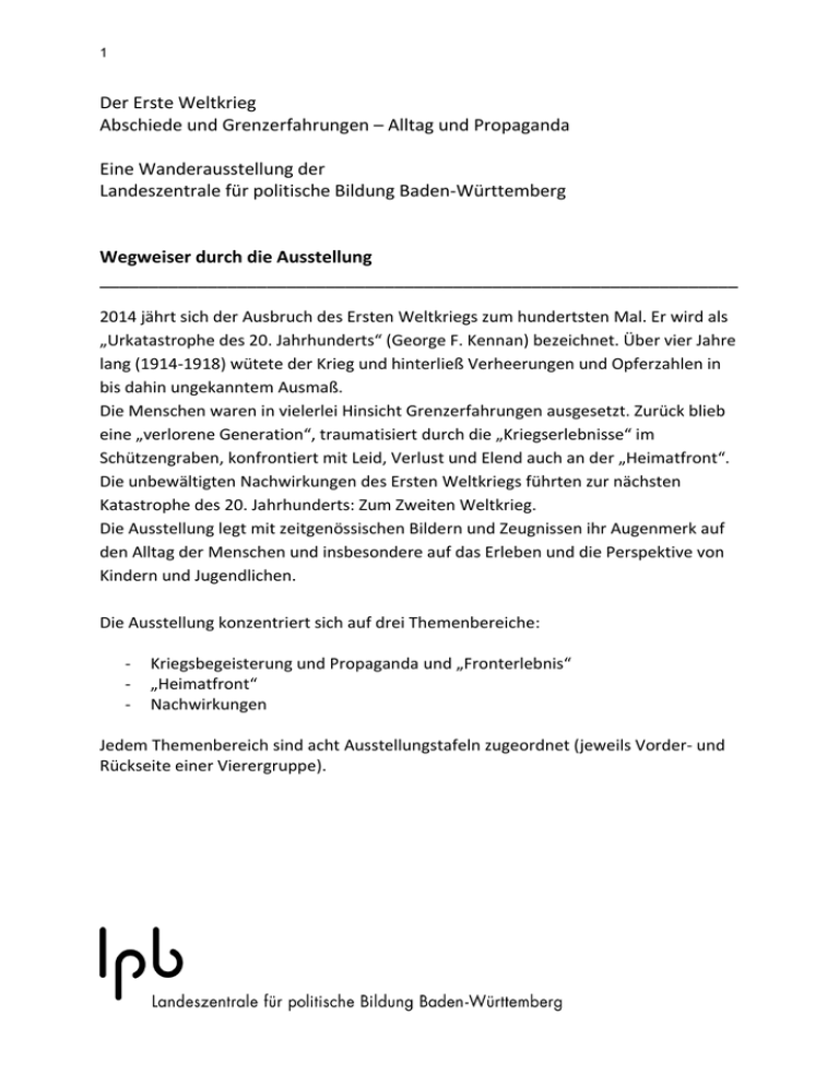 1 Der Erste Weltkrieg Abschiede und Grenzerfahrungen – Alltag und Propaganda Eine Wanderausstellung der Landeszentrale für politische Bildung Baden-Württemberg Wegweiser durch die Ausstellung _________________________________________________________________ 2014 jährt sich der Ausbruch des Ersten Weltkriegs zum hundertsten Mal. Er wird als „Urkatastrophe des 20. Jahrhunderts“ (George F. Kennan) bezeichnet. Über vier Jahre lang (1914-1918) wütete der Krieg und hinterließ Verheerungen und Opferzahlen in bis dahin ungekanntem Ausmaß. Die Menschen waren in vielerlei Hinsicht Grenzerfahrungen ausgesetzt. Zurück blieb eine „verlorene Generation“, traumatisiert durch die „Kriegserlebnisse“ im Schützengraben, konfrontiert mit Leid, Verlust und Elend auch an der „Heimatfront“. Die unbewältigten Nachwirkungen des Ersten Weltkriegs führten zur nächsten Katastrophe des 20. Jahrhunderts: Zum Zweiten Weltkrieg. Die Ausstellung legt mit zeitgenössischen Bildern und Zeugnissen ihr Augenmerk auf den Alltag der Menschen und insbesondere auf das Erleben und die Perspektive von Kindern und Jugendlichen. Die Ausstellung konzentriert sich auf drei Themenbereiche: - Kriegsbegeisterung und Propaganda und „Fronterlebnis“ „Heimatfront“ Nachwirkungen Jedem Themenbereich sind acht Ausstellungstafeln zugeordnet (jeweils Vorder- und Rückseite einer Vierergruppe). 2 Teil 1 Kriegsbegeisterung und Propaganda _________________________________________________________________ Tafel 1 „Lebenslauf eines Gefallenen“ Fritz Blum aus Mannheim (1897-1918), als Abiturient und kurz vor seinem Tod an der Front. Bilder: Stadtarchiv Mannheim Erläuterungen Der Lebenslauf von Fritz Blum steht exemplarisch für die Schrecken der Kriegserfahrungen. Die Porträts von Fritz Blum, die ihn von Kindheit an bis kurz vor seinem Tod an der Front zeigen, sowie ein Briefauszug erzählen von der Zerstörung eines jungen Menschen. Weiterführend zur Lebensgeschichte von Fritz Blum: http://www.schulebw.de/unterricht/faecheruebergreifende_themen/landeskunde/modelle/epochen/zeitgeschichte/weltkrieg1/ mannheim/ _________________________________________________________________________________ Tafel 2 Kriegsbegeisterung und Propaganda Einführung Den Kriegserklärungen am 1. August 1914 an Russland und am 3. August 1914 an Frankreich durch den deutschen Kaiser Wilhelm II. ging eine explosive Mischung aus Nationalismus, Großmachtphantasien, Bedrohungsszenarien und Wettrüsten voraus. Der Einfluss des Militärs im deutschen Kaiserreich war übermächtig. Die Ermordung des österreichischen Thronfolgers Erzherzog Franz Ferdinand und seiner Frau war der Auslöser eines Krieges, der 3 von der militärischen Propaganda als aufgezwungen und unvermeidlich dargestellt wurde. Deutschland stehe vor einem Verteidigungskrieg. Die Propaganda zeigte Wirkung: Aus einem Gefühl nationaler Bedrohung heraus reagierten viele, vor allem das kaisertreue Bürgertum in den größeren Städten mit patriotischer Begeisterung und Hurrageschrei. Protest, Skepsis und Ängste mischten sich vor allem aus der Arbeiterbewegung in die vermeintlich allgemeine Begeisterung. Noch Ende Juli 1914 wurde auf großen Versammlungen gegen die Kriegstreiberei protestiert und vor einem Krieg gewarnt, der Abermillionen Tote fordern werde. Erläuterungen Die Vorkriegssituation wird mit zwei Bildern dargestellt, die beispielhaft Ursachen für den Ausbruch des Krieges markieren: Das Bild mit einer Schulklasse in Matrosenanzügen steht für das Wett- und Aufrüsten, die „Flottenbegeisterung“ und den Militarismus im Kaiserreich. Das Sammelbild „Unser lieber Kaiser“ und das Zitat von Ernst Toller weisen auf den unkritischen Kaiserkult hin. Die Karte und das Bild aus dem Kinderbuch bilden das Machtgefüge und die Kriegsgegner, die Mittelmächte und ihre Verbündeten sowie die Entente ab ___________________________________________________________________________ Tafel 3 und 4 Der Krieg beginnt Abschiedsfoto: Hermann Baier aus Kirchheim mit seiner Familie 1914, Bild: Europeana Bild: Bibliothek für Zeitgeschichte Stuttgart Erläuterungen Auf Tafel 3 werden verschiedene Aspekte des Kriegsbeginns angesprochen: Mobilmachung, Propaganda, „Kriegsfreiwillige“ und „Augusterlebnis“, Patriotismus und Abschied. Tafel 4 zeigt auch die Angst und Skepsis. Die Haltungen zum Krieg, zum einen der Jubel im städtischen Bürgertum (vgl. Zitat Freiburger Zeitung), zum anderen der Protest in der Arbeiterbewegung (vgl. Zitat Sozialdemokratisches Volksblatt), weisen auf die sozialen und politischen Spaltungen im Kaiserreich hin. 4 Der Burgfrieden: kriegsbedingt sollten mit der Burgfriedenspolitik die gesellschaftlichen und politischen Gegensätze überdeckt und nationale Einigkeit demonstriert werden. Exemplarisch drückt das das Propagandaplakat „Der Kaiser rief und Alle, Alle kamen!“ aus. ___________________________________________________________________________ Tafel 5 Grenzerfahrungen – Zwischen den Fronten Einführung Am 2. und 3. August 1914 marschierten deutsche Truppen in Luxemburg ein und besetzten einen Tag später das neutrale Belgien. Das Deutsche Reich erklärte Frankreich den Krieg. Als Garantiemacht der Neutralität Belgiens trat am 4. August Großbritannien in den Krieg ein. Die deutschen Truppen folgten dem Schlieffenplan, der einen raschen Durchmarsch nach Westen vorsah. Mit einem schnellen Sieg sollte ein Zweifrontenkrieg – an der West- und an der Ostfront – vermieden werden. An der Marne, zwischen Verdun und Paris, unternahmen britische und französische Truppen einen überraschenden Gegenangriff. Die Marneschlacht ging verloren, die deutschen Truppen mussten sich zurückziehen. Der Bewegungskrieg verharrte von nun an in den Schützengräben, in einem verlustreichen und zermürbenden Stellungskrieg. Das deutsche Reich befand sich zwischen zwei Fronten. Bild: Bibliothek für Zeitgeschichte Erläuterungen Die Tafel nimmt das Frontgeschehen in 