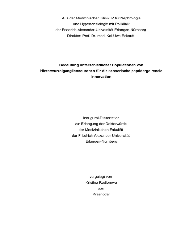 Aus der Medizinischen Klinik IV für Nephrologie und Hypertensiologie mit Poliklinik der Friedrich-Alexander-Universität Erlangen-Nürnberg Direktor: Prof. Dr. med. Kai-Uwe Eckardt Bedeutung unterschiedlicher Populationen von Hinterwurzelganglienneuronen für die sensorische peptiderge renale Innervation Inaugural-Dissertation zur Erlangung der Doktorwürde der Medizinischen Fakultät der Friedrich-Alexander-Universität Erlangen-Nürnberg vorgelegt von Kristina Rodionova aus Krasnodar Gedruckt mit Erlaubnis der Medizinischen Fakultät der Friedrich-Alexander-Universität Erlangen-Nürnberg Dekan: Prof. Dr. Jürgen Schüttler Referent: Prof. Dr. Roland Veelken Koreferent: Prof. Dr. Karl Hilgers Tag der mündlichen Prüfung: 22. November 2012 III Für meine Eltern und Sebastian in Liebe IV Inhaltsverzeichnis A.1. Summary 1 A.1.1. Background 1 A.1.2. Methods 1 A.1.3. Results and observations 1 A.1.4. Conclusion 2 A.2. Zusammenfassung 3 A.2.1. Hintergrund und Ziele 3 A.2.2. Methoden 3 A.2.3. Ergebnisse und Beobachtungen 3 A.2.4. Praktische Schlussfolgerungen 4 B. Einleitung 5 B.1. Therapieresistente Hypertonie und Innervation der Niere 5 B.2. Innervation der Niere - Bedeutung peptiderger renaler Afferenzen 5 B.3. Calcitonin Gene-Related Peptide (CGRP) und Transient Receptor Potential Vanilloid Typ 1 Kanal (TRPV1) 6 B.4. Gewebeazidose und Acid-Sensing Ion Channel (ASIC) 7 B.5. Auswahl des experimentellen Modells 8 B.6. Hypothese 9 C. Material und Methoden 10 V C.1. Tiermodelle 10 C.2. Präparation und Gewinnung der Nervenzellen 10 C.2.1. Fluoreszenzfärbung der Neurone 10 C.2.2. Farbstoffmarkierung von DRG – Neuronen mit renalen Projektionen 11 C.2.3. Postoperativer Verlauf 11 C.2.4. Gewebsdissoziation 12 C.3. Patch – Clamp Technik 14 C.3.1.Versuchsaufbau 14 C.3.2. Messprozess 16 C.3.2.1. Cell-Attached Mode 16 C.3.2.2. Whole-Cell Mode 18 C.3.3. Messprotokoll 19 C.3.3.1. Voltage-Clamp-Modus 19 C.3.3.2. Current-Clamp-Modus 20 C.3.3.2.1. Injektion depolarisierender Ströme steigender Intensität 20 C.3.3.2.2. Säureapplikation vom pH-Wert 6 und 5 20 C.4. Auswertung der Ergebnisse D. Ergebnisse 21 22 D.1. Gefärbte Zellen in situ und in der Zellkultur 22 D.2. Messergebnisse 22 D.2.1. Ionenströme phasischer und tonischer Neuronenpopulationen 22 D.2.1.1. Kaliumaktivierung 24 D.2.1.2. Natriumaktivierung und Natriuminaktivierung 24 D.2.1.3. Gesamtpopulation phasischer und tonischer Neuronen 26 D.2.1.4. Gesamtpopulation renaler und nicht renaler Neuronen 26 D.2.1.4.1. Ionenströme phasischer Neuronen 26 D.2.1.4.2. Ionenströme tonischer Neuronen 27 D.2.1.5. Gesamtpopulation renaler Neuronen 27 D.2.2. Erregungsmuster der Neurone im Current-Clamp-Modus 28 D.2.3. Säuresensitivität im Current-Clamp-Modus 30 VI E. Diskussion 34 E.1. Innervation der Niere 34 E.2. Anfärbung der renalen Neuronen und Herstellung der Zellkultur 35 E.3. Patch-Clamp-Verfahren 36 E.3.1. Voltage-Clamp-Messungen 36 E.3.1.1. Spannungsabhängige Kaliumströme und Kaliumkanäle 37 E.3.1.2. Spannungsabhängige Natriumkanäle 38 E.3.2. Current-Clamp-Messungen 40 E.3.2.1. Feuerungsmuster und deren Modulation 40 E.3.2.2. Säuresensitivität im Current-Clamp-Modus 42 E.3.2.3. Säuresensitivität bei oxidativem Stress 45 E.3.2.4. TRPV1-Rezeptoren bei Nierenerkrankungen 46 E.4. Ausblick 47 F. Abkürzungsverzeichnis 48 G. Anhang 49 G.1. Substanzen und Lösungen für die Zellkultur 49 G.2. Substanzen und Lösungen für die Patch-Clamp Messreihen 50 Whole-cell 50 H. Danksagung 51 I. Literaturverzeichnis 52 1 A.1. Summary A.1.1. Background Peptidergic afferent renal nerves (PARN) have been linked to kidney damage in hypertension and nephritis. Neither the receptors nor the signals controlling local release of neurokinines calcitonin gene-related peptide (CGRP) and substance P (SP) and signal transmission to the brain are well-understood. We tested the hypothesis that PARN, compared with nonrenal afferents (Non-RN), are more sensitive to acidic stimulation via transient receptor potential vanilloid type 1 (TRPV1) channels and exhibit a distinctive firing pattern, which is based on the presence of voltage-gated channels with different characteristics. A.1.2. Methods Altogether, 180 neurons were studied, harvested from 12 male Sprague-Dawley rats. PARN were distinguished from Non-RN by fluorescent labelling with inert, lipophilic dye (DiI), which was placed under the renal capsule. By retrograde axonal transport of the dye, neurons could be allocated to the projection places of their dendrites. After six days, the primary cell culture of labelled neurons from dorsal root ganglia (DRG; Th11L3) was available for in-vitro patch-clamp experiments in a whole-cell mode. First of all, fast voltage-gated potassium and sodium channels, which are specific for neurons, were tested with respect to their activation and inactivation voltages, peak voltage and the overall sodium influx at the patch-clamp setting. In the second step, firing behaviour and acid sensitivity were investigated using current-clamp mode. Firing patterns due to current injection as well as generation of action potentials due to acid superfusion were determined in order to classify neurons. For this purpose, pH 5 and pH 6 were used as acid stimuli. A.1.3. Results and observations The fluorescent staining of neurons was successfully attained. According to the origin of their dendrites and to their capacity, neurons could be divided into six groups. Phasic small and medium-sized neurons showed significantly higher potassium currents than tonic ones. Furthermore, activation of sodium channels in small and medium-sized phasic cells occurred at 10 mV more negative voltage values than in tonic cells. However, both effects lacked statistical significance in large-sized neurons. The comparison of all stained, i.e. renal neurons, revealed that sodium currents in phasic neurons were also activated at 10 mV lower voltage values than in tonic ones. Forty-eight percent of PARN were classified 