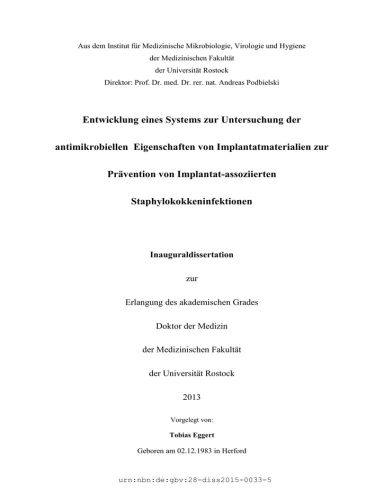 Aus dem Institut für Medizinische Mikrobiologie, Virologie und Hygiene der Medizinischen Fakultät der Universität Rostock Direktor: Prof. Dr. med. Dr. rer. nat. Andreas Podbielski Entwicklung eines Systems zur Untersuchung der antimikrobiellen Eigenschaften von Implantatmaterialien zur Prävention von Implantat-assoziierten Staphylokokkeninfektionen Inauguraldissertation zur Erlangung des akademischen Grades Doktor der Medizin der Medizinischen Fakultät der Universität Rostock 2013 Vorgelegt von: Tobias Eggert Geboren am 02.12.1983 in Herford urn:nbn:de:gbv:28-diss2015-0033-5 Dekan: Prof. Dr. med. Emil Christian Reisinger 1. Gutachter: Prof. Dr. med. Dr. rer. nat. Andreas Podbielski; Institut für Medizinische Mikrobiologie, Virologie und Hygiene; Universität Rostock 2. Gutachter: Prof. Dr. rer. nat. Hubert Bahl; Institut für Biowissenschaften/Mikrobiologie; Universität Rostock 3. Gutachter: Prof. Dr. med. Ivo Steinmetz; Friedrich Loeffler Institut für Medizinische Mikrobiologie; Universität Greifswald Datum der Einreichung: 20.09.2013 Datum der Verteidigung: 13.01.2015 Inhaltsverzeichnis Inhaltsverzeichnis 1. Einleitung ............................................................................................................................... 1 1.1. Implantat-assoziierte Infektionen .................................................................................... 1 1.1.1. Definition und epidemiologische Bedeutung............................................................ 1 1.1.2. Ätiologie und Pathogenese – Rolle der Staphylokokken .......................................... 3 1.1.3. Bedeutung der Biofilme ............................................................................................ 6 1.1.4. Strategien zur Prävention der Implantat-assoziierten Infektion ................................ 9 1.2. Kupfer – Spurenelement und antibakterielles Agens .................................................... 11 1.3. Fluorochrome – Anwendungsmöglichkeiten und Bedeutung ....................................... 13 1.4. Ziele der Arbeit und zentrale Fragestellungen .............................................................. 15 2. Material und Methoden ........................................................................................................ 16 2.1. Bakterienstämme ........................................................................................................... 16 2.2. Plasmide......................................................................................................................... 16 2.3. Primer ............................................................................................................................ 17 2.4. Nährmedien ................................................................................................................... 17 2.5. Medienzusätze ............................................................................................................... 18 2.5.1. Humanserum ........................................................................................................... 18 2.5.2. Kupfersulfat-Lösung ............................................................................................... 18 2.5.3. Antibiotika .............................................................................................................. 18 2.7. Testkörper ...................................................................................................................... 19 2.7.1. unbehandelte Testkörper ......................................................................................... 19 2.7.2. Beschichtungen und Oberflächenmodifizierungen ................................................. 20 2.7.2.1. Plasma-Immersions-Ionenimplantation (nach Mändel und Rauschenbach, 2000).............................................................................................................................. 20 2.7.2.2. Niederdruckplasma-Polymerisation (nach Finke et al., 2007; Schröder et al., 2010).............................................................................................................................. 21 2.8. Chemikalien, Enzyme und Kits ..................................................................................... 21 2.9. Geräte und Software ...................................................................................................... 23 2.10. Stammhaltung .............................................................................................................. 24 2.11. Messung der optischen Dichte – Wachstumskurven ................................................... 25 2.12. Bestimmung der MHK von CuSO4 für S. aureus und S. epidermidis ........................ 25 2.12.1. Lebendkeimzahlbestimmung ................................................................................ 25 2.13. Untersuchung der Implantatoberflächen ..................................................................... 26 I Inhaltsverzeichnis 2.13.1. Protokoll zur Biofilmbildung auf Testkörpern ..................................................... 26 2.13.1.1. Bestimmung der planktonischen Bakterien .................................................... 26 2.13.1.2. Bestimmung der adhärenten Bakterien .......................................................... 26 2.13.1.3. Mikroskopie der Testkörper ........................................................................... 27 2.13.1.4. Untersuchung des Bakterienwachstums auf Testkörpern unter Zusatz von CuSO4 ............................................................................................................................ 27 2.13.2. Methoden zur Untersuchung der Testkörper ........................................................ 27 2.13.2.1. Fluoreszenzmikroskopie................................................................................. 27 2.13.2.2. Rasterelektronenmikroskopie ..............................