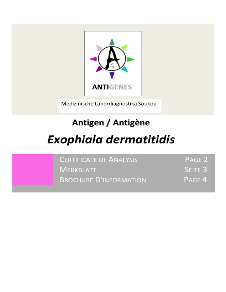 ANTIGENES Medizinische Labordiagnostika Soukou Antigen / Antigène Exophiala dermatitidis CERTIFICATE OF ANALYSIS MERKBLATT BROCHURE D'INFORMATION PAGE 2 SEITE 3 PAGE 4 ANTIGENES Certificate of Analysis Medizinische Labordiagnostika Soukou Hustadtring 151 44801 Bochum Germany (Please read carefully) Tel.: +49 234-91795580 Fax: +49 234-91795581 Email: [email protected] Homepage: www.antigenes.de Exophiala dermatitidis (antigen) Article no.: AEM6500 Lot no: Quantity: 1 mg Source American Type Culture Collection (ATCC) Raw materials mature conidiophores, spores and mycelia Condition of delivery lyophilisate Color gray to brown Texture powdery Additives sodium azide Date of manufacture December 2014 Date of expire December 2025 (frozen storage) Risk of infection: The antigen belongs to biohazards group 2. This product should be handled with care. No responsibility on the part of the manufacturer for any infection or contamination. Thermal inactivation. Application (only for in vitro diagnostics): This product is only for Research and Development. It must not be used as a remedy and not as an in vivo application. Foam or bubble development should be avoided. Any unused stock solution must then be divided into aliquots and frozen at -20°C. Repeated freezing and thawing is not recommended because of significant reduced antigen activity. Protein content: Determined for each new batch by using the Bradford assay. Molecular binding sites: Examined and documented by SDS-PAGE and Experion (BioRad). Storage: Keep container tightly closed and store at temperatures of at least -20°C. Bochum, 10.01.2016 verified by quality manager ______________ (signature) © ANTIGENES 2016 all rights reserved – www.antigenes.de – Ver. 01/2016 -- Page 2 ANTIGENES Merkblatt Medizinische Labordiagnostika Soukou Hustadtring 151 44801 Bochum (Bitte sorgfältig lesen) Tel.: +49 234-91795580 Fax: +49 234-91795581 Email: [email protected] Homepage: www.antigenes.de Exophiala dermatitidis (Antigen) Artikel-Nr.: AEM6500 Charge: Menge: 1 mg Bezugsquelle American Type Culture Collection (ATCC) Biol. Arbeitsstoffe reife Konidienträger, Sporen und Myzelien Zustand bei Lieferung Lyophilisat Farbe grau bis braun Konsistenz pulvrig Zusatzstoffe Natriumazid Herstellungsdatum Dezember 2014 Verfallsdatum Dezember 2025 (tiefgekühlt) Infektionsgefahr: Das Antigen gehört zur biologischen Arbeitsstoff Risikogruppe 2. Das Produkt ist mit Sorgfalt zu behandeln. Eine Verantwortung von Seiten des Herstellers für etwaige Infektion bzw. Kontamination ist ausgeschlossen. Thermische Inaktivierung. Anwendung (nur für in vitro Diagnostik): Das Produkt dient der Forschung und Entwicklung. Es ist nicht als Heilmittel und nicht als in vivo Anwendung geeignet. Schaum- oder Luftblasenentwicklung sollte möglichst vermieden werden. Nicht verbrauchte Stammlösung muss anschließend aliquotiert und bei -20°C eingefroren werden. Vor mehrfachem Einfrieren und Auftauen ist abzuraten, da dies die Antigenaktivität deutlich vermindert. Proteingehalt: Wird unter Verwendung des Bradford Assays bestimmt. Molekulare Bindungsstellen: Werden mittels SDS-PAGE und Experion (BioRad) überprüft. Lagerung: Behälter dicht verschlossen halten und bei einer Temperatur von mindestens -20°C aufbewahren. Bochum, den 10.01.2016 geprüft vom Qualitätsmanager ______________ (Unterschrift) © ANTIGENES 2016 all rights reserved – www.antigenes.de – Ver. 01/2016 -- Seite 3 Brochure d'information (À lire avec attention) ANTIGENES Medizinische Labordiagnostika Soukou Hustadtring 151 44801 Bochum Allemagne Tel.: +49 234-91795580 Fax: +49 234-91795581 Email: [email protected] Homepage: www.antigenes.de Exophiala dermatitidis (antigène) N° réf.: AEM6500 N° de lot: Quantité: 1 mg Origine American Type Culture Collection (ATCC) Matériel d'origine formes conidiospores matures, spores et mycélium Etat de la livraison fraction lyophilisée Coleur grise à brun Consistance poudreuse Additifs azide de sodium Date de production Décembre 2014 Date de péremption Décembre 2025 (congelé) Risque d'infection: l'antigène correspond au groupe 2 des risques biologiques. Le produit doit-être manipulé avec soin. Toute responsabilité de la part du fabricant pour toute infection ou de contamination est exclue. Inactivation thermique. Application (uniquement pour le diagnostic in-vitro): le produit sert à la recherche et au développement et non dans un procédé in-vivo pour un traitement thérapeutique de l'organisme humain ou animal. Le développement de bulles ou de mousse doit-être évité pendant la manipulation. L'antigène non utilisé doit ensuite être portionné puis congelé à -20°C. Evitez toute congélation ou décongélation répétée; ceci peut conduire à la réduction signifiante de l'activité de l'antigène. Teneur en protéine: Déterminée par la méthode de Bradford. Sites de liaison moléculaires: Examinés et documentés par SDS-PAGE et Experion (BioRad). Stockage: Gardez le flacon hermétiquement fermé et conservez-le á une température inférieure á -20°C. Bochum, le 10.janvier 2016 vérifié par le responsable de qualité ______________ (signature) © ANTIGENES 2016 all rights reserved – www.antigenes.de – Ver. 01/2016 -- Page 4