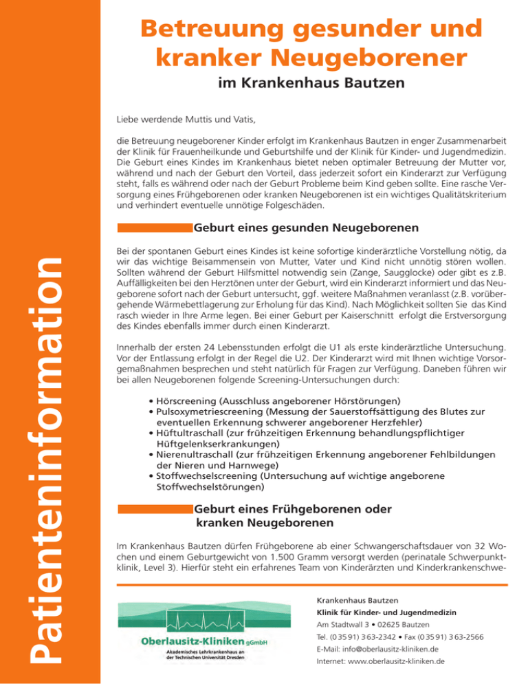 Betreuung gesunder und kranker Neugeborener im Krankenhaus Bautzen Liebe werdende Muttis und Vatis, die Betreuung neugeborener Kinder erfolgt im Krankenhaus Bautzen in enger Zusammenarbeit der Klinik für Frauenheilkunde und Geburtshilfe und der Klinik für Kinder- und Jugendmedizin. Die Geburt eines Kindes im Krankenhaus bietet neben optimaler Betreuung der Mutter vor, während und nach der Geburt den Vorteil, dass jederzeit sofort ein Kinderarzt zur Verfügung steht, falls es während oder nach der Geburt Probleme beim Kind geben sollte. Eine rasche Versorgung eines Frühgeborenen oder kranken Neugeborenen ist ein wichtiges Qualitätskriterium und verhindert eventuelle unnötige Folgeschäden. Patienteninformation Geburt eines gesunden Neugeborenen Bei der spontanen Geburt eines Kindes ist keine sofortige kinderärztliche Vorstellung nötig, da wir das wichtige Beisammensein von Mutter, Vater und Kind nicht unnötig stören wollen. Sollten während der Geburt Hilfsmittel notwendig sein (Zange, Saugglocke) oder gibt es z.B. Auffälligkeiten bei den Herztönen unter der Geburt, wird ein Kinderarzt informiert und das Neugeborene sofort nach der Geburt untersucht, ggf. weitere Maßnahmen veranlasst (z.B. vorübergehende Wärmebettlagerung zur Erholung für das Kind). Nach Möglichkeit sollten Sie das Kind rasch wieder in Ihre Arme legen. Bei einer Geburt per Kaiserschnitt erfolgt die Erstversorgung des Kindes ebenfalls immer durch einen Kinderarzt. Innerhalb der ersten 24 Lebensstunden erfolgt die U1 als erste kinderärztliche Untersuchung. Vor der Entlassung erfolgt in der Regel die U2. Der Kinderarzt wird mit Ihnen wichtige Vorsorgemaßnahmen besprechen und steht natürlich für Fragen zur Verfügung. Daneben führen wir bei allen Neugeborenen folgende Screening-Untersuchungen durch: • Hörscreening (Ausschluss angeborener Hörstörungen) • Pulsoxymetriescreening (Messung der Sauerstoffsättigung des Blutes zur eventuellen Erkennung schwerer angeborener Herzfehler) • Hüftultraschall (zur frühzeitigen Erkennung behandlungspflichtiger Hüftgelenkserkrankungen) • Nierenultraschall (zur frühzeitigen Erkennung angeborener Fehlbildungen der Nieren und Harnwege) • Stoffwechselscreening (Untersuchung auf wichtige angeborene Stoffwechselstörungen) Geburt eines Frühgeborenen oder kranken Neugeborenen Im Krankenhaus Bautzen dürfen Frühgeborene ab einer Schwangerschaftsdauer von 32 Wochen und einem Geburtgewicht von 1.500 Gramm versorgt werden (perinatale Schwerpunktklinik, Level 3). Hierfür steht ein erfahrenes Team von Kinderärzten und Kinderkrankenschwe- Krankenhaus Bautzen Klinik für Kinder- und Jugendmedizin Am Stadtwall 3 • 02625 Bautzen Tel. (0 35 91) 3 63-2342 • Fax (0 35 91) 3 63-2566 E-Mail: [email protected] Internet: www.oberlausitz-kliniken.de stern zur Verfügung. Unreifere Kinder oder Frühgeborene mit wesentlich geringerem Gewicht werden nach kompetenter Erstversorgung vor Ort an das Perinatalzentrum an der Universitätskinderklinik Dresden verlegt. Bei der Geburt eines Frühgeborenen und bei sich andeutenden oder nach der Geburt auftretenden Krankheitszeichen oder Risiken wird sofort ein Kinderarzt hinzugezogen, der weitere Maßnahmen festlegt. Je nach Krankheitsschwere und Reife des Kindes (Schwangerschaftsdauer) wird ggf. die Übernahme in den Frühgeborenenbereich der Klinik für Kinder- und Jugendmedizin, Station 25, notwendig. Hier bestehen alle Möglichkeiten der Intensivtherapie und Überwachung, so dass auch kleine Frühgeborene sicher und kompetent betreut werden können. Die Eltern haben jederzeit Zutritt zu ihrem Kind. Frühzeitiges Stillen bzw. zumindest Muttermilchfütterung wird unbedingt angestrebt. „Kuscheln“ mit dem Kind (Kängurutherapie) wird durchgeführt, sobald der Zustand des Kindes dies zulässt. Stillen und Säuglingsernährung Stillen ist die beste Ernährung für jedes Früh- und Neugeborene und wird von den Kliniken dringend unterstützt. Erfahrene Hebammen, Kinderkrankenschwestern und eine Stillberaterin stehen den Müttern hierbei zur Seite. Bei bestimmten Risiken (z.B. Diabetes der Mutter, Untergewicht des Neugeborenen) ist eine zusätzliche Fütterung auch vor Milcheinschuss notwendig, um Gefahren durch eine Unterzuckerung vorzubeugen. Hierzu wird Maltodextrin-Lösung verwendet, die weitgehend geschmacklos ist und späterem Stillen nicht im Wege steht. Wir besprechen in jedem Fall solche Zufütterung vorher mit Ihnen. Die Kliniken vermeiden jegliche Werbung für künstliche Babynahrung. Sollten Sie Informationsbedarf hierzu haben, sprechen Sie bitte unsere Mitarbeiter an. © Oberlausitz-Kliniken gGmbH 2012 Patienteninformation Bei längerem Aufenthalt eines Frühgeborenen auf der Station kann die Mutter als Begleitperson auf der Station oder in der Elternwohnung der Klinik mit aufgenommen werden. Die Kinderkrankenschwester und Ärzte begleiten Sie in dieser Zeit und stehen mit Rat und Hilfe zur Verfügung. Die Entlassung erfolgt in Absprache mit Ihnen, sobald dies für das Kind und für Sie gut und angemessen ist. Feste Gewichtsgrenzen gibt es dafür nicht.