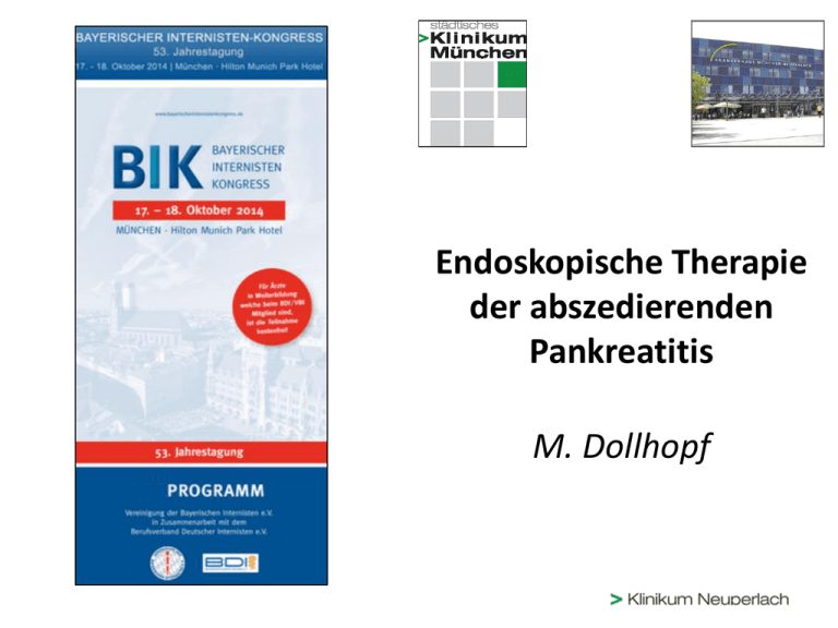 Endoskopische Therapie der abszedierenden Pankreatitis M. Dollhopf Akute Pankreatitis Ursachen 40% 36,70% 34,60% 30% 20% 13,30% 10% 4,30% 3,20% 2,70% 2,70% 1,10% 1,10% 0% PROST-Study Phillip V et al. Clin Gastroenterol Hepatol. 2011;19:995-1000 53. Bayerischer Internistenkongress München 18.10.2014 0,50% Akute Pankreatitis Inzidenz und Verläufe • Inzidenz der akuten Pankreatitis: 10 – 44/100.000 Einwohner • 85% interstitiell/ödematös/exsudativ 8,5 – 37,5/100.000 Einwohner • 15% nekrotisierend 1,5 – 8,5/100.000 Einwohner Yadav et al., Pancreas 2006; 33:323-330 Petrow MS et al., Gastroenterology 2010; 139:813-820 53. Bayerischer Internistenkongress München 18.10.2014 Classification of acute pancreatitis—2012: revision of the Atlanta classification Pankreatitis-Typ Interstitielle ödematöse Pankreatits Nekrotisierende Pankreatitis Interstitielle ödematöse Pankreatitis Nekrotisierende Pankreatitis Zeitlicher Verlauf <4 Wochen nach Beginn Art der Flüssigkeitsansammlung Infektion Akute peripankreatitische Flüssigkeitsansammlung (APFC) Steril Akute nekrotisierende Pankreatitis (ANC) Steril Pseudozyste (PPC) >4 Wochen nach Beginn Abgekapselte Nekrose (WOPN) Banks et al. Gut 2013; 62:102-11 53. Bayerischer Internistenkongress München 18.10.2014 Infiziert Infiziert Steril Infiziert Steril Infiziert Classification of acute pancreatitis—2012: revision of the Atlanta classification Pankreatitis-Typ Interstitielle ödematöse Pankreatits Nekrotisierende Pankreatitis Interstitielle ödematöse Pankreatitis Nekrotisierende Pankreatitis Zeitlicher Verlauf Art der Flüssigkeitsansammlung Infektion Akute peripankreatitische Flüssigkeitsansammlung (APFC) Steril <4 Wochen nach Beginn Akute infizierte Akutenekrotisierende nekrotisierendePankreatitis Infiziert Pankreatitis (ANC) Infiziert Infizierte Pseudozyste Pseudozyste (PPC) >4 Wochen nach Infizierte Beginn Nekrose Abgekapselte Nekrose (WOPN) Banks et al. Gut 2013; 62:102-11 53. Bayerischer Internistenkongress München 18.10.2014 Steril Steril Infiziert Steril Infiziert Akute nekrotisierende Pankreatitis Morbidität und Mortalität • Organversagen >48h: ~ bis 50% aller Pat. mit Nekrosen ~ bis 66% der Pat. mit infizierten Nekrosen/Abzessen • Mortaliät: ~ bis 15% aller Pat. mit Nekrosen ~ bis 30% der Pat. mit infizierten Nekrosen/Abszessen Hochrechnung: – 0,225 – 1,25/100.000 Einwohner – München (2012: 1,378 Mio. Einwohner) 3,1 – 17,6 Tote/Jahr Petrow MS et al., Gastroenterology 2010;139:813-820 53. Bayerischer Internistenkongress München 18.10.2014 Bakterielle Infektion von Nekrosen, Nekroseausmaß und Inzidenz des Organversagen bei nekrotisierender Pankreatitis Odds-Ratio Superinfektion Pankreasnekroseausmaß im CT 95% Konfidenzintervall Ja vs. nein 4,15 1,72 11,42 30-50% vs. ≤30% 1,78 0,83 4,01 ≥50% vs. 30-50% 4,84 1,39 22,65 Rünzi M, Beger H, Rau B, Isenmann R. Dtsch Arztebl 2002; 99(3): A-116 / B-97 / C-94 53. Bayerischer Internistenkongress München 18.10.2014 Bedeutung der bakteriellen Infektion bei nekrotisierender Pankreatitis bzgl. klinischem Verlauf Sterile Nekrosen (188 Pat.) Infizierte Nekrosen (85 Pat.) Anzahl % Anzahl % P Pulmonale Insuffizienz 109 58 62 73 0,021 Sepsis/SIRS 61 32 48 57 0,006 Koagulopathie 68 36 46 54 0,004 Niereninsuffizienz 40 21 18 21 1,0 Schock 43 23 25 29 0,29 Rünzi M, Beger H, Rau B, Isenmann R. Dtsch Arztebl 2002; 99(3): A-116 / B-97 / C-94 53. Bayerischer Internistenkongress München 18.10.2014 Akute nekrotisierende Pankreatitis Morbidität und Mortalität Ergo: Infektion von peripankreatischen Verhalten/Nekrosen = zentraler Risikofaktor für Morbidität und Mortalität Handlungsbedarf: „Ubi pus, ibi evacua“ 53. Bayerischer Internistenkongress München 18.10.2014 Behandlungsoptionen • Chirurgisch – Offen – Minimal invasiv • Interventionell – Endoskopisch • Transgastral • Transduodenal – Transkutane Drainage • Transperitoneal • Retroperitoneal • Kombinationsverfahren 53. Bayerischer Internistenkongress München 18.10.2014 BEHANDLUNGSOPTION DER WAHL? 53. Bayerischer Internistenkongress München 18.10.2014 Chirurgische Daten 1 Author Methode Anzahl Pat. Pat. mit Infektion Zeitpunkt der Interventi on Morbidi tät in % Reoperation in % oder Anzahl/Pat. Mortalität n (%) Bradley (1993) Open Packing 71 53 (74%) NA 61% 1-5/pat 11 (15%) Branum (1998) 50 42 (84%) 27 (Mean) 46% 2-13/pat 6 (12%) Bosscha (1998) 28 28 (100%) NA 75% 61% 11 (39%) Nieuwenhujs (2003) 38 NA NA 89% 3-70/pat 18 (47%) Olakowski (2006) 144 120 (83%) NA 43% 3-8/pat 26 (21%) 23 18 (75%) NA 52% 2->5/pat 4 (17%) Tsiotos (1994) 72 57 (79%) NA 50% 79% 18 (25%) Howard (2007) 102 76 (75%) 45 81% 67% 12 (12%) 64 36 (56%) 31 (median) 72% 68% 2 (4%) 167 113 (68) NA 54% 11% 19 (11%) 95 37 (39%) NA 41% 27% 8 (8%) Sarr (1991) Fernandez-del Castillo (1998) Planned relaparotomy Closed packing Rodriguez (2008) Beger (1988) Postoperative continuous lavage Freeman et al.; Pancreas 2012;41: 1176-1194) Chirurgische Daten 2 Author Methode Anzahl Pat. Pat. mit Infektion Zeitpunkt der Intervention Morbidität Reoperation in % oder Anzahl/Pat. Mortalität n (%) Farkas(1996) Postoperative cont lavage 123 123 (100%) 18,5 Median 14% 46% 9 (7%) Büchler (2000) 29 27 (93%) 21,7 (10-49) 100% 22% 7 (24)% Nieuwenhuijs (2003) 21 NA NA 44% 0-3/pat 7 (33%) Rau (2005) 140 140 (100%) 20 78% 27% 38 (27%) Reddy (2006) 118 85 (72%) NA 57% 38% 45 (38%) Farkas (2006) 220 220 (100%) 19 (8-25) 33% 225 18 (8%) Kingham (2008) 29 19 (66%) 31 (6-289) 75% 5/pat 4 (14%) Van Santvoort (2010) 59 55 (93%) 29 (12-155) 84% 42% 9 (16%) Babu (2010) 28 23 (82%) 34 (5-149) 86% 43% 6 (22%) 1992-1997 78 44 (56%) 19,5 NA NA 32 (41%) 2001-2006 32 29 (90%) NA NA 6 (18%) 29 8 (28) 14 median 48% 21% 6 (21%) Parikh (2009) 161 NA NA 62% 20% 11 (7%) Gesamt 1.921 Wittau De Rai (2010) Mixed series Freeman et al.; Pancreas 2012;41: 1176-1194) 14-100% Mean: 60% 358 (19%) Interventionelle Daten Author Methode Anzahl Pat. Pat. mit Infektion Zeitpunkt Interven