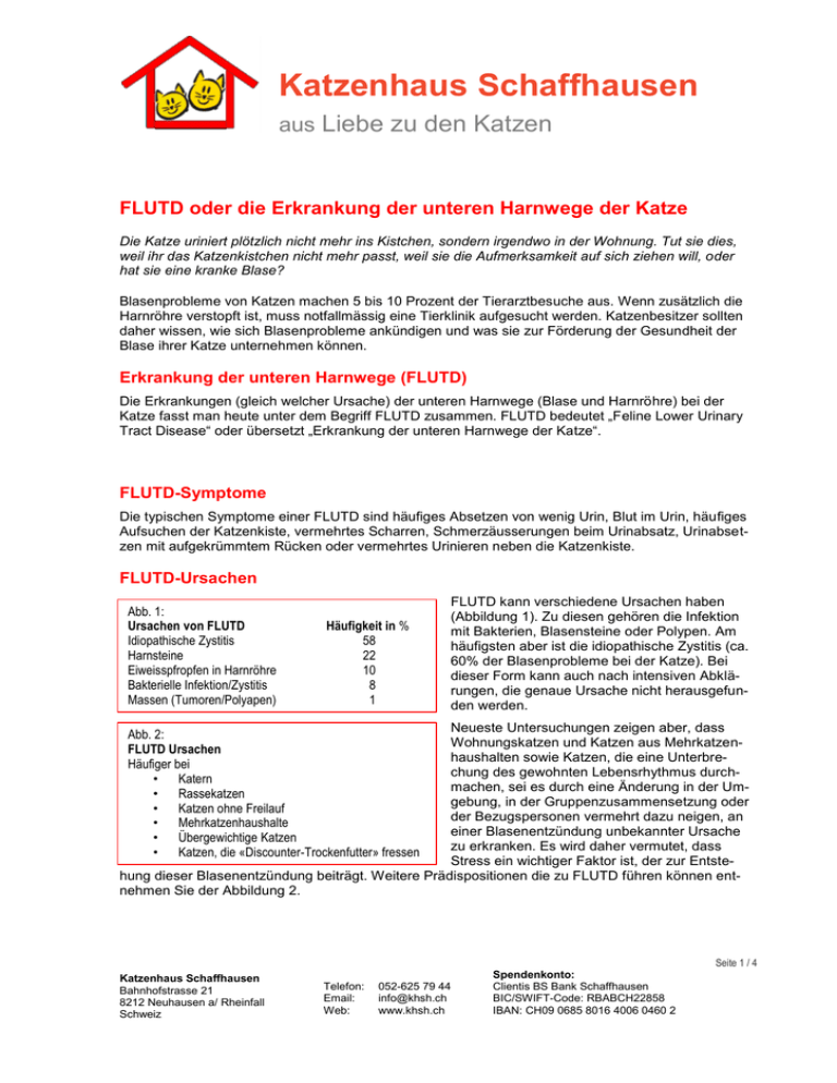 Katzenhaus Schaffhausen aus Liebe zu den Katzen FLUTD oder die Erkrankung der unteren Harnwege der Katze Die Katze uriniert plötzlich nicht mehr ins Kistchen, sondern irgendwo in der Wohnung. Tut sie dies, weil ihr das Katzenkistchen nicht mehr passt, weil sie die Aufmerksamkeit auf sich ziehen will, oder hat sie eine kranke Blase? Blasenprobleme von Katzen machen 5 bis 10 Prozent der Tierarztbesuche aus. Wenn zusätzlich die Harnröhre verstopft ist, muss notfallmässig eine Tierklinik aufgesucht werden. Katzenbesitzer sollten daher wissen, wie sich Blasenprobleme ankündigen und was sie zur Förderung der Gesundheit der Blase ihrer Katze unternehmen können. Erkrankung der unteren Harnwege (FLUTD) Die Erkrankungen (gleich welcher Ursache) der unteren Harnwege (Blase und Harnröhre) bei der Katze fasst man heute unter dem Begriff FLUTD zusammen. FLUTD bedeutet „Feline Lower Urinary Tract Disease“ oder übersetzt „Erkrankung der unteren Harnwege der Katze“. FLUTD-Symptome Die typischen Symptome einer FLUTD sind häufiges Absetzen von wenig Urin, Blut im Urin, häufiges Aufsuchen der Katzenkiste, vermehrtes Scharren, Schmerzäusserungen beim Urinabsatz, Urinabsetzen mit aufgekrümmtem Rücken oder vermehrtes Urinieren neben die Katzenkiste. FLUTD-Ursachen Abb. 1: Ursachen von FLUTD Idiopathische Zystitis Harnsteine Eiweisspfropfen in Harnröhre Bakterielle Infektion/Zystitis Massen (Tumoren/Polyapen) Häufigkeit in % 58 22 10 8 1 FLUTD kann verschiedene Ursachen haben (Abbildung 1). Zu diesen gehören die Infektion mit Bakterien, Blasensteine oder Polypen. Am häufigsten aber ist die idiopathische Zystitis (ca. 60% der Blasenprobleme bei der Katze). Bei dieser Form kann auch nach intensiven Abklärungen, die genaue Ursache nicht herausgefunden werden. Neueste Untersuchungen zeigen aber, dass Wohnungskatzen und Katzen aus Mehrkatzenhaushalten sowie Katzen, die eine Unterbrechung des gewohnten Lebensrhythmus durchmachen, sei es durch eine Änderung in der Umgebung, in der Gruppenzusammensetzung oder der Bezugspersonen vermehrt dazu neigen, an einer Blasenentzündung unbekannter Ursache zu erkranken. Es wird daher vermutet, dass Stress ein wichtiger Faktor ist, der zur Entstehung dieser Blasenentzündung beiträgt. Weitere Prädispositionen die zu FLUTD führen können entnehmen Sie der Abbildung 2. Abb. 2: FLUTD Ursachen Häufiger bei • Katern • Rassekatzen • Katzen ohne Freilauf • Mehrkatzenhaushalte • Übergewichtige Katzen • Katzen, die «Discounter-Trockenfutter» fressen Seite 1 / 4 Katzenhaus Schaffhausen Bahnhofstrasse 21 8212 Neuhausen a/ Rheinfall Schweiz Telefon: Email: Web: 052-625 79 44 [email protected] www.khsh.ch Spendenkonto: Clientis BS Bank Schaffhausen BIC/SWIFT-Code: RBABCH22858 IBAN: CH09 0685 8016 4006 0460 2 Katzenhaus Schaffhausen aus Liebe zu den Katzen Tierärztlicher Untersuch/Diagnose Da alle Formen der FLUTD ein ähnliches Bild zeigen, ist eine Differenzierung mittels Labor- und bildgebender Diagnostik entscheidend für die Durchführung einer erfolgreichen Therapie und Prophylaxe. Während zum Beispiel häufiges Absetzen von wenig Urin Zeichen für eine FLUTD sind, kann das häufige aufsuchen der Katzenkiste auch durch eine Zuckerkrankheit oder durch ein Nierenproblem bedingt sein. Letztere Krankheiten führen dazu, dass die Katze durch vermehrte Wasseraufnahme eine auffallend grosse Menge von Urin produziert. Es empfiehlt sich deshalb, die Katze bei jeglicher Art von Urinabsatzveränderung medizinisch untersuchen zu lassen. Nur so kann festgestellt werden, ob das Problem in den Harnwegen oder anderswo liegt. Eine Abklärung beinhaltet eine Untersuchung von Blut und Urin sowie eine Röntgen- und/ oder Ultraschalluntersuchung. Bei der Uringewinnung wird die direkte Punktion der Blase unter Ultraschallkontrolle (vor der Therapie!) bevorzugt. Da Katzen mit einer entzündeten Blase aber an Drang leiden, ist die Blase meist leer und die Punktion unergiebig. Aus diesem Grund wird eine Hospitalisierung der Katze oft unumgänglich. Im Urinuntersuch kann unter anderem festgestellt werden, ob es sich um eine Entzündung handelt und ob es Bakterien (Abbildung 3) oder Kristalle (Abbildung 4) in der Blase hat. Bei den bildgebenden Verfahren ist heute der Ultraschalluntersuch in 90 Prozent der Fälle das beste diagnostische Mittel. Weiter hat Ultraschall den Vorteil, dass es nicht invasiv ist und die Katzen wach oder nur leicht sediert untersucht werden können. Die Blasenwand und -struktur sowie der Blaseninhalt wird dabei beurteilt. Therapie und Prophylaxe von Harnwegserkrankungen. Harnröhrenobstruktion/-verschluss Wenn sich ein Blasenstein oder ein Eiweisspfropf in der Harnröhre festklemmt, kann die Katze keinen Urin mehr absetzen. Da Kater eine viel engere Harnröhre haben als Kätzinnen, kommt es vorwiegend bei Katern zum Verschluss. Ein Verdacht auf eine Harnröhrenverstopfung liegt bei jedem Kater vor, der plötzlich vermehrt in der Katzenkiste scharrt, ständig die Position zum Urin- oder Kotabsetzen einnimmt und nur noch tropfenweise Urin absetzen kann. Dabei handelt es sich um einen Notfall! Die Katze muss sofort zum Tierarzt gebracht werden. Es kommt zu einem übermässigen Füllungszustand der Blase. Harnrückstau in die Nieren mit Nierengewebeschädigung und eine Anreicherung von harnpflichtigen Substanzen im Blut (Blutvergiftung) sind die Folgen. Die Katzen zeigen neben den Harnwegssymptomen Inappetenz, Erbrechen, Schwäche und werden teilnahmslos. Die Obstruktion ist schnellstmöglich zu beheben, da es sonst zu Organversagen und Tod kommt. Seite 2 / 4 Katzenhaus Schaffhausen Bahnhofstrasse 21 8212 Neuhausen a/ Rheinfall Schweiz Telefon: Email: Web: 052-625 79 44 [email protected] www.khsh.ch Spendenkonto: Clientis BS Bank Schaffhausen BIC/SWIFT-Code: RBABCH22858 IBAN: CH09 0685 8016 4006 0460 2 Katzenhaus Schaffhausen aus Liebe zu den Katzen Behandlung der Obstruktion Da der festgeklemmte Stein in der Regel heftige Schmerzen auslöst, is