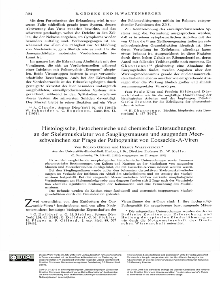 Mit dem Fortschreiten der Erkrankung wird in unserem Falle schließlich gerade jenes System, dessen Aktivierung das Virus zunächst bewirkte, der Poliomyelitisgruppe mithin im Rahmen entsprechender Reaktionen des ZNS. auf das Zur Kennzeichnung des eiweißproduzierenden Sy- schwerste geschädigt, wobei die Defekte in den Zel- stems mag die Vermutung len, die der Nekrose entgehen, im Cytoplasma wieder daß es in seinen cytoplasmatischen Anteilen mit der. besonders auffällig sind. Verlorengegangen ausgesprochen werden, ist an- von C l a u d e 2 4 aus Zellhomogenaten isolierten sub- scheinend vor allem die Fähigkeit zur Nachbildung mikroskopischen Granulafraktion identisch ist, über von Nucleinsäure, ganz ähnlich wie es auch für die deren dauergeschädigte be- etwas bekannt ist. Ausgezeichnet ist diese Fraktion Im ganzen hat die Erkrankung Ähnlichkeit mit den Anteil mit fallender Teilchengröße noch zunimmt. Da motorische Vorderhornzelle kannt ist. Vorgängen, Verteilung im Zellplasma allerdings kaum durch ihren hohen Gehalt an Ribonucleotiden, deren die sich an Vorderhornzellen einer Infektion mit Poliomyelitis-„Erregern" während Chantrenne abspie- Enzymgehaltes 2 5 gleichzeitig eine Abnahme findet, werden Angaben über des den len. Beide Virusgruppen besitzen ja enge verwandt- Wirkungsmechanismus gerade der nucleinsäurereich- schaftliche Beziehungen. Auch bei der Erkrankung sten Einheiten ebenso unsicher wie entsprechende Aus- der Vorderhornzelle ist der Erkrankungsbeginn durch sagen über die Wirkung ähnlich großer und ähnlich gesteigerte Aktivität des hier besonders umfangreich zusammengesetzter ausgebildeten, gezeichnet, dieses eiweißproduzierenden Systems während in den Spätstadien System die schwersten Schäden aus- wiederum davonträgt. Der Muskel bleibt in seiner Reaktion auf ein Virus 24 A. C l a u d e , Science [New York] 97, 451 [1943]; W. S c h n e i d e r u. G. H o g e b o o m , Canc. Res. 11, 1 [1951]. Viruskörper. Frau P a u l e E h m und Fräulein H i l d e g a r d D ü r w a l d danken wir für die sorgfältige Durchführung der histologischen Arbeiten und der Impfungen, Fräulein C a r l a P i e n i t z . für die Erledigung der phototechnischen Arbeiten. 25 H. C h a n t r e n n e , sterdam] 1, 437 [1947]. Biochim. biophysica acta [Am- Histologische, histochemische und chemische Untersuchungen an der Skeletmuskulatur von Säuglingsmäusen und saugenden Meerschweinchen zur Frage der Pathogenität von Coxsackie-A-Viren V o n ROLAND G Ä D E K E u n d H E L M U T W A L T E N B E R G E R * Aus der Universitäts-Kinderklinik Freiburg i. Br., Direktor: Professor Dr. W. K e l l e r (Z. Naturforschg. 7 b, 524—531 ] 1952[; eingegangen am 27. August 1952) Es wurden vergleichende morphologische, histochemische Untersuchungen sowie flammeiiphotometrisehe Bestimmungen von Kalium und Natrium an der Muskulatur von saugenden Mäusen und Meerschweinchen durchgeführt, die mit Coxsackie-A-Virus infiziert worden waren. Bei den Säuglingsmäusen wurde aui3er den bekannten destruktiven Skeletmuskelveränderungen im Verlaufe der Infektion ein Abfall des Muskelkaliums und ein Anstieg des Muskelnatriums festgestellt. Bei den saugenden Meerschweinchen blieben markante morphologische Veränderungen am Skeletmuskelgewebe aus; dagegen fanden sich 2 Tage nach der Virusinfektion ebenfalls signifikante Senkungen der Kaliumwerte und eine Vermehrung des Muskelnatriums. Die Befunde werden als Zeichen einer funktionell und anatomisch inapparenten Muskelgewebsläsion durch die Virusinfektion gedeutet. Z wei wesentliche, von den Entdeckern der Cox- Virusstämme des A-Typs sind: 1. ihre hochgradige sackie-Viren Pathogenität für neugeborene bzw. saugende Mäuse 1 beschriebene, und von allen Nach- untersuchern bestätigte biologische Eigenschaften der G. D a l l d o r f u. G. M. S i c k l e s , Science [New York] 108, 61 [1948]; G. D a 11 d o r f, G. M. S i c k 1 e s , H. P l a g e r u. R. G i f f o r d , J. exp. Med. 89. 567 [1949]. 1 * Die mitgeteilten Untersudiungen wurden durch das B ad \ s e h e K o m i t e e z u r E r f o r s c h u n g u n d H e i l u n g d e r s p i n a l e n K i n d e r l ä h m u n g sowie durch die N o t g e m e i n s c h a f t d e r D e u t s c h e n W i s s e n s c h a f t unterstützt. Dieses Werk wurde im Jahr 2013 vom Verlag Zeitschrift für Naturforschung in Zusammenarbeit mit der Max-Planck-Gesellschaft zur Förderung der Wissenschaften e.V. digitalisiert und unter folgender Lizenz veröffentlicht: Creative Commons Namensnennung-Keine Bearbeitung 3.0 Deutschland Lizenz. This work has been digitalized and published in 2013 by Verlag Zeitschrift für Naturforschung in cooperation with the Max Planck Society for the Advancement of Science under a Creative Commons Attribution-NoDerivs 3.0 Germany License. Zum 01.01.2015 ist eine Anpassung der Lizenzbedingungen (Entfall der Creative Commons Lizenzbedingung „Keine Bearbeitung“) beabsichtigt, um eine Nachnutzung auch im Rahmen zukünftiger wissenschaftlicher Nutzungsformen zu ermöglichen. On 01.01.2015 it is planned to change the License Conditions (the removal of the Creative Commons License condition “no derivative works”). This is to allow reuse in the area of future scientific usage. und Hamster mit Auslösung von progressiven L ä h mungen der Extremitäten und des Rumpfes, welchen 2. schwerste destruktive Skelettmuskelveränderungen in der Art einer Z e n k e r sehen Degeneration zu- grunde liegen. Diese charakteristischen Effekte beinhalten sowohl in bezug auf die Gewebsempfänglichkeit als auch auf das Wirtsspektrum jener Virus- gruppe bemerkenswerte Einschränkungen: Die Viren sind myotrop, und sie entfalten ihre pathogenen Eigenschaften anscheinend nur bei wenigen W a r m blüterspezies und auch dort nur in bestimmten Altersberöichen. Sowohl die bisherigen Untersuchungs- ergebnisse am Versuchstier als auch die gegenwärtig nur vereinzelt funde bei vorliegenden menschlichen morphologischen Be-