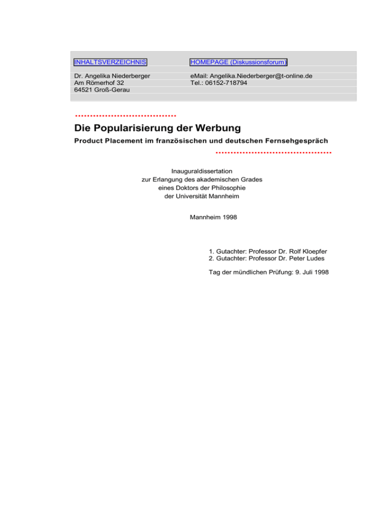 INHALTSVERZEICHNIS HOMEPAGE (Diskussionsforum) Dr. Angelika Niederberger Am Römerhof 32 64521 Groß-Gerau eMail: [email protected] Tel.: 06152-718794 .................................. Die Popularisierung der Werbung Product Placement im französischen und deutschen Fernsehgespräch ....................................... Inauguraldissertation zur Erlangung des akademischen Grades eines Doktors der Philosophie der Universität Mannheim Mannheim 1998 1. Gutachter: Professor Dr. Rolf Kloepfer 2. Gutachter: Professor Dr. Peter Ludes Tag der mündlichen Prüfung: 9. Juli 1998 Meiner Familie und meinen FreundInnen Inhaltsverzeichnis Zurück zur Startseite Vorwort. . . . . . . . . . . . . . . . . . . . . . . . . . . . . . . . . . . . . . . . . . . . . . . . . . . . . . . . . . . . . . . . . . . . . . . . . . . . . . . . . . . . . . . . 1 Einleitung . . . . . . . . . . . . . . . . . . . . . . . . . . . . . . . . . . . . . . . . . . . . . . . . . . . . . . . . . . . . . . . . . . . . . . . . . . . . . . . . . . . . . 2 1 Fernsehkultur . . . . . . . . . . . . . . . . . . . . . . . . . . . . . . . . . . . . . . . . . . . . . . . . . . . . . . . . . . . . . . . . . . . . . . . . . . . . . . . 5 1.1 DIE BEDEUTUNG DES FERNSEHENS . . . . . . . . . . . . . . . . . . . . . . . . . . . . . . . . . . . . . . . . . . . . . . . . . . . . . . . . . 5 1.1.1 Fernsehen und Gesellschaft . . . . . . . . . . . . . . . . . . . . . . . . . . . . . . . . . . . . . . . . . . . . . . . . . . . . . . . . . 6 1.1.2 Die Wirklichkeit des Fernsehens . . . . . . . . . . . . . . . . . . . . . . . . . . . . . . . . . . . . . . . . . . . . . . . . . . . . . 7 1.1.3 Gespräche im Fernsehen . . . . . . . . . . . . . . . . . . . . . . . . . . . . . . . . . . . . . . . . . . . . . . . . . . . . . . . . . . . . 8 1.1.4 Fernsehen als Ware . . . . . . . . . . . . . . . . . . . . . . . . . . . . . . . . . . . . . . . . . . . . . . . . . . . . . . . . . . . . . . . . . 9 1.2 W ERBUNG IM FERNSEHEN. . . . . . . . . . . . . . . . . . . . . . . . . . . . . . . . . . . . . . . . . . . . . . . . . . . . . . . . . . . . . . . . 10 1.2.1 Werbung - oder? . . . . . . . . . . . . . . . . . . . . . . . . . . . . . . . . . . . . . . . . . . . . . . . . . . . . . . . . . . . . . . . . . 11 1.2.2 Kultur und Werbung . . . . . . . . . . . . . . . . . . . . . . . . . . . . . . . . . . . . . . . . . . . . . . . . . . . . . . . . . . . . . . . 12 1.2.3 Produkte und Werbung . . . . . . . . . . . . . . . . . . . . . . . . . . . . . . . . . . . . . . . . . . . . . . . . . . . . . . . . . . . . 13 1.3 PRODUCT PLACEMENT IM FERNSEHEN . . . . . . . . . . . . . . . . . . . . . . . . . . . . . . . . . . . . . . . . . . . . . . . . . . . . 14 1.3.1 Product Placement im Wandel . . . . . . . . . . . . . . . . . . . . . . . . . . . . . . . . . . . . . . . . . . . . . . . . . . . . . 14 1.3.2 Integration und Desintegration durch Product Placement . . . . . . . . . . . . . . . . . . . . . . . . . . 16 1.3.3 Weshalb Product Placement im Fernsehgespräch untersuchen?. . . . . . . . . . . . . . . . . . . 17 2 Product Placement. . . . . . . . . . . . . . . . . . . . . . . . . . . . . . . . . . . . . . . . . . . . . . . . . . . . . . . . . . . . . . . . . . . . . . . . 19 2.1 PRODUCT PLACEMENT IN DER THEORIE . . . . . . . . . . . . . . . . . . . . . . . . . . . . . . . . . . . . . . . . . . . . . . . . . . . 19 2.1.1 Definitionen zu Product Placement. . . . . . . . . . . . . . . . . . . . . . . . . . . . . . . . . . . . . . . . . . . . . . . . . 19 2.1.2 Vorteile des Product Placement. . . . . . . . . . . . . . . . . . . . . . . . . . . . . . . . . . . . . . . . . . . . . . . . . . . . 21 2.1.3 Plazierungsarten . . . . . . . . . . . . . . . . . . . . . . . . . . . . . . . . . . . . . . . . . . . . . . . . . . . . . . . . . . . . . . . . . . . 23 2.2 GESCHICHTE DES PRODUCT PLACEMENT . . . . . . . . . . . . . . . . . . . . . . . . . . . . . . . . . . . . . . . . . . . . . . . . . . 24 2.3 PRODUCT PLACEMENT IN DER TV-PRAXIS . . . . . . . . . . . . . . . . . . . . . . . . . . . . . . . . . . . . . . . . . . . . . . . . . 25 2.3.1 Marktvolumen und Kosten . . . . . . . . . . . . . . . . . . . . . . . . . . . . . . . . . . . . . . . . . . . . . . . . . . . . . . . . . 25 2.3.2 Werbewirkungen . . . . . . . . . . . . . . . . . . . . . . . . . . . . . . . . . . . . . . . . . . . . . . . . . . . . . . . . . . . . . . . . . . . 27 2.3.3 Konsumgüter versus Kulturgüter . . . . . . . . . . . . . . . . . . . . . . . . . . . . . . . . . . . . . . . . . . . . . . . . . . . 29 2.3.4 Die ethische Dimension . . . . . . . . . . . . . . . . . . . . . . . . . . . . . . . . . . . . . . . . . . . . . . . . . . . . . . . . . . . . 31 2.4 RECHTLICHE GRUNDLAGEN FÜR PRODUCT PLACEMENT IM FERNSEHEN . . . . . . . . . . . . . . . . . . . . . 31 2.4.1 Rechtliche Grundlagen in Frankreich . . . . . . . . . . . . . . . . . . . . . . . . . . . . . . . . . . . . . . . . . . . . . . 32 2.4.2 Rechtliche Grundlagen in Deutschland. . . . . . . . . . . . . . . . . . . . . . . . . . . . . . . . . . . . . . . . . . . . . 33 2.5 PRODUCT PLACEMENT IM MARKETING . . . . . . . . . . . . . . . . . . . . . . . . . . . . . . . . . . . . . . . . . . . . . . . . . . . . 36 2.5.1 Einordnung des Product Placement. . . . . . . . . . . . . . . . . . . . . . . . . . . . . . . . . . . . . . . . . . . . . . . . 37 2.5.2 Werbung in Frankreich und Deutschland . . . . . . . . . . . . . . . . . . . . . . . . . . . . . . . . . . . . . . . . . . . 39 2.5.3 Guerilla Marketing . . . . . . . . . . . . . . . . . . . . . . . . . . . . . . . . . . . . . . . . . . . . . . . . . . . . . . . . . . . . . . . . . 40 2.5.4 Merchandising als Promotion Tour . . . . . . . . . . . . . . . . . . . . . . . . . . . . . . . . . . . . . . . . . . . . . . . . . 41 2.6 PRODUCT PLACEMENT IN DEN KOMMUNIKATIONSWISSENSCHAFTEN . . . . . . . . . . . . . . . . . . . . . . . . . 42 2.6.1 Die öffentliche Dimension des Product Placement . . . . . . . . . . . . . . . . . .