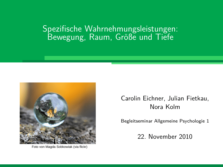Spezifische Wahrnehmungsleistungen: Bewegung, Raum, Größe und Tiefe Carolin Eichner, Julian Fietkau, Nora Kolm Begleitseminar Allgemeine Psychologie 1 22. November 2010 Foto von Magda Sobkowiak (via flickr) Carolin Eichner, Julian Fietkau, Nora Kolm Übersicht Bewegungswahrnehmung Grundaussagen Ursachen und Mechanismen Physiologischer Erklärungsansatz Vorerfahrung Tiefen- und Raumwahrnehmung Okulomotorische Tiefenreize Monokulare Tiefenreize Binokulare Tiefenreize Tiefenwahrnehmung im Gehirn Täuschung der Tiefenwahrnehmung Größenwahrnehmung Einstieg – Ames-Raum Sehwinkel Größen-Distanz-Skalierung 2 / 50 Carolin Eichner, Julian Fietkau, Nora Kolm Organisatorisches vorweg Diese Folien sind unter CC-BY-SA 3.0 freigegeben. Folien-Download und Feedback-Möglichkeit: http://www.julian-fietkau.de/wahrnehmungsleistungen 3 / 50 Bewegungswahrnehmung: Grundaussagen Carolin Eichner, Julian Fietkau, Nora Kolm Funktion von Bewegungswahrnehmung Wahrnehmungsfokus liegt auf biologischen Bewegungen von Menschen und Tieren und diente der Überlebenssicherung Bewegungswahrnehmung ist unabhängig von der Qualität der Farb- und Tiefenwahrnehmung Bewegung hilft, die Genauigkeit der Wahrnehmung zu verbessern, führt zu Wahrnehmung einer organisierteren Struktur (z.B. kinetischer Tiefeneffekt) 4 / 50 Bewegungswahrnehmung: Ursachen und Mechanismen Carolin Eichner, Julian Fietkau, Nora Kolm Augenbewegungstypen Wir vollziehen Blicksprünge, sog. „Sakkaden“: 3 Mal/Sekunde für ca. 30-50 Millisekunden Das Auge ist nie bewegungslos, selbst in Ruhe (bei „Fixation“) werden „Mikrosakkaden“ vollzogen Weitere Augenbewegungstypen: 5 / 50 Glatte Augenfolgebewegung optokinetische Augenbewegung vestibulo-okulärer Reflex Bewegungswahrnehmung: Ursachen und Mechanismen Carolin Eichner, Julian Fietkau, Nora Kolm Reale Bewegung im Kontext des verhaltensbezogenen Ansatzes von J.J. Gibson Objekt bewegt sich durch das Gesichtsfeld des Betrachters Betrachter still −→ Bewegung erzeugt Abbild, das sich über Retina bewegt Nach J.J. Gibson: „lokale Bewegung im optischen Feld“ Hintergrund wird zu- und aufgedeckt Objekt bewegt sich durch den Raum Betrachter verfolgt es mit den Augen −→ da Fovea auf Objekt verweilt, bleibt Abbild auf Retina stationär Nach J.J. Gibson: „lokale Bewegung im optischen Feld“ durch Zuund Aufdecken des Hintergrundes 6 / 50 Bewegungswahrnehmung: Ursachen und Mechanismen Carolin Eichner, Julian Fietkau, Nora Kolm Reale Bewegung im Kontext des verhaltensbezogenen Ansatzes von J.J. Gibson Objekt in der Umgebung stationär Betrachter bewegt sich −→ Abbild der Umwelt bewegt sich über Retina Nach J.J. Gibson: „globaler optischer Fluss“ 7 / 50 Bewegungswahrnehmung: Ursachen und Mechanismen Carolin Eichner, Julian Fietkau, Nora Kolm Ursachen und Mechanismen Scheinbewegung (stroboskopische Bewegung) http://www.michaelbach.de/ot/mot_sam/index-de.html induzierte Bewegung Regel des Verdecken/Aufdeckens Regel des kürzesten Weges Bewegungsnacheffekt Stimulus wird über 30-60 Sek. betrachtet, anschließende Betrachtung eines stationären Objektes führt zur Wahrnehmung von Bewegung in entgegengesetzte Richtung http://www.michaelbach.de/ot/mot_adaptSpiral/index-de.html 8 / 50 Bewegungswahrnehmung: Physiologischer Erklärungsansatz Physiologischer Erklärungsansatz Reafferenzprinzip Aperturproblem MT Kortex 9 / 50 Carolin Eichner, Julian Fietkau, Nora Kolm Bewegungswahrnehmung: Physiologischer Erklärungsansatz Carolin Eichner, Julian Fietkau, Nora Kolm Reafferenzprinzip Holst/Mittelstaedt 1950 Klärung des Zusammenhangs zwischen dem Feuern von Neuronen und der Wahrnehmung Bewegungswahrnehmung hängt von 3 Signalarten ab: motorisches Signal (Augenmuskel bei Bewegung) Efferenzkopie (Kopie des motorischen Stimulus) afferentes Signal (Stimulation von Rezeptoren durch sich über Retina bewegendes Abbild) Bewegung wird wahrgenommen, wenn im Komparator entweder Efferenzkopie oder afferentes Signal überwiegt 10 / 50 Bewegungswahrnehmung: Physiologischer Erklärungsansatz Carolin Eichner, Julian Fietkau, Nora Kolm Aperturproblem Apertur = Öffnung/Ausschnitt Problem tritt auf, wenn Beobachtung eines größeren Stimulus durch kleinen Ausschnitt irreführende Information über die Bewegungsrichtung des Stimulus liefert Apertur entspricht dem neuronalen rezeptiven Feld Aktivität einzelner Neuronen liefert unzureichende Information, in welche Richtung Bewegung erfolgt Visuelles System löst Problem durch Zusammenfassung von Infos mehrerer kortikaler Neuronen bzw. rezeptiver Felder Annahme: Signale werden in den mediotemporalen Kortex, in dem sich richtungssensitive Neuronen aufhalten, konvergiert 11 / 50 Bewegungswahrnehmung: Physiologischer Erklärungsansatz Carolin Eichner, Julian Fietkau, Nora Kolm MT (mediotemporaler) Kortex „Modul“ für Bewegungswahrnehmung Bewegungsinformation ist für Ausführung von Augenbewegung zu bewegten Objekten zuständig In Säulen organisiert, Stimulation einer Säule aktiviert Gruppe von Neuronen Benachbart mit MST im oberen Bereich des temporalen Kortex, der besonders auf Bewegungsmuster reagiert, die sich bei optischem Fluss durch Eigenbewegung ergeben 12 / 50 Bewegungswahrnehmung: Vorerfahrung Carolin Eichner, Julian Fietkau, Nora Kolm Vorerfahrung Biologische Bewegung Lichtpunktläufer- Stimulus (Johansson 1975) Erkennen der Form aus der Bewegung Antwort wird spezialisiertem Areal zu geordnet (STS – sulcus temporalis superior) der Signale sowohl aus ventralem als auch dorsalem Strom erhält 13 / 50 Tiefen- und Raumwahrnehmung Carolin Eichner, Julian Fietkau, Nora Kolm Das Grundproblem Die Welt ist dreidimensional. Die Retina in unserem Auge ist jedoch flach, zweidimensional. Jedem Bild auf der Retina können also theoretisch beliebig viele verschiedene Reale Situationen zugrunde liegen. basierend auf einem Werk von Talos (via Wikimedia Commons) vgl. Goldstein Abb. 8.1 14 / 50 Trotz dieser Einschränkung haben wir einen dreidimensionalen Eindruck von