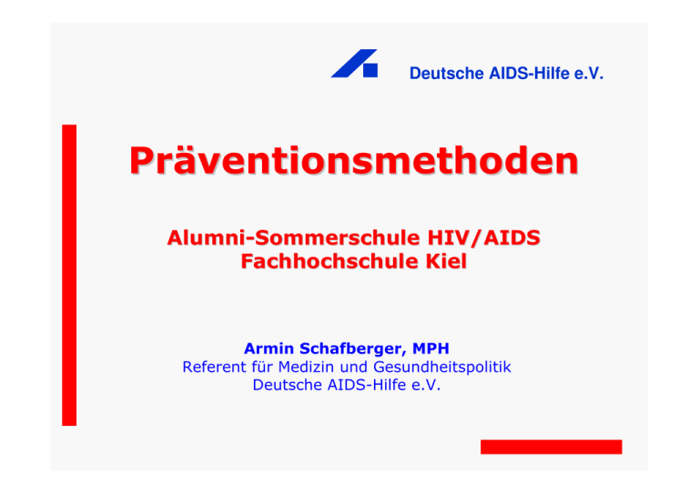 Deutsche AIDS-Hilfe e.V. Präventionsmethoden Alumni-Sommerschule HIV/AIDS Fachhochschule Kiel Armin Schafberger, MPH Referent für Medizin und Gesundheitspolitik Deutsche AIDS-Hilfe e.V. Deutsche AIDS-Hilfe e.V. Bisher • A • B • C 2 Abstinence Be Faithful (Treue) Condome Deutsche AIDS-Hilfe e.V. Präventionspipeline 3 • • • • • • • • • • A B C D E F G H I ... Antiretrovirale Therapie Beschneidung Condome Diaphragma Expositions-Prophylaxe (PREP) Frauen-kontrollierte Mikrobizide Genitale Infektionen (STD) HSV2-suppressive Behandlung Impfung / Immuntherapie Deutsche AIDS-Hilfe e.V. Präventionspipeline 4 • • • • • • • • • • A B C D E F G H I ... Antiretrovirale Therapie Beschneidung Condome Diaphragma Expositions-Prophylaxe (PREP) Frauen-kontrollierte Mikrobizide Genitale Infektionen (STD) HSV2-suppressive Behandlung Impfung / Immuntherapie Antiretrovirale Therapie Viruslast unter der Nachweisgrenze Viruslast-Messung: im Blut Entscheidend für die sexuelle Übertragung: Viruslast in genitalen/rektalen Sekreten und Schleimhäuten Proportionsstudie nach Vitruv. Leonardo da Vinci, 1492 5 Deutsche AIDS-Hilfe e.V. Antiretrovirale Therapie Deutsche AIDS-Hilfe e.V. HIV-in Plasma, Rektum und Sperma Unterschiedliche Konzentrationen. VL in Rektalflüssigkeit am höchsten VL sinkt in allen Kompartimenten nach HAART VL auch bei HAART unterschiedlich Higher Concentration of HIV RNA in Rectal Mucosa Secretions than in Blood and Seminal Plasma, among MSM, Independent of Antiretroviral Therapy. 6 Zuckerman R et al. JID, 2004, 190, 1. July Antiretrovirale Therapie Deutsche AIDS-Hilfe e.V. HIV-Medikamente im Genitaltrakt Medikamentenkonzentrationen im Genitaltrakt bei Männern und Frauen im Vergleich zur Blut-PlasmaKonzentration Narrative Interview: Antiretroviral Therapy to prevent sexual transmission of HIV Cohen M et al., Annals of Internal Medicine, 2007, 146, 591-601 7 Antiretrovirale Therapie Deutsche AIDS-Hilfe e.V. Freie Viren und infizierte Zellen Was trägt mehr zur Transmission bei: freie Viren oder infizierte Zellen? Abbildung aus: Lancet, Vol 369, März 2007 8 Antiretrovirale Therapie STD-Phasen Viruslast (Sperma) am höchsten zu Beginn der Infektion und während STD Amplified HIV Transmission and New Approaches to HIV Prevention Cohen M et Pilcher C. Editorial Commentary, JID, 2005: 191 (1 May) 9 Deutsche AIDS-Hilfe e.V. Antiretrovirale Therapie Deutsche AIDS-Hilfe e.V. Zusammenfassung: 4 Probleme 1. Viruslast in Blut und Genitalen Sekreten / Schleimhäuten 2. Medikamentenkonzentrationen in Blut und Genitalen Sekreten / Schleimhäuten 3. Freie Viren (Viruslast) oder infizierte Zellen bedeutsamer? 4. STD: Anstieg der Viruslast und der infizierten Zellen im Genitaltrakt 10 Antiretrovirale Therapie Deutsche AIDS-Hilfe e.V. Was wirklich zählt… Viruslast? Sperma? Darmschleimhaut? STD? Moral? Medikamentenkonzentration? Entscheidend ist : wie viele Infektionen gibt es? 11 Antiretrovirale Therapie Rakai, Uganda 174 heterosexuelle Paare, serodiskordant 38 HIV-Infektionen Keine ART (!!!) Risikofaktoren: hohe VL und STD Probability of HIV-Transmission per coital act in monogamous heterosex discord couples in Rakai, Uganda Gray R et al., 12 The Lancet, 357, April 14, 2001 Deutsche AIDS-Hilfe e.V. Antiretrovirale Therapie Rakai, Uganda Risiko per coital act Risiko 23 mal höher bei VL > 38.500 im Vergleich zu VL < 1.700 Probability of HIV-Transmission per coital act in monogamous heterosex discord couples in Rakai, Uganda Gray R et al., 13 The Lancet, 357, April 14, 2001 Deutsche AIDS-Hilfe e.V. Antiretrovirale Therapie Rakai, Uganda 415 heterosexuelle Paare, serodiskordant 90 HIV- Infektionen Keine Infektion bei VL < 1500 /ml (51 Paare) Pro Log-Stufe (VL) 2,45-fach höheres Risiko Viral load and heterosexuell transmission of HIV1 Quinn T et al., NEJM, Vol 342, 13. March 30, 14 2000 Deutsche AIDS-Hilfe e.V. Antiretrovirale Therapie Deutsche AIDS-Hilfe e.V. Infizierte / Analysierte Spanien Heterosexuelle 393 diskordante Keine HAART 27 / 313 Mono- oder Bitherapie 2 / 20 HAART 0 / 60 Paare, 1991 – 2003 Weniger HIV-Infektionen (gemessen wird Prävalenz!!) je besser Partner behandelt wird 12 10 10.3% 8 6 Effectiveness of HAART in reducing 4 heterosexual transmission of 2 HIV Castilla J et al., JAIDS, Vol 40, No 1, Sept 1, 2005 15 6.8% P = 0.006 pre-HAART vs late-HAART 1.9% 0 pre (1991-5) early (1996-8) late (1999- 2003) Antiretrovirale Therapie Deutsche AIDS-Hilfe e.V. Taiwan HAART Weniger starker Anstieg der neuen HIV-Diagnosen nach Einführung der HAART (freier Zugang) Fang CT, Hsu HM, Twu SJ, Chen MY, Chang YY, Hwang JS, et al. Decreased HIV transmission after a policy of providing free access to highly active antiretroviral therapy in Taiwan. J 16 Infect Dis. 2004;190:879-85 Antiretrovirale Therapie Deutsche AIDS-Hilfe e.V. British Columbia (Can) 25 Syphilis-Fälle steigen an HIV-Infektionen bleiben stabil 20 HIV Syphilis 15 Ein Effekt der HAART?? 10 Re-evaluating the costeffectiveness of HAART Julio Montaner, Toronto 2006, Daten nach M REKART, BCCDC, 2006 17 5 0 19 19 19 19 19 19 19 19 19 20 20 20 20 20 91 92 93 94 95 96 97 98 99 00 01 02 03 04 Antiretrovirale Therapie Deutsche AIDS-Hilfe e.V. Gibt es noch Infektionen? „Bislang ist kein Fall einer Infektion weltweit nachgewiesen worden!“ 1. Es gibt keine Studie, die das untersucht 2. Solche Untersuchungen sind strafrechtlich relevant für Indexperson 3. In Frankfurt nun ein Fall (mit genotypischem Virusnachweis) nachgewiesen. Wird bald publiziert 18 Antiretrovirale Therapie Deutsche AIDS-Hilfe e.V. Was fehlt? Inverventionsstudie HPTN 52 1750 serodiskordante Paare (Hetero) Randomisiert Effekt von HAART auf die Transmission Thailand, Zimbabwe, Indien, Malawi, Brasilien, USA Ergebnisse 2010 – 2012? 1750 +/- HIV Prevention Trial Network HPTN 52 http://www.hptn.org/research_studies/ 19 HPTN052.asp ART sofort CD 300 – 500/mm3 ART später ab CD 200/mm3 ? +/+ ? +/+ Antiretrovirale Therapie Deutsche AIDS-Hi