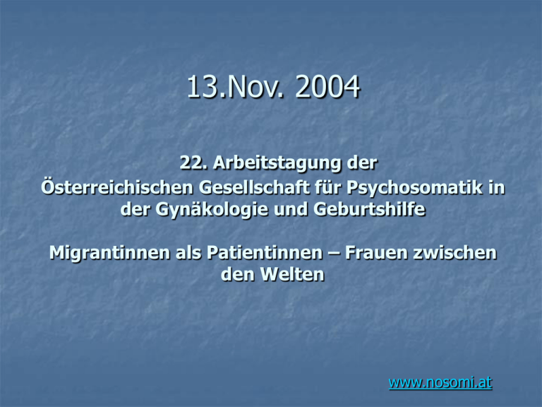 13.Nov. 2004 22. Arbeitstagung der Österreichischen Gesellschaft für Psychosomatik in der Gynäkologie und Geburtshilfe Migrantinnen als Patientinnen – Frauen zwischen den Welten www.nosomi.at ZENTRUM NOSOMI ALLGEMEINMEDIZIN, ONKOLOGIE, NATURHEILVERFAHREN ÄRZTLICHE LEITUNG: Dr.Dr. HELMUT BACOWSKY 1200 Wien, Sachsenplatz 9/30 Tel.: +43 1 330 85 62, Fax: +43 664 507 81 82 E-Mail: [email protected] www.nosomi.at Die japanische Frau als Patientin in der Gynäkologie und Geburtshilfe Unterschiede Japan – Europa? www.nosomi.at Bacowsky H. Bacowsky M. In einer kurze Darstellung werden die Veränderungen der Stellung und des Rollenbildes der Frau in der japanischen Gesellschaft des ausgehenden 19. u. 20. Jahrhunderts aufgezeigt, um das Verstehen für den Einfluss der gesellschaftlichen Normen auf die Einstellung der japanischen Frau zu ihrem Körper und ihrer Sexualität zu fördern. Das Wissen um diese Unterschiede in der Befindlichkeit japanischer Patientinnen, soll dem österreichischen Arzt, der Ärztin und Hebamme den Umgang mit dieser Patientengruppe in der täglichen Praxis in Gynäkologie und Geburtshilfe erleichtern. www.nosomi.at Die Stellung der Frau in der japanischen Gesellschaft früher und heute Das Rollenbild der Frau in der japanischen Gesellschaft bis nach dem 2. Weltkrieg war geprägt durch das Verständnis, dass sie als Mutter Zentrum der Familie war. Ihre Aufgabe war Gebärerin vor allem des männlichen Stammhalters, Managements der Familie, Herrscherin über den inneren Bereich, versinnbildlicht auch im chinesischen Zeichen, dass mitunter für Familie verwendet wird (Uchi = Innen), aber auch Dienstmagd der Schwiegermutter, so sie dem ältesten Sohn einer Familie verheiratet wurde. War es vor 100 Jahren noch üblich, dass bis zu drei Generationen vor allem im ländlich bäuerlichen Bereich unter einem Dach lebten, so ist im 21. Jahrhundert diese Form der Gemeinschaft schon eine Rarität, der Trend zum Singlehaushalt mit alle seinen andersgearteten sozioökologischen und ökonomischen Problemen scheinbar unaufhaltbar. www.nosomi.at www.nosomi.at Bis Mitte des 20. Jahrhunderts war die Eheschließung vor allem im Bereich der gehobenen und oberen Gesellschaftsschichten Sache des Patriarchen der Familie. Unter Mithilfe eines Vermittlers wurde nach genauer finanzieller und gesundheitlicher Prüfung sowohl der Familien als auch der Kandidaten die Entscheidung getroffen. So genannte Liebesheiraten waren in dieser Zeit die Ausnahme. Die Aufklärung erfolgte vor der Hochzeitszeremonie im Schnellverfahren mittels Darstellungen des Geschlechtsverkehrs an Hand von Bildern (z.B. Ukiyoe-Bilder) und dem wohlmeinenden Ratschlag: „..hinlegen und ruhig alles über sich ergehen lassen...der Mann weiß schon, was zu tun ist...“ www.nosomi.at Email-Umfrage von „Trend in Japan“ aus dem Jahre 2003 über die Ehe: 300 japanische Singles (150 Frauen, 150 Männer) im Alter zwischen 20 und 30 Jahren äußerten sich zum Thema Ehe. Zur Frage, wie man den/die künftige(n) Partnerin am liebsten kennenlernen wolle, gaben 87% der Befragten an, ihn per Zufall treffen zu wollen, 50% äußerten Ihm oder Ihr über einen gegenseitigen Freund vorgestellt zu werden. 20% wünschten ein vorher festgesetztes Rendezvous und 18% im Rahmen eines Gruppentreffens. www.nosomi.at Der Anspruch der jungen Japanerinnen an ihre zukünftigen „Traummann“ wird seit den 80er Jahren in den Medien unter dem Begriff des „sanko“ (3 hohe Wünsche) kolportiert, das heißt der zukünftige Heiratspartner sollte über einen hohen Bildungsabschluss, eine hohe Gehaltsstufe und ein hohes Körpermaß besitzen. Da immer mehr Frauen auch die berufliche Karriere bevorzugen und nicht mehr gewillt sind, die Pflegelast der zunehmend überalternden Gesellschaft mit zu tragen, ist das durchschnittliche Heiratsalter in den letzten Jahre weiter gestiegen. Im Jahr 2000 lag die Quote der noch nie verheirateten Frauen zwischen 25 und 29 Jahren bei 54%. Erstgeborene männliche Nachkommen sind zunehmend schwerer am Heiratsmarkt vermittelbar, da in der Regel diese auch nach der Eheschließung im elterlichen Haushalt weiterleben und es die Aufgabe der Frau ist, die Pflege der Schwiegereltern zu übernehmen. www.nosomi.at www.nosomi.at Alterszunahme erstgebärender Frauen von 1970 – 2003 www.nosomi.at In den letzten Jahren zeigte sich auch eine deutliche Zunahme der Ehepaarhaushalte ohne Kind und ein dramatischer Rückgang der Geburtenrate. Dagegen steigt die Zahl der Hunde und Katzen, die in kinderlosen Haushalten leben. www.nosomi.at Schamgefühl und die Einstellung zum Geschlechtsteil das so Genannte „hazu kashi “ Kindern wird immer wieder gesagt, dass nackt herumlaufen etwas zum Schämen ist, insbesondere wird solcherart der Anal-Genitalbereich stigmatisiert. Erfahrungsbericht weiblicher Babysitterin: will einem zweijähriges Mädchen das Nachthemd anziehen, da schreit die Kleine: „...schau nicht meine nackte Haut!“ Diese Einstellung findet sich im Erwachsenenalter - dann allerdings oft unbewusst – und beeinflusst das Verhalten der Frauen unter anderem auch bei der gynäkologischen Unersuchung www.nosomi.at Sexualaufklärung findet sich im Lehrplan von Volksschulen, die Handhabung aber durch die einzelnen Lehrkräfte ist jedoch sehr unterschiedlich. Generell lässt sich sagen, dass diese Arten der Aufklärung eher zu einer Verschleierung, denn zur Klärung beitragen. Aufklärung in Familien erfolgt individuell, je nach Bildungsgrad und Einstellung zur Sexualität. www.nosomi.at Sexualaufklärung Als ein exemplarisches Beispiel sei jene Familie angeführt, in der bereits 2 Buben im Alter von 3 und 5 Jahren leben und das dritte Kind erwartet wurde. Auf die Frage wo das Baby herkommt, haben die Eltern alles entsprechend erklärt und damit war für die beiden Knaben das Thema erledigt. Im zweiten Beispiel erfolgte die Aufklärung eines Mädchens in der Pubertät durch ihre Freundin in der Schule. Als Folge dieser Aufklärung erin