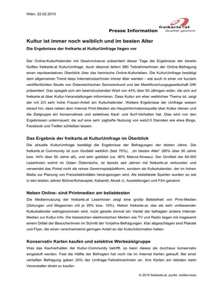 Wien, 22.02.2010 Presse Information Kultur ist immer noch weiblich und im besten Alter Die Ergebnisse der freikarte.at KulturUmfrage liegen vor Der Online-KulturKalender mit Gewinnchance präsentiert dieser Tage die Ergebnisse der bereits fünften freikarte.at KulturUmfrage. Auch diesmal liefern 580 TeilnehmerInnen der Online-Befragung einen repräsentativen Überblick über das heimische Online-Kulturleben. Die KulturUmfrage bestätigt dem allgemeinen Trend dass InternetnutzerInnen immer älter werden - wie auch in einer vor kurzem veröffentlichten Studie von Österreichischen Seniorenbund und der Marktforschungsgesellschaft GfK präsentiert. Das spiegelt sich am beeindruckenden Wert von 44% über 50 Jährigen wider, die sich auf freikarte.at über Kultur-Veranstaltungen informieren. Dass Kultur ein eher weibliches Thema ist, zeigt der mit 2/3 sehr hohe Frauen-Anteil am Kulturkalender. Weitere Ergebnisse der Umfrage weisen darauf hin, dass neben dem Internet Print-Medien als Hauptinformationsquelle über Kultur dienen und die Zielgruppe ein konservatives und selektives Kauf- und Surf-Verhalten hat. Dies wird von den Ergebnissen untermauert, die auf eine sehr zaghafte Nutzung von web2.0 Diensten wie etwa Blogs, Facebook und Twitter schließen lassen. Das Ergebnis der freikarte.at KulturUmfrage im Überblick Die aktuelle KulturUmfrage bestätigt die Ergebnisse der Befragungen der letzten Jahre. Die freikarte.at Community ist zum Großteil weiblich (fast 70%), „im besten Alter“ (85% über 30 Jahre bzw. 44% über 50 Jahre alt), und sehr gebildet (ca. 90% Matura-Niveau). Der Großteil der 60.000 LeserInnen wohnt im Osten Österreichs, ist bereits seit Jahren mit freikarte.at verbunden und verwendet das Portal nicht als reines Gewinnspielplattform, sondern als Kulturkalender, der im hohen Maße zur Planung von Freizeitaktivitäten herangezogen wird. Als beliebteste Sparten wurden so wie in den letzten Jahren Bühne/Schauspiel, Kabarett, Musik U, Ausstellungen und Film genannt. Neben Online- sind Printmedien am beliebtesten Die Mediennutzung der freikarte.at LeserInnen zeigt eine große Beliebtheit von Print-Medien (Zeitungen und Magazinen mit je 29% bzw. 10%). Neben freikarte.at, das als sehr umfassender Kulturkalender wahrgenommen wird, nutzt gerade einmal ein Viertel der befragten andere InternetMedien zur Kultur-Info. Die klassischen elektronischen Medien wie TV und Radio liegen mit insgesamt einem Drittel der BesucherInnen im Schnitt der Vorjahrs-Befragungen. Klar abgeschlagen sind Plakate und Flyer, die einen verschwindend geringen Anteil an der Kulturinformation halten. Konservativ Karten kaufen und selektive Werbezielgruppe Was das Kaufverhalten der Kultur-Community betrifft, so kann dieses als durchaus konservativ eingestuft werden. Fast die Hälfte der Befragten hat noch nie im Internet Karten gekauft. Bei einer vertieften Befragung gaben 20% der Umfrage-TeilnehmerInnen an, ihre Karten am liebsten beim Veranstalter direkt zu kaufen. © 2010 freikarte.at, punkt. netServices Wien, 22.02.2010 Presse Information Beim heiklen Thema „Werbung im Internet“ herrscht eine sehr entspannte Haltung. Fast die Hälfte der Community reagiert auf Werbung im Internet, wenn diese für sie einen offensichtlichen Vorteil oder ein interessantes Angebot darstellt. Als größte Störenfriede werden Schaltungen wahrgenommen, die den eigentlichen Content überdecken oder den Seitenaufbau langsamer machen. Grundsätzlich wollen die LeserInnen selbst in der Lage sein, Werbung zu konsumieren, falls diese für sie von Interesse ist. Werden die oben genannten negativen Formen nämlich vermieden, kann sich auch ein Großteil der Kritiker mit moderaten und zielgruppengerechten Werbeschaltungen anfreunden. Blogs und web 2.0 stehen erst am Anfang Der Fragenkomplex zum Thema Blogs zeigt, dass dieses verhältnismäßig neue Online-Medium noch weitgehend ungenutzt ist. Am konkreten Beispiel des freikarte.at KulturBlogs zeigt sich aber das wachsende Interesse, das sich aber eher im Konsumieren, denn im selber Schreiben liegt. Hier wünschen sich die LeserInnen die klassischen Themenbereich Nachberichte/Kritiken von Veranstaltungen und CDs/DVDs, Artikel von KünstlerInnen, Kommentare und Berichte von den VeranstalterInnen selbst. Wenn es um die beliebteste Kommunikationsform im Netz geht, liegt das E-Mail unangefochten an der Spitze. Facebook, Twitter und Smart-Phone-Applikationen nehmen eine sehr untergeordnete Rolle ein. Fünf Kultur-Umfrage in sechs Jahren Die Community-Befragungen werden seit 2003 vom österreichischen Kulturportal durchgeführt. Was am Anfang als reine Standort-Bestimmung begann, entwickelte sich durch die rege Beteiligung der freikarte.at LeserInnen zu einem repräsentativen Überblick über das heimische Kultur-Verhalten im Internet. Über freikarte.at - Österreichs Kulturkalender mit Gewinnchance Seit Herbst 2000 betreibt der Wiener Internet-Dienstleister punkt. netServices das Kulturportal freikarte.at. Dieses vernetzt Kulturträger und Kulturinteressierte und bietet 60.000 LeserInnen bis zu 450 Veranstaltungen pro Monat österreichweit. Die Community kann freikarte.at nach Region, Sparte oder Stichwort durchsuchen und gewinnen: nicht nur Freikarten, sondern auch einen detaillierten Einblick in das kulturelle Geschehen Österreichs. freikarte.at Mediadaten freikarte.at Community Monatliche LeserInnen: 60.000 31% männlich / 69% weiblich Wöchentliche KulturLetter- Alter: 14 - 29 Jahre: 15% AbonnentInnen: 50.000 30 - 49 Jahre: 41% 1,2 Mio. Pageimpressions über 50 Jahre: 44% (Quelle: punkt. netServices Umfrage 2009) © 2010 freikarte.at, punkt. netServices Wien, 22.02.2010 Presse Information freikarte.at - Pressekontakt: Christoph Tautscher | 01 - 897 41 22 – 24 | [email protected] Pressebereich: http://blog.freikarte.at/presse/ http://www.freikarte.at – Kulturkalender mit Gewinnchance http://blog.freikarte.at – Kultur erleben – weiter lesen © 2010 freikarte.at, punkt. netService