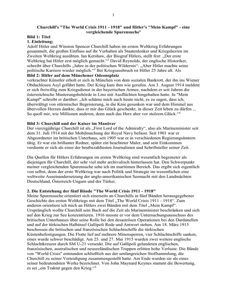 1 Churchill's "The World Crisis 1911 - 1918" und Hitler's "Mein Kampf" - eine vergleichende Spurensuche1 Bild 1: Titel 1. Einleitung: Adolf Hitler und Winston Spencer Churchill haben im ersten Weltkrieg Erfahrungen gesammelt, die großen Einfluss auf ihr Verhalten als Staatenlenker und Kriegsherren im Zweiten Weltkrieg ausübten. Ian Kershaw, der Biograf Hitlers, stellt fest: „Der erste Weltkrieg hat Hitler erst möglich gemacht.“2 David Reynolds, der englische Historiker, schreibt über Churchills „Jahre in der politischen Wildernis“: „Aber Hitler machte seine politische Karriere wieder möglich.“3 Bei Kriegsausbruch ist Hitler 25 Jahre alt. Als Bild 2: Hitler auf dem Münchener Odeonsplatz verkrachter Künstler erholt er sich in München von dem sozialen Bankrott, der ihn ins Wiener Obdachlosen Asyl geführt hatte. Der Krieg kam ihm wie gerufen. Am 3. August 1914 meldete er sich freiwillig zum Kriegsdienst in der bayerischen Armee, nachdem er seit Jahren die österreichische Musterungsbehörde in Linz mit Ausflüchten hingehalten hatte. In "Mein Kampf" schreibt er darüber: „Ich schäme mich auch heute nicht, es zu sagen, dass ich, überwältigt von stürmischer Begeisterung, in die Knie gesunken war und dem Himmel aus übervollen Herzen dankte, dass er mir das Glück geschenkt, in dieser Zeit leben zu dürfen ... So quoll mir, wie Millionen anderen, denn auch das Herz aber vor stolzem Glück.“4 Bild 3: Churchill und der Kaiser im Manöver Der vierzigjährige Churchill ist als „First Lord of the Admiralty“, also als Marineminister seit dem 31. Juli 1914 mit der Mobilmachung der Royal Navy befasst. Seit 1901 war er Abgeordneter im britischen Unterhaus, seit 1905 war er in verschiedenen Regierungsämtern tätig. Er war ein brillanter Redner, später ein beachteter Maler, und sein Einkommen verdiente er sich als einer der bestbezahltesten Journalisten und Schriftsteller seiner Zeit. Die Quellen für Hitlers Erfahrungen im ersten Weltkrieg sind wesentlich begrenzter als diejenigen für Churchill, der sehr viel mehr archivalisch hinterlassen hat. Den Schwerpunkt meiner vergleichenden Spurensuche sehe ich im maritimen Bereich. Das ergibt sich eigentlich von selbst, denn der erste Weltkrieg war nach Politik und Strategie im wesentlichen eine weltweite Auseinandersetzung der anglo-amerikanischen Seemacht mit den Landmächten Deutschland, Österreich-Ungarn und der Türkei. 2. Die Entstehung der fünf Bände "The World Crisis 1911 - 1918" Meine Spurensuche orientiert sich einerseits an Churchills in fünf Bänden herausgegebener Geschichte des ersten Weltkriegs mit dem Titel „The World Crisis 1911 - 1918“. Zum anderen orientiere ich mich an Hitlers zwei Bänden mit dem Titel „Mein Kampf“. Ursprünglich wollte Churchill sein Buch auf die Zeit als Marineminister beschränken und sich auf den Krieg zur See konzentrieren. 1916 musste er vor dem Untersuchungsausschuss des britischen Unterhauses über seine Rolle bei den desaströsen Operationen bei den Dardanellen und auf der türkischen Halbinsel Gallipoli Rede und Antwort stehen. Am 18. März 1915 beschossen die britischen und französischen Schlachtschiffe die türkischen Küstenbefestigungen. Die Flotte lief auf mehrere Minensperren, vier Schlachtschiffe sanken, eines wurde schwer beschädigt. Am 25. und 27. Mai 1915 wurden zwei weitere englische Schlachtkreuzer durch SM U-21 versenkt. Die auf Gallipoli gelandeten englischen, französischen, australischen und neuseeländischen Truppen erlitten hohe Verluste. Die Bände von "World Crisis" entstanden schließlich aus der umfangreichen Stoffsammlung, die Churchill zu seiner Verteidigung zusammengestellt hatte. Am Ende wurden sie als eines seiner bedeutendsten Werke bezeichnet. Von John Maynard Keynes stammt die Bewertung, es sei „ein Traktat gegen den Krieg.“5 2 In Band 1 wird geschildert, wie es zum Krieg kam, den Churchill trotz des deutsch-britischen maritimen Antagonismus gerne verhindert hätte. Band 2 wird von der Seekriegsführung bei den Dardanellen und den Landungen und Schlachten auf Gallipoli dominiert. Churchill war fest davon überzeugt, dass der festgefahrene und blutige Grabenkrieg in Belgien und Frankreich durch eine Zangenbewegung über die Dardanellen, das Schwarze Meer und die Donau nach Mitteleuropa hätte aufgebrochen werden können. Sein Konzept war überzeugend, die militärische Ausführung wurde sowohl von ihm, wie auch von seinen politischen Gegnern heftig kritisiert. Dieser Band beschreibt Churchills erfolgreiche Selbstverteidigung. Band 3 erschien in zwei Teilen und handelt vom langen und blutigen Stellungskrieg an der westlichen Front und Churchills heftiger Kritik an dieser Kriegführung, nicht zuletzt auf der Grundlage seiner fünfmonatigen Erfahrung als Bataillonskommandeur. Band 4 handelt von der Ostfront, ein riesiges Schlachtfeld über das damals und bis heute im angelsächsischen Bereich wenig geschrieben worden ist. Band 5 „The Aftermath“ ist in der gekürzten Fassung nicht enthalten; er handelt von der bolschewistischen Revolution, dem Vertrag von Versailles, dem Krieg zwischen der Sowjetunion und Polen und dem Entstehen der modernen Türkei. Churchills lebhafte und wortgewaltige Schilderung der Interaktion von Politikern, Admiralen und Generalen, des Schicksals der einfachen Soldaten, Seeleute und Flieger, dem Leiden der Nationen als der Krieg totaler und totaler wurde, einschließlich der Bombardierung von Paris und London ist von höchstem Interesse für die heutigen Jahre, wo wir feststellen können, wie die Hoffnung, dass der erste Weltkrieg „der Krieg sei, der den Krieg enden“ lassen könne, von jeder nachfolgenden Generation missachtet wurde.6 „Im wesentlichen hat sich mein (Churchills) kritisches Urteil nicht verändert, welches ich mir über die vielen Aspekte der maritimen, militärischen und politischen Kriegführung gebildet hatte.“ 1931 schrieb Churchill Bild 4: Text von Churchill an einen Freund: „Es i
