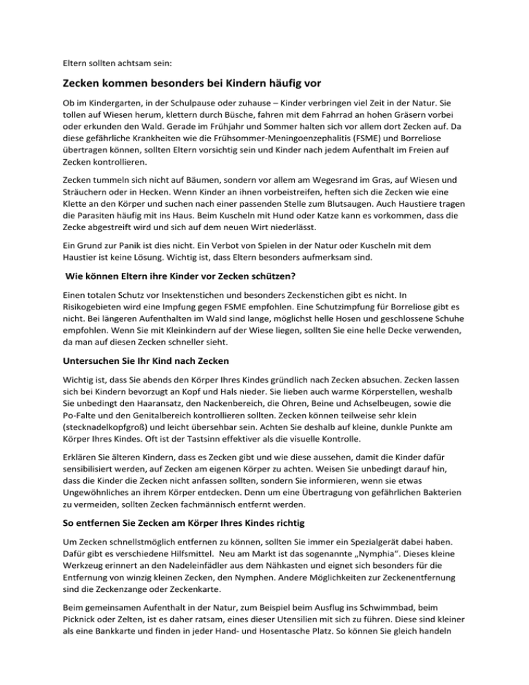 Eltern sollten achtsam sein: Zecken kommen besonders bei Kindern häufig vor Ob im Kindergarten, in der Schulpause oder zuhause – Kinder verbringen viel Zeit in der Natur. Sie tollen auf Wiesen herum, klettern durch Büsche, fahren mit dem Fahrrad an hohen Gräsern vorbei oder erkunden den Wald. Gerade im Frühjahr und Sommer halten sich vor allem dort Zecken auf. Da diese gefährliche Krankheiten wie die Frühsommer-Meningoenzephalitis (FSME) und Borreliose übertragen können, sollten Eltern vorsichtig sein und Kinder nach jedem Aufenthalt im Freien auf Zecken kontrollieren. Zecken tummeln sich nicht auf Bäumen, sondern vor allem am Wegesrand im Gras, auf Wiesen und Sträuchern oder in Hecken. Wenn Kinder an ihnen vorbeistreifen, heften sich die Zecken wie eine Klette an den Körper und suchen nach einer passenden Stelle zum Blutsaugen. Auch Haustiere tragen die Parasiten häufig mit ins Haus. Beim Kuscheln mit Hund oder Katze kann es vorkommen, dass die Zecke abgestreift wird und sich auf dem neuen Wirt niederlässt. Ein Grund zur Panik ist dies nicht. Ein Verbot von Spielen in der Natur oder Kuscheln mit dem Haustier ist keine Lösung. Wichtig ist, dass Eltern besonders aufmerksam sind. Wie können Eltern ihre Kinder vor Zecken schützen? Einen totalen Schutz vor Insektenstichen und besonders Zeckenstichen gibt es nicht. In Risikogebieten wird eine Impfung gegen FSME empfohlen. Eine Schutzimpfung für Borreliose gibt es nicht. Bei längeren Aufenthalten im Wald sind lange, möglichst helle Hosen und geschlossene Schuhe empfohlen. Wenn Sie mit Kleinkindern auf der Wiese liegen, sollten Sie eine helle Decke verwenden, da man auf diesen Zecken schneller sieht. Untersuchen Sie Ihr Kind nach Zecken Wichtig ist, dass Sie abends den Körper Ihres Kindes gründlich nach Zecken absuchen. Zecken lassen sich bei Kindern bevorzugt an Kopf und Hals nieder. Sie lieben auch warme Körperstellen, weshalb Sie unbedingt den Haaransatz, den Nackenbereich, die Ohren, Beine und Achselbeugen, sowie die Po-Falte und den Genitalbereich kontrollieren sollten. Zecken können teilweise sehr klein (stecknadelkopfgroß) und leicht übersehbar sein. Achten Sie deshalb auf kleine, dunkle Punkte am Körper Ihres Kindes. Oft ist der Tastsinn effektiver als die visuelle Kontrolle. Erklären Sie älteren Kindern, dass es Zecken gibt und wie diese aussehen, damit die Kinder dafür sensibilisiert werden, auf Zecken am eigenen Körper zu achten. Weisen Sie unbedingt darauf hin, dass die Kinder die Zecken nicht anfassen sollten, sondern Sie informieren, wenn sie etwas Ungewöhnliches an ihrem Körper entdecken. Denn um eine Übertragung von gefährlichen Bakterien zu vermeiden, sollten Zecken fachmännisch entfernt werden. So entfernen Sie Zecken am Körper Ihres Kindes richtig Um Zecken schnellstmöglich entfernen zu können, sollten Sie immer ein Spezialgerät dabei haben. Dafür gibt es verschiedene Hilfsmittel. Neu am Markt ist das sogenannte „Nymphia“. Dieses kleine Werkzeug erinnert an den Nadeleinfädler aus dem Nähkasten und eignet sich besonders für die Entfernung von winzig kleinen Zecken, den Nymphen. Andere Möglichkeiten zur Zeckenentfernung sind die Zeckenzange oder Zeckenkarte. Beim gemeinsamen Aufenthalt in der Natur, zum Beispiel beim Ausflug ins Schwimmbad, beim Picknick oder Zelten, ist es daher ratsam, eines dieser Utensilien mit sich zu führen. Diese sind kleiner als eine Bankkarte und finden in jeder Hand- und Hosentasche Platz. So können Sie gleich handeln und müssen, im Falle eines Zeckenstichs, nicht erst warten, bis Sie wieder daheim sind, um das Tier zu entfernen. Nutzen Sie die Zeckenentferner wie in der beiligenden Beschreibung empfohlen und entfernen Sie die Zecke langsam und vollständig. Ein Zerquetschen oder Drücken des Tieres kann zur Übertragung von Bakterien führen. Deshalb sollte das Entfernen durch einen Erwachsenen erfolgen. Ihr Kind spürt weder vom Einstich der Zecke etwas, noch beim Entfernen. Wenn möglich, desinfizieren Sie die Einstichstelle nach dem Entfernen der Zecke. Sollten dennoch Reste der Zecke im Körper verbleiben, sollte man versuchen, diese mit einer Kanülenspitze zu entfernen. Suchen Sie dafür am besten einen Arzt auf. Beobachten Sie in den kommenden Tagen die Einstichstelle. Sollte sich darum ein roter Kreis bilden, der sich ausbreitet und in der Mitte blasser wird, die sogenannte Wanderröte, ist dies der Beweis für eine Borrelieninfektion. Die Wanderröte tritt aber nur etwa in der Hälfte der erfolgten Infektionen auf. Grippeähnliche Symptome mit Fieber und Gliederschmerzen, die wenige Tage nach dem Zeckenstich auftreten, können Zeichen einer Infektion mit Bakterien wie Ehrlichien, Anaplasmen, Bartonellen, Borrelien oder FSME-Viren sein. Suchen Sie in diesen Fällen unbedingt einen Arzt auf, damit dieser eine entsprechende Behandlung einleiten kann.