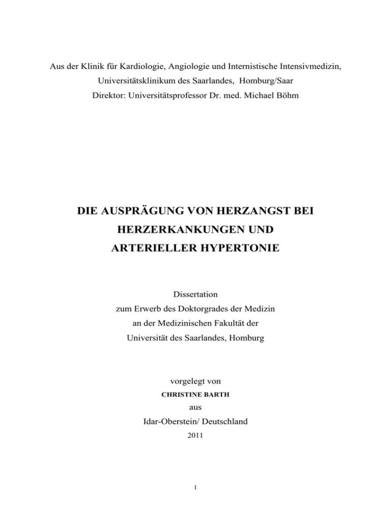Aus der Klinik für Kardiologie, Angiologie und Internistische Intensivmedizin, Universitätsklinikum des Saarlandes, Homburg/Saar Direktor: Universitätsprofessor Dr. med. Michael Böhm DIE AUSPRÄGUNG VON HERZANGST BEI HERZERKANKUNGEN UND ARTERIELLER HYPERTONIE Dissertation zum Erwerb des Doktorgrades der Medizin an der Medizinischen Fakultät der Universität des Saarlandes, Homburg vorgelegt von CHRISTINE BARTH aus Idar-Oberstein/ Deutschland 2011 1 meinen Eltern 2 I Inhalt……………………………………………………………………………… 3 II Abkürzungsverzeichnis…………………………………………………………... 5 III Abbildungsverzeichnis………………………………….......................................... 6 IV Tabellenverzeichnis………………….……………………………………………... 7 1 ZUSAMMENFASSUNG/ ABSTRACT........................................................................... 9 2 EINLEITUNG ................................................................................................................. 14 2.1 Definition von Herzangst ................................................................................................ 14 2.2 Symptome und Folgen von Herzangst ........................................................................... 15 2.3 Epidemiologie von Herzangst ........................................................................................ 16 2.4 Abgrenzung zu anderen psychischen Konstrukten; Differentialdiagnose Herzphobie und sympathikotones Syndrom................................................................. 18 2.5 Bisherige Forschungsergebnisse zum Thema Herzangst ............................................. 19 2.6 Herzangst in der deutschen Allgemeinbevölkerung ..................................................... 23 2.7 Fragestellungen der vorliegenden Studie ...................................................................... 24 3 PATIENTEN UND METHODEN .................................................................................. 26 3.1 Patienten ............................................................................................................................ 26 3.2 Methoden........................................................................................................................... 28 3.2.1 Fragebögen ..................................................................................................................... 28 3.2.1.1 Herzangstfragebogen (HAF -17), engl. Cardiac Anxiety Questionnaire (CAQ) ................................................................................................. 28 3.2.1.2 Hospital Anxiety and Depression Scale (HADS) ..................................................... 31 3.2.1.3 Minnesota Living with Heart Failure Questionnaire (MLHFQ) ........................... 34 3.2.2 Klinische Untersuchungen ............................................................................................ 36 3.2.2.1 Elektrokardiographie................................................................................................. 36 3.2.2.2 Echokardiographie ..................................................................................................... 36 3.2.2.3 Laboruntersuchungen ................................................................................................ 36 3 3.2.2.4 Herzkatheteruntersuchung ....................................................................................... 36 3.2.2.5 Klinische Parameter ................................................................................................... 37 3.2.2.6 Demographische Daten und Vorerkrankungen ...................................................... 37 3.2.3 Statistische Analysen ..................................................................................................... 37 4 ERGEBNISSE ............................................................................................................... 37 4.1 Demographische und klinische Daten ............................................................................ 39 4.2 Krankheitsspezifische Unterschiede der Häufigkeit und Ausprägung von .................... Herzangst .......................................................................................................................... 43 4.3 Alters- und geschlechtsbezogene Unterschiede herzbezogener Ängste ....................... 47 4.4 Einfluss sozialer Faktoren auf die Herzangst ................................................................ 51 4.5 Einfluss klinischer und laborchemischer Parameter auf Herzängste ......................... 54 4.6 Herzangst – Unterschiede bei kardial erkrankten Patienten im Vergleich zur Allgemeinbevölkerung ............................................................................................. 57 4.7 Vergleich der Ergebnisse des Herzangstfragebogens mit Auswertungen der HADS .......................................................................................................................... 61 4.8 Beeinflussung der Lebensqualität durch Herzangst ..................................................... 66 5 DISKUSSION ................................................................................................................... 69 5.1 Zusammenfassung der Ergebnisse ................................................................................. 69 5.2 Einschränkungen der vorliegenden Studie .................................................................... 70 5.3 Diskussion der Ergebnisse im wissenschaftlichen Kontext .......................................... 71 5.4 Ausblick und Konsequenzen für die klinische Praxis ................................................... 77 5.5 Therapeutische Implikationen ........................................................................................ 78 6 LITERATUR………………………………