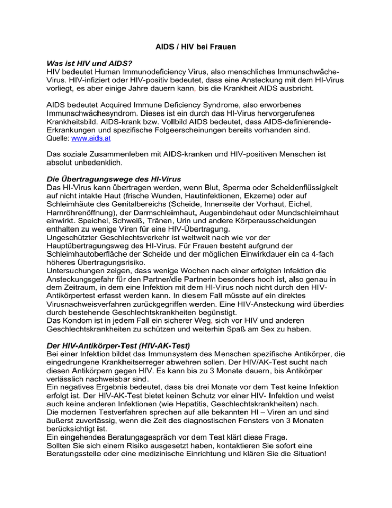 AIDS / HIV bei Frauen Was ist HIV und AIDS? HIV bedeutet Human Immunodeficiency Virus, also menschliches ImmunschwächeVirus. HIV-infiziert oder HIV-positiv bedeutet, dass eine Ansteckung mit dem HI-Virus vorliegt, es aber einige Jahre dauern kann, bis die Krankheit AIDS ausbricht. AIDS bedeutet Acquired Immune Deficiency Syndrome, also erworbenes Immunschwächesyndrom. Dieses ist ein durch das HI-Virus hervorgerufenes Krankheitsbild. AIDS-krank bzw. Vollbild AIDS bedeutet, dass AIDS-definierendeErkrankungen und spezifische Folgeerscheinungen bereits vorhanden sind. Quelle: www.aids.at Das soziale Zusammenleben mit AIDS-kranken und HIV-positiven Menschen ist absolut unbedenklich. Die Übertragungswege des HI-Virus Das HI-Virus kann übertragen werden, wenn Blut, Sperma oder Scheidenflüssigkeit auf nicht intakte Haut (frische Wunden, Hautinfektionen, Ekzeme) oder auf Schleimhäute des Genitalbereichs (Scheide, Innenseite der Vorhaut, Eichel, Harnröhrenöffnung), der Darmschleimhaut, Augenbindehaut oder Mundschleimhaut einwirkt. Speichel, Schweiß, Tränen, Urin und andere Körperausscheidungen enthalten zu wenige Viren für eine HIV-Übertragung. Ungeschützter Geschlechtsverkehr ist weltweit nach wie vor der Hauptübertragungsweg des HI-Virus. Für Frauen besteht aufgrund der Schleimhautoberfläche der Scheide und der möglichen Einwirkdauer ein ca 4-fach höheres Übertragungsrisiko. Untersuchungen zeigen, dass wenige Wochen nach einer erfolgten Infektion die Ansteckungsgefahr für den Partner/die Partnerin besonders hoch ist, also genau in dem Zeitraum, in dem eine Infektion mit dem HI-Virus noch nicht durch den HIVAntikörpertest erfasst werden kann. In diesem Fall müsste auf ein direktes Virusnachweisverfahren zurückgegriffen werden. Eine HIV-Ansteckung wird überdies durch bestehende Geschlechtskrankheiten begünstigt. Das Kondom ist in jedem Fall ein sicherer Weg, sich vor HIV und anderen Geschlechtskrankheiten zu schützen und weiterhin Spaß am Sex zu haben. Der HIV-Antikörper-Test (HIV-AK-Test) Bei einer Infektion bildet das Immunsystem des Menschen spezifische Antikörper, die eingedrungene Krankheitserreger abwehren sollen. Der HIV/AK-Test sucht nach diesen Antikörpern gegen HIV. Es kann bis zu 3 Monate dauern, bis Antikörper verlässlich nachweisbar sind. Ein negatives Ergebnis bedeutet, dass bis drei Monate vor dem Test keine Infektion erfolgt ist. Der HIV-AK-Test bietet keinen Schutz vor einer HIV- Infektion und weist auch keine anderen Infektionen (wie Hepatitis, Geschlechtskrankheiten) nach. Die modernen Testverfahren sprechen auf alle bekannten HI – Viren an und sind äußerst zuverlässig, wenn die Zeit des diagnostischen Fensters von 3 Monaten berücksichtigt ist. Ein eingehendes Beratungsgespräch vor dem Test klärt diese Frage. Sollten Sie sich einem Risiko ausgesetzt haben, kontaktieren Sie sofort eine Beratungsstelle oder eine medizinische Einrichtung und klären Sie die Situation! Der HIV-AK-Test sollte nur freiwillig gemacht werden. Niemand soll dazu gezwungen werden. Personen, die mit der Auswertung des Tests in irgendeiner Weise befasst sind, unterliegen der Schweigepflicht. Der Test sollte unbedingt von einem Beratungsgespräch begleitet werden. AIDS-Erkrankungen in Österreich Zwischen 1983 und Juli 2005 sind 2.420 Österreicher und Österreicherinnen an AIDS erkrankt, davon 1.394 verstorben. 21,1% sind Frauen und 78,9% Männer. In Wien lebt der Großteil der Betroffenen nämlich 48,22%. An die 45% der AIDS-kranken Frauen in Österreich haben sich durch heterosexuellen Geschlechtsverkehr infiziert. 36,2 % über intravenösem Drogengebrauch. Bei den AIDS-kranken Männern haben sich 21,4 % durch intravenösen Drogengebrauch, 11,4 % durch heterosexuellen Geschlechtsverkehr und 44,5 % durch homosexuellen Geschlechtsverkehr mit HIV infiziert. Täglich gibt es in Österreich 1 bis 2 Neuinfektionen mit HIV, im Jahr 2004 wurden 470 Neuinfektionen festgestellt, im Vergleich zu 2003 waren es 422 Neuerkrankungen. Der größte Teil der Neuinfektionen ist auf heterosexuelle Kontakte zurückzuführen (www.aids.at - AIDS-Statistik, www.bmgf.gv.at - Österreichische AIDS-Statistik). sich infizieren kann Leben mit HIV Der Infektionsverlauf in den ersten Wochen nach der Infektion erfolgt eine rasche Virusvermehrung, in 70 –90 % der Fälle kann sie mit einer vorübergehenden grippeähnliche Symptomatik einhergehen. Charakteristisch für diese akute HIV-Infektion sind u.a. Fieber, Halsschmerzen, Lymphknotenvergrößerungen und Hautausschlag. Erst allmählich setzt die Gegenreaktion des Immunsystems mit zunehmender Antikörperbildung ein. Solange diese nicht sicher nachweisbar sind, kann ein molekularbiologisches, direktes Virusnachweisverfahren (PCR-Test) diagnostisch sinnvoll sein. HIV benutzt bestimmte Immunzellen (CD4 Lymphozyten), um sich zu vermehren, was zu einem allmählichen Verlust dieser Zellen und ihrer Abwehrfunktion führt. Zunächst wird man von einer längeren symptomlosen Phase ausgehen können. Erst wenn die Zahl der CD4 Lymphozyten unter die Grenze von 200 Zellen sinkt (normal über 500), ist die Immunfunktion so geschwächt, dass mit Aids- typischen Erkrankungen - opportunistischen Infektionen oder Tumoren- gerechnet werden muss. Man kann davon ausgehen, dass HIV durchschnittlich in etwa zehn Jahren zu Aids führt. Therapie im Jahre 1987 erfolgte die Zulassung des ersten HIV-Medikaments Retrovir®, eines Hemmstoffs der viralen Transkriptase. Aber erst seit 1996- mit der Einführung der Hemmstoffe der Protease- stehen hochaktive antiretrovirale Therapiekombinationen (=HAART) zur Verfügung. Durch das Zusammenwirken von Medikamenten unterschiedlicher Ansatzpunkte im Vermehrungszyklus des Virus lässt sich die HIVproduktion erfolgreich blockieren. Da die Medikamente natürlich auch Nebenwirkungen haben und mittlerweile klar geworden ist, dass HIV eine (in absehbarer Zeit nicht heilbare) chronische Erkrankung bleibt, werden die Medikamente heute sorgsa