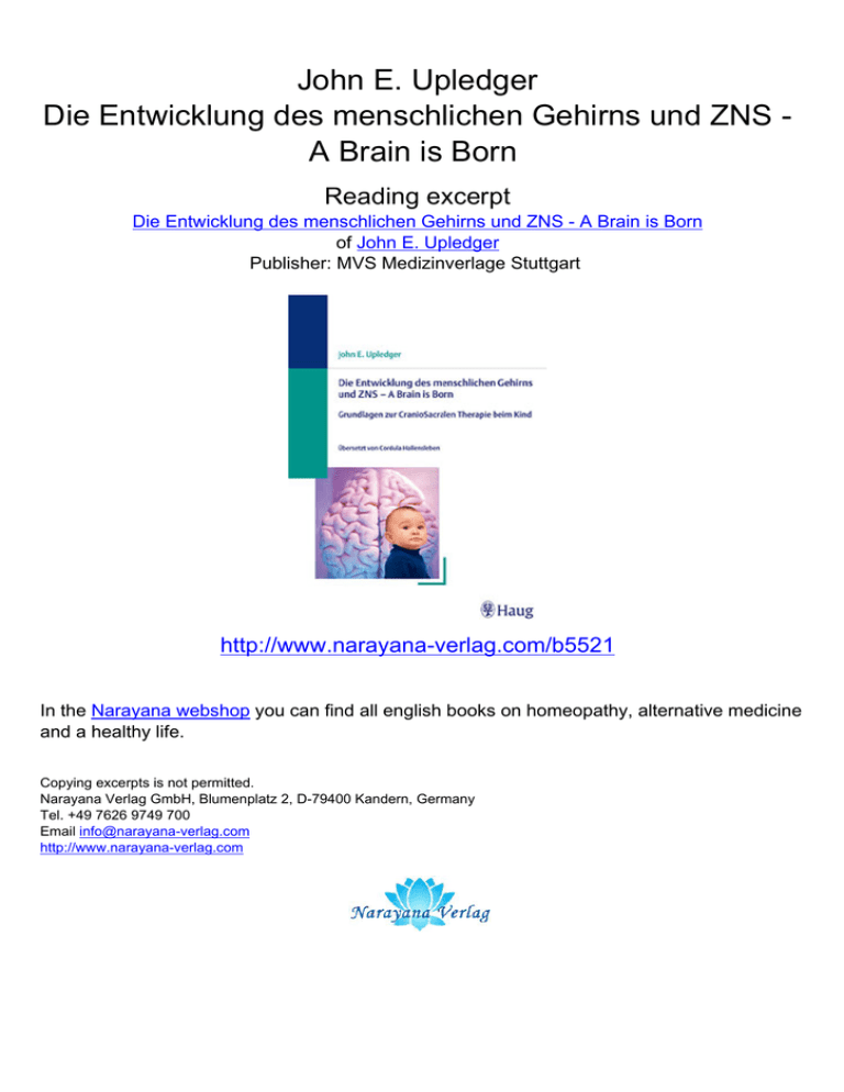 John E. Upledger Die Entwicklung des menschlichen Gehirns und ZNS A Brain is Born Reading excerpt Die Entwicklung des menschlichen Gehirns und ZNS - A Brain is Born of John E. Upledger Publisher: MVS Medizinverlage Stuttgart http://www.narayana-verlag.com/b5521 In the Narayana webshop you can find all english books on homeopathy, alternative medicine and a healthy life. Copying excerpts is not permitted. Narayana Verlag GmbH, Blumenplatz 2, D-79400 Kandern, Germany Tel. +49 7626 9749 700 Email [email protected] http://www.narayana-verlag.com Die Entwicklung des menschlichen Gehirns und Zentralen Nervensystems – A Brain is Born Grundlagen zur CranioSacralen Therapie beim Kind John E. Upledger Übersetzt von Cordula Hallensieben Geleitwort Gert Groot Landeweer 134 Abbildungen Karl F. Haug Verlag • Stuttgart Leseprobe von John E. Upledger, „Die Entwicklung des menschlichen Gehirns und ZNS – A Brain is Born“ Herausgeber: Medizinischer Verlag Stuttgart Leseprobe erstellt vom Narayana Verlag, 79400 Kandern, Tel: 0049 (0) 7626 974 970-0 Inhaltsverzeichnis Geleitwort zur deutschen Ausgabe..........X Vorworte ............................................. XII Teil l Einleitung............................................ XVI Der Anfang ..................................................................... Kapitel 1 Das Ovum...................................................3 Kapitel 3 Das Spermium .......................................... 15 Kapitel 2 Der Menstruationszyklus ......................... 7 Teil II Empfängnis und Schwangerschaft ..............................21 Kapitel 4 Befruchtung, Zellteilung und Nidation . 23 Mitose ....................................................... 24 Befruchtung.........................................23 Implantation..........................................28 Teil III A Der Embryo ....................................................................31 Kapitel 5 Die ersten vier Wochen ...........................33 Kapitel 6 Die fünfte Woche der Embryonal- Neurulation .............................................37 entwicklung.............................................. 55 Die Chorda dorsalis .............................. 37 Neurulation (Fortsetzung) ....................38 Die Neuralleiste....................................38 Die Somiten .........................................39 Rückenmarkssegmente ........................41 Allgemeine Entwicklung.........................55 Das autonome Nervensystem .................59 Das Gehirn.............................................60 . Kapitel 7 r^ Die sechste Embryonalwoche..................62 Erstaunliches Wachstum.......................44 Gehirn und Rückenmark ......................45 Kapitel 8 Bildung des Schädels ..............................47 Die siebte Embryonalwoche..................... 65 Entwicklung des Rückenmarks.............50 Segmentierung des Rückenmarks ........53 Die Wirbelsäule ...................................55 Kapitel 9 Achte Embryonalwoche ….67 Teil III B Die fetale Wachstumszeit.............................................71 Kapitell 0 Der dritte Schwangerschaftsmonat 73 Kommissuren ........................................... 74 Der dritte Schwangerschaftsmonat ___ 73 Das Nervensystem................................74 Myelinisation ........................................76 Das Ventrikelsystem ..............................77 Leseprobe von John E. Upledger, „Die Entwicklung des menschlichen Gehirns und ZNS – A Brain is Born“ Herausgeber: Medizinischer Verlag Stuttgart Leseprobe erstellt vom Narayana Verlag, 79400 Kandern, Tel: 0049 (0) 7626 974 970-0 Inhaltsverzeichnis Kapitel 11 Das zweite Trimester........................ 81 Kapitel 12 Das dritte Trimester............................... 84 Der vierte Schwangerschaftsmonat . 81 Der siebte Schwangerschaftsmonat... 84 Der sechste Schwangerschaftsmonat... 83 Der neunte Schwangerschaftsmonat.. Schwangerschaftsmonat. 85 Der fünfte Schwangerschaftsmonat. . 83 Der achte Schwangerschaftsmonat ... 85 Teil IV Von innen nach außen - Die Reise Kapitel 13 Wehen und Geburt des Kindes ............... 91 Aus der Sicht des Babys ........................91 Kaiserschnitt.. __94 Teil V Kapitel 14 Wie ist es außerhalb des Geburtskanals? . Die Teile des Zentralnervensystems. Kapitells Das Rückenmark. .99 Kapitelle Das Rhombenzephalon..........................104 Myelenzephalon und Metenzephalon . 104 Die Medulla oblongata ....................... 105 Der IV. Ventrikel................................. 107 Die Pons............................................. 107 Die Nuclei raphae der Pons................. 108 Der Locus coeruleus der Pons ............. 109 Das Cerebellum.................................. 110 Der III. Ventrikel................................. 112 Kapitell? Das Mesenzephalon...............................112 Das Tectum........................................ 113 Die Pedunculi cerebri ......................... 115 Das Tegmentum................................. 115 Die Crus cerebri ................................. 115 Die Substantia nigra........................... 115 Der Aquaeductus cerebri.................... 116 Nuclei der III. und IV. Hirnnerven........ 116 Die Formatio reticularis ..................... 117 KapiteMS Das Prosenzephalon ..............................117 Das Dienzephalon ............................... 117 Im Dienzephalon liegender Teil des Ventrikelsystems ..........................117 Der Thalamus ...................................... 118 Der Subthalamus .. ..120 89 94 97 Der Epithalamus................................ 121 Der Metathalamus............................. 122 Der Hypothalamus ............................ 122 Das Telenzephalon ............................ 125 Die Großhirnhemisphären................. 125 Die Großhirnrinde............................. 125 Die weiße Substanz Centrum semiovale ........................... 131 Die Basalganglien...............................132 Das Rh
