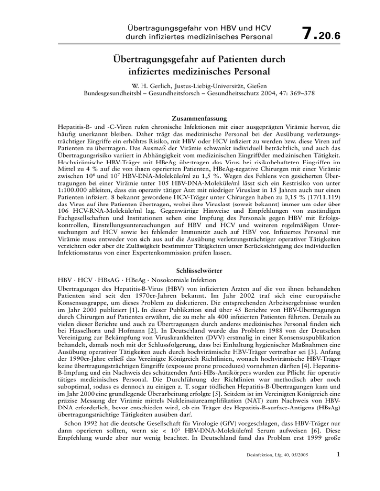Übertragungsgefahr von HBV und HCV durch infiziertes medizinisches Personal 7.20.6 Übertragungsgefahr auf Patienten durch infiziertes medizinisches Personal W. H. Gerlich, Justus-Liebig-Universität, Gießen Bundesgesundheitsbl – Gesundheitsforsch – Gesundheitsschutz 2004, 47: 369–378 Zusammenfassung Hepatitis-B- und -C-Viren rufen chronische Infektionen mit einer ausgeprägten Virämie hervor, die häufig unerkannt bleiben. Daher trägt das medizinische Personal bei der Ausübung verletzungsträchtiger Eingriffe ein erhöhtes Risiko, mit HBV oder HCV infiziert zu werden bzw. diese Viren auf Patienten zu übertragen. Das Ausmaß der Virämie schwankt individuell beträchtlich, und auch das Übertragungsrisiko variiert in Abhängigkeit vom medizinischen Eingriff/der medizinischen Tätigkeit. Hochvirämische HBV-Träger mit HBeAg übertragen das Virus bei risikobehafteten Eingriffen im Mittel zu 4 % auf die von ihnen operierten Patienten, HBeAg-negative Chirurgen mit einer Virämie zwischen 106 und 107 HBV-DNA-Moleküle/ml zu 1,5 %. Wegen des Fehlens von gesicherten Übertragungen bei einer Virämie unter 105 HBV-DNA-Moleküle/ml lässt sich ein Restrisiko von unter 1:100.000 ableiten, dass ein operativ tätiger Arzt mit niedriger Viruslast in 15 Jahren auch nur einen Patienten infiziert. 8 bekannt gewordene HCV-Träger unter Chirurgen haben zu 0,15 % (17/11.119) das Virus auf ihre Patienten übertragen, wobei ihre Viruslast (soweit bekannt) immer um oder über 106 HCV-RNA-Moleküle/ml lag. Gegenwärtige Hinweise und Empfehlungen von zuständigen Fachgesellschaften und Institutionen sehen eine Impfung des Personals gegen HBV mit Erfolgskontrollen, Einstellungsuntersuchungen auf HBV und HCV und weiteren regelmäßigen Untersuchungen auf HCV sowie bei fehlender Immunität auch auf HBV vor. Infiziertes Personal mit Virämie muss entweder von sich aus auf die Ausübung verletzungsträchtiger operativer Tätigkeiten verzichten oder aber die Zulässigkeit bestimmter Tätigkeiten unter Berücksichtigung des individuellen Infektionsstatus von einer Expertenkommission prüfen lassen. Schlüsselwörter HBV · HCV · HBsAG · HBeAg · Nosokomiale Infektion Übertragungen des Hepatitis-B-Virus (HBV) von infizierten Ärzten auf die von ihnen behandelten Patienten sind seit den 1970er-Jahren bekannt. Im Jahr 2002 traf sich eine europäische Konsensusgruppe, um dieses Problem zu diskutieren. Die entsprechenden Arbeitsergebnisse wurden im Jahr 2003 publiziert [1]. In dieser Publikation sind über 45 Berichte von HBV-Übertragungen durch Chirurgen auf Patienten erwähnt, die zu mehr als 400 infizierten Patienten führten. Details zu vielen dieser Berichte und auch zu Übertragungen durch anderes medizinisches Personal finden sich bei Hasselhorn und Hofmann [2]. In Deutschland wurde das Problem 1988 von der Deutschen Vereinigung zur Bekämpfung von Viruskrankheiten (DVV) erstmalig in einer Konsensuspublikation behandelt, damals noch mit der Schlussfolgerung, dass bei Einhaltung hygienischer Maßnahmen eine Ausübung operativer Tätigkeiten auch durch hochvirämische HBV-Träger vertretbar sei [3]. Anfang der 1990er-Jahre erließ das Vereinigte Königreich Richtlinien, wonach hochvirämische HBV-Träger keine übertragungsträchtigen Eingriffe (exposure prone procedures) vornehmen dürften [4]. HepatitisB-Impfung und ein Nachweis des schützenden Anti-HBs-Antikörpers wurden zur Pflicht für operativ tätiges medizinisches Personal. Die Durchführung der Richtlinien war methodisch aber noch suboptimal, sodass es dennoch zu einigen z. T. sogar tödlichen Hepatitis-B-Übertragungen kam und im Jahr 2000 eine grundlegende Überarbeitung erfolgte [5]. Seitdem ist im Vereinigten Königreich eine präzise Messung der Virämie mittels Nukleinsäureamplifikation (NAT) zum Nachweis von HBVDNA erforderlich, bevor entschieden wird, ob ein Träger des Hepatitis-B-surface-Antigens (HBsAg) übertragungsträchtige Tätigkeiten ausüben darf. Schon 1992 hat die deutsche Gesellschaft für Virologie (GfV) vorgeschlagen, dass HBV-Träger nur dann operieren sollten, wenn sie < 105 HBV-DNA-Moleküle/ml Serum aufweisen [6]. Diese Empfehlung wurde aber nur wenig beachtet. In Deutschland fand das Problem erst 1999 große Desinfektion, Lfg. 40, 05/2005 1 7.20.6 Sonstige Empfehlungen und Hinweise öffentliche Aufmerksamkeit, als in Presse und Fernsehen bekannt wurde, dass ein chronisch HBVinfizierter Herzchirurg im Laufe von 8 Jahren rund 100 der 2.000 von ihm operierten Patienten infiziert hatte. In Deutschland [7, 8, 9] und anderenorts wurde aber auch von Übertragungen des Hepatitis-C-Virus (HCV) durch medizinisches Personal berichtet [1]. Seitdem ist eine Reihe von Empfehlungen zur Vermeidung der Übertragung dieser Viren vom medizinischen Personal auf Patienten erarbeitet worden. Eine bundeseinheitliche Regelung liegt (noch) nicht vor, und die vorhandenen Empfehlungen lassen viele Fragen offen. Zudem wird die Tendenz erkennbar, dass nach jahrelanger Vernachlässigung des Problems nun in einer Überreaktion mitunter HBV- und HCVTrägern praktisch jede invasive Tätigkeit – unabhängig vom Ausmaß der Virämie – versagt wird. Dieser Artikel will anhand einiger exemplarischer Fälle aus der Literatur und eigener Untersuchungen die großen individuellen Unterschiede im Hinblick auf das Übertragungsrisiko darstellen und Anhaltspunkte für geeignete Maßnahmen geben. Dabei steht der Schutz des Patienten an oberster Stelle, die Interessen des betroffenen HBV- oder HCV-positiven medizinischen Personals sollten jedoch in vernünftiger Relation zum abschätzbaren Übertragungsrisiko gewahrt bleiben. Erkennung von nosokomialen Hepatitis-B- und -C-Infektionen durch infiziertes Personal Die heutige Diskussion über die zu ergreifenden Maßnahmen gegenüber HBV- und HCV-infizierten Ärzten ist z. T. von den Berichten früherer Jahre geprägt, als die Hepatitis-B-Impfung bei einigen Chirurgen auf wenig Akzeptanz stieß und Untersuc