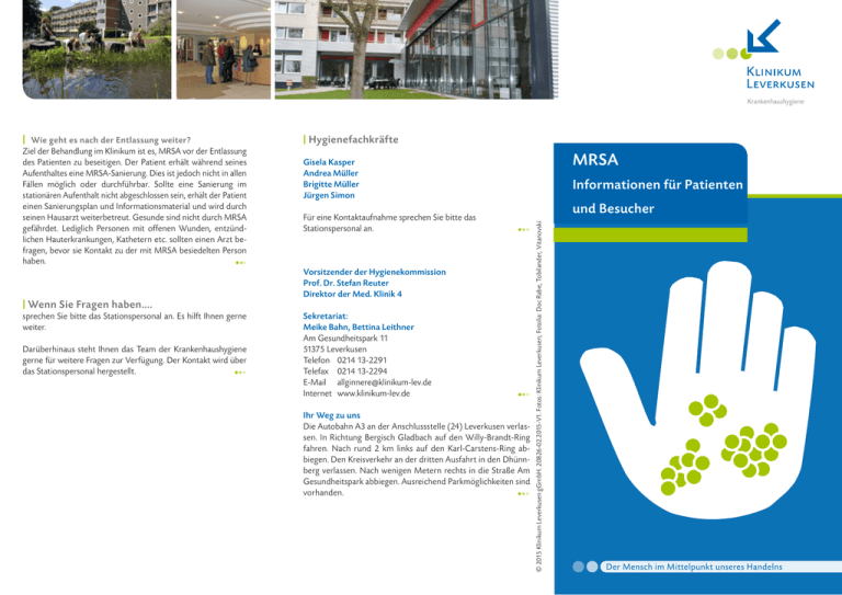 Krankenhaushygiene Ziel der Behandlung im Klinikum ist es, MRSA vor der Entlassung des Patienten zu beseitigen. Der Patient erhält während seines Aufenthaltes eine MRSA-Sanierung. Dies ist jedoch nicht in allen Fällen möglich oder durchführbar. Sollte eine Sanierung im stationären Aufenthalt nicht abgeschlossen sein, erhält der Patient einen Sanierungsplan und Informationsmaterial und wird durch seinen Hausarzt weiterbetreut. Gesunde sind nicht durch MRSA gefährdet. Lediglich Personen mit offenen Wunden, entzündlichen Hauterkrankungen, Kathetern etc. sollten einen Arzt befragen, bevor sie Kontakt zu der mit MRSA besiedelten Person haben. ••• | Wenn Sie Fragen haben.... sprechen Sie bitte das Stationspersonal an. Es hilft Ihnen gerne weiter. Darüberhinaus steht Ihnen das Team der Krankenhaushygiene gerne für weitere Fragen zur Verfügung. Der Kontakt wird über das Stationspersonal hergestellt. ••• | Hygienefachkräfte MRSA Gisela Kasper Andrea Müller Brigitte Müller Jürgen Simon Für eine Kontaktaufnahme sprechen Sie bitte das Stationspersonal an. Informationen für Patienten und Besucher ••• Vorsitzender der Hygienekommission Prof. Dr. Stefan Reuter Direktor der Med. Klinik 4 Sekretariat: Meike Bahn, Bettina Leithner Am Gesundheitspark 11 51375 Leverkusen Telefon 0214 13-2291 Telefax 0214 13-2294 [email protected] Internet www.klinikum-lev.de ••• Ihr Weg zu uns Die Autobahn A3 an der Anschlussstelle (24) Lever­kusen verlassen. In Richtung Bergisch Gladbach auf den Willy-Brandt-Ring fahren. Nach rund 2 km links auf den Karl-Carstens-Ring abbiegen. Den Kreis­verkehr an der dritten Ausfahrt in den Dhünn­ berg verlassen. Nach wenigen Metern rechts in die Straße Am Gesund­heitspark abbiegen. Aus­reichend Park­mög­lich­keiten sind vorhanden. ••• © 2015 Klinikum Leverkusen gGmbH. 20826-02.2015-V1. Fotos: Klinikum Leverkusen; Fotolia: Doc Rabe, Tobilander, Vitanovski | Wie geht es nach der Entlassung weiter? Der Mensch im Mittelpunkt unseres Handelns | Liebe Patientinnen und Patienten, liebe Angehörige und Besucher, bei Ihnen oder Ihrem Angehörigen ist eine Besiedelung mit einem multiresistenten Keim festgestellt worden. In Ihrem Fall handelt es sich um MRSA (Methicillinresistenter Staphylococcus aureus) der gegen einige Antibiotika resistent ist. Um unsere Patienten vor einer Ansteckung zu schützen, untersuchen wir alle Risikopatienten bereits bei der Aufnahme in unserer Klinik auf MRSA. So können wir einer Weiterverbreitung des Keims auf Mitpatienten wirksam vorbeugen. | Was ist MRSA? Viele Gesunde sind Träger von Staphylococcus aureus, der natürlicherweise auf der Haut und Schleimhaut vorkommt, ohne das diese es wissen und ohne eine nachteilige Auswirkung. Bei MRSA handelt es sich um das Bakterium Staphylococcus aureus, bei dem die meisten Antibiotika wirkungslos geworden sind. ••• Wir möchten Ihnen mit diesem Informationsblatt einige wichtige Fragen zu „MRSA“ beantworten. Wenn Sie noch Fragen haben oder Ihnen etwas unverständlich ist, zögern Sie nicht uns anszusprechen. ••• | Warum sind im Krankenhaus besondere Maßnahmen erforderlich? Für Gesunde ist ein MRSA ungefährlich. Im Krankenhaus gibt es jedoch viele schwerkranke und abwehrgeschwächte Patienten. Da eine MRSA Infektion bei diesen Patienten manchmal nur sehr schwierig zu behandeln ist, muss eine Ausbreitung dieser Bakterien im Krankenhaus verhindert werden. Dies kann durch einfache aber wirksame Hygienemaßnahmen erreicht werden, in die auch Besucher einzubeziehen sind. ••• Ihr Team der Krankenhaushygiene | Wodurch kann sich MRSA im Krankenhaus weiterverbreiten? MRSA kann über die Hände oder die Bekleidung aus dem Krankenzimmer gelangen und unbemerkt auf andere Patienten, Personen oder Gegenstände übertragen werden. ••• Zusätzlich muss ein Mund-Nasen-Schutz angelegt werden. Das Restaurant, Café im Gesundheitspark, die Aufenthaltsräume und der Kiosk dürfen nicht besucht werden. Die grünen Damen besorgen gerne Zeitungen etc. aus dem Kiosk. Sprechen Sie das Stationspersonal an, wenn Sie etwas benötigen. Ein Spaziergang im Park, ist nach vorheriger Abmeldung beim Stationspersonal auch ohne Tragen des Mund-Nasen-Schutzes erlaubt. ••• | Was sollten Besucher beachten? MRSA Patienten dürfen genauso oft Besuch erhalten wie unsere anderen Patienten. Lediglich kranke oder immungeschwächte Besucher sollten besser auf einen Besuch verzichten. ••• | Hygienevorschriften für Besucher Bitte beachten Sie vor Betreten des Zimmers, die an der Tür angebrachten Hygieneschilder. Wenn Sie Hilfe beim Anlegen der Schutzkleidung benötigen oder wenn Sie Fragen dazu haben, wenden Sie sich an unser Stationspersonal. • MRSA durchgeführt werden? Ein Patient der mit MRSA besiedelt ist wird entweder in einem Einzelzimmer oder gemeinsam mit anderen MRSA-Trägern untergebracht. Das Patientenzimmer darf von Personal und Besuchern nur in Schutzkleidung betreten werden. Diese besteht aus einem Schutzkittel, Mund-/Nasenschutz und Einmalhandschuhen (siehe Hygienevorschriften für Besucher) ••• Vor jedem Betreten des Zimmers und vor dem Anlegen der Schutzkleidung, bitte die hygienische Händedesinfektion durchführen. Danach einen Schutzkittel, Handschuhe und Mundschutz anziehen. • Bitte nicht auf das Bett des Patienten setzen. • | Was muss ein Patient beachten, wenn er das Zimmer verlässt? Die Patienten dürfen das Zimmer nur nach Rücksprache mit dem Arzt und dem Pflegepersonal verlassen und nur wenn sie die Hygieneregeln beachten. Wenn Sie das Zimmer verlassen, ist es notwendig sich die Hände zu desinfizieren. ••• Vor jedem Verlassen des Zimmers zuerst die Schutzkleidung ausziehen und in die dafür vorgesehenen Behälter entsorgen. Danach müssen die Hände desinfiziert werden. Am besten erledigen die Besucher daher schon vor dem Betreten des Zimmers eventuelle Einkäufe im Kiosk, etc. ••• | Welche Maßnahmen müssen bei ein