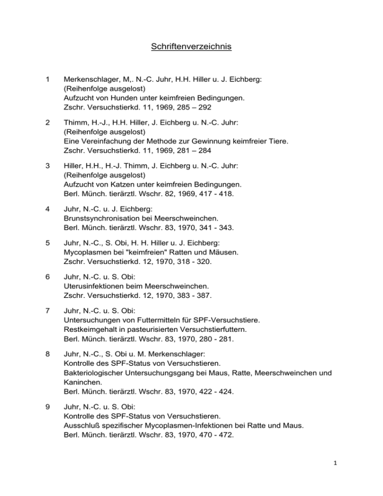 Schriftenverzeichnis 1 Merkenschlager, M,. N.-C. Juhr, H.H. Hiller u. J. Eichberg: (Reihenfolge ausgelost) Aufzucht von Hunden unter keimfreien Bedingungen. Zschr. Versuchstierkd. 11, 1969, 285 – 292 2 Thimm, H.-J., H.H. Hiller, J. Eichberg u. N.-C. Juhr: (Reihenfolge ausgelost) Eine Vereinfachung der Methode zur Gewinnung keimfreier Tiere. Zschr. Versuchstierkd. 11, 1969, 281 – 284 3 Hiller, H.H., H.-J. Thimm, J. Eichberg u. N.-C. Juhr: (Reihenfolge ausgelost) Aufzucht von Katzen unter keimfreien Bedingungen. Berl. Münch. tierärztl. Wschr. 82, 1969, 417 - 418. 4 Juhr, N.-C. u. J. Eichberg: Brunstsynchronisation bei Meerschweinchen. Berl. Münch. tierärztl. Wschr. 83, 1970, 341 - 343. 5 Juhr, N.-C., S. Obi, H. H. Hiller u. J. Eichberg: Mycoplasmen bei "keimfreien" Ratten und Mäusen. Zschr. Versuchstierkd. 12, 1970, 318 - 320. 6 Juhr, N.-C. u. S. Obi: Uterusinfektionen beim Meerschweinchen. Zschr. Versuchstierkd. 12, 1970, 383 - 387. 7 Juhr, N.-C. u. S. Obi: Untersuchungen von Futtermitteln für SPF-Versuchstiere. Restkeimgehalt in pasteurisierten Versuchstierfuttern. Berl. Münch. tierärztl. Wschr. 83, 1970, 280 - 281. 8 Juhr, N.-C., S. Obi u. M. Merkenschlager: Kontrolle des SPF-Status von Versuchstieren. Bakteriologischer Untersuchungsgang bei Maus, Ratte, Meerschweinchen und Kaninchen. Berl. Münch. tierärztl. Wschr. 83, 1970, 422 - 424. 9 Juhr, N.-C. u. S. Obi: Kontrolle des SPF-Status von Versuchstieren. Ausschluß spezifischer Mycoplasmen-Infektionen bei Ratte und Maus. Berl. Münch. tierärztl. Wschr. 83, 1970, 470 - 472. 1 10 Juhr, N.-C.: Eine einfache Vorrichtung für Eingriffe an gnotobiotischen Versuchstieren. Zschr. Versuchstierkd. 13, 1971, 177 - 178. 11 Juhr, N.-C., H. Udes u. H. H. Hiller: Modifikation der Cäcomegalie bei keimfreien Ratten. Zschr. Versuchstierkd. 13, 1971, 115 - 125. 12 Juhr, N.-C., S. Obi, H. H. Hiller u. F. Gruber: Kontrolle des SPF-Status von Versuchstieren. Untersuchung von kommerziell erhältlichen Ratten auf Mycoplasmen. Berl. Münch. tierärztl. Wschr. 84, 1971, 72 -74. 13 Juhr, N.-C. u. S. Obi: Kontrolle des SPF-Status von Versuchstieren. Hauttest zum Ausschluß von Leptospiren-Infektionen. Berl. Münch. tierärztl. Wschr. 84, 1971, 84 -11. 14 Eichberg, J. u. N.-C. Juhr: (Reihenfolge ausgelost) Leistungskontrolle einer Ratten- und Mäusezucht. Zschr. Versuchstierkd. 13, 1971, 93 -97. 15 Udes, H.,H.H. Hiller u. N.-C. Juhr: Veränderungen der Rohproteinquantität und -qualität einer Ratten-und Mäusediät durch verschiedene Sterilisationsverfahren. Zschr. Versuchstierkd. 13, 1971, 160 -166. 16 Juhr, N .-C.: Untersuchungen zur chronischen Murinen Pneumonie. Vorkommen und Resistenz von Mycoplasma pulmonis in der Umwelt. Zschr. Versuchstierkd. 13, 1971, 210 -216. 17 Juhr, N.-C.: Untersuchungen zur chronischen Murinen Pneumonie. Pathogenese der Mycoplasma pulmonis Infektion bei der Ratte. Zschr. Versuchstierkd. 13, 1971, 217 -223. 18 Merkenschlager, M. u. N.-C. Juhr: Kontrolle des SPF-Status von Versuchstieren. Ausschluß spezifischer Infektionen bei Hund und Katze. Berl. Münch. tierärztl. Wschr. 84, 1971, 111 -115. 2 19 Juhr, N.-C. u. F. Gruber: Untersuchungen an Futtermitteln für SPF-Versuchstiere. Einfluß des Restkeimgehaltes eines pasteurisierten Futters auf Darmflora und Resistenz. Zschr. Versuchstierkd. 13, 1971, 267 -274. 20 Juhr, N.-C.: Die Cäcomegalie keimfreier Nager. Berl. Münch. tierärztl. Wschr. 85, 1972 ,4 -9. 21 Juhr, N.-C. u. H. H. Hiller: Infektionen und Infektionskrankheiten bei Laboratoriumstieren. Schriftenreihe Versuchstierkunde 2 Berlin-Hamburg: Parey 1973, 99 S. 22 Kühn, 0., N.-C. Juhr, M. Rommel u. J. Boch: Experimentelle Toxoplasma-Infektionen bei der Katze III. Entwicklungsstadien nach oraler Toxoplasma-Oozysten-Infektion im Darm der Katze. Berl. Münch. tierärztl. Wschr. 87, 1974, 41 -46. 23 Juhr, N.-C.: Gnotobiotische Modelle im Tierexperiment. Tierlaboratorium 1, 1974, 7 -21. 24 Juhr, N.-C.: Bakterien bei Gnotobioten. Tierlaboratorium 1, 1974, 71 -79. 25 Obi, S. und N.-C. Juhr: (Reihenfolge ausgelost) Aspekte der Sterilisation und Sterilitätskontrolle in der Gnotobiologie. Tierlaboratorium 1, 1974, 158 -174. 26 Juhr, N.-C. und J. Horn: Modellinfektion mit Corynebacterium kutscheri bei der Maus. Zschr. Versuchstierkd.17, 1975, 129 -141. 27 Juhr, N.-C., L. Dietzel u. J. Horn: Vitamin-K-Mangel bei 11 „SPF-Ratten", ernährt mit einer strahlensterilisierten halbsynthetischen Diät. Zschr. Versuchstierkd. 17, 1975, 212 -228. 28 Horn, J. u. N.-C. Juhr: Saure Phospatase in der Milz bakterienfreier und konventioneller Ratten. Zschr. Versuchstierkd.17, 1975, 247 -255. 3 29 Rosendahl, S. u. N.-C. Juhr: Mycoplasmosis: Experimental inoculation of dogs with M. cynos Strain H 831 Symposium über Mycoplasmose, Bordeaux 11. -17. Sept. 1974 30 Juhr, N.-C.: Der mikrobielle Faktor im Ernährungsversuch. Einfluß von Koprophagieverhinderung und Cäcektomie bei keimfreien und konventionellen Ratten. Tierlaboratorium 2, 1975, 173 -207. 31 Juhr, N.-C.: Versuche zur mikrobiologischen Beurteilung von unterschiedlich sterilisierten Proteinträgern für (halbsynthetische) Versuchstierfutter. Tierlaboratorium 2, 1975, 208 -227. 32 Merkenschlager, M. u. N.-C. Juhr: Mehr Schutz in großen Beständen von Laboratoriumstieren gegen Gefährdung durch Tierseuchen. Berl. Münch. tierärztl. Wschr. 89, 1976, 243 -246. 33 Juhr, N.-C. u. A. Haas: Cellulolytische Aktivität im Cäcuminhalt von Maus, Ratte, Goldhamster, Meerschweinchen und Kaninchen. Zschr. Versuchstierkd.18, 1976, 129 -140. 34 Juhr, N.-C. u. A. Haas: Mukolytische Aktivität im Cäcum von Maus, Ratte, Goldhamster, Meerschweinchen und Kaninchen. Zschr. Versuchstierkd. 18, 1976,206 -215. 35 Juhr, N.-C.: Dekontamination als Methode der Gnotobiotisation. Tierlaboratorium 3, 1976, 107 -114. 36 Juhr, N.-C.: Embryo-Transfer: eine Methode für die Gnotobiologie. Tierlaboratorium 3, 1976, 122 -128. 37 Juhr, N.-C.: Gewinnung und Aufzucht gnotobiotischer kleiner Wiederkäuer. Tierlaborat