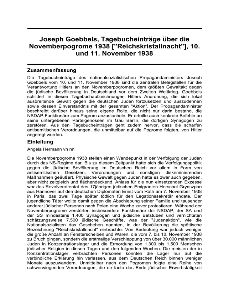 Joseph Goebbels, Tagebucheinträge über die Novemberpogrome 1938 ["Reichskristallnacht"], 10. und 11. November 1938 Zusammenfassung Die Tagebucheinträge des nationalsozialistischen Propagandaministers Joseph Goebbels vom 10. und 11. November 1938 sind die zentralen Belegstellen für die Verantwortung Hitlers an den Novemberpogromen, dem größten Gewaltakt gegen die jüdische Bevölkerung in Deutschland vor dem Zweiten Weltkrieg. Goebbels schildert in diesen Tagebuchaufzeichnungen Hitlers Anordnung, die sich lokal ausbreitende Gewalt gegen die deutschen Juden fortzusetzen und auszudehnen sowie dessen Einverständnis mit der gesamten "Aktion". Der Propagandaminister beschreibt darüber hinaus seine eigene Rolle, die nicht nur darin bestand, die NSDAP-Funktionäre zum Pogrom anzustacheln. Er erteilte auch konkrete Befehle an seine untergebenen Parteigenossen im Gau Berlin, die dortigen Synagogen zu zerstören. Aus den Tagebucheinträgen geht zudem hervor, dass die scharfen antisemitischen Verordnungen, die unmittelbar auf die Pogrome folgten, von Hitler angeregt wurden. Einleitung Angela Hermann vn nn Die Novemberpogrome 1938 stellen einen Wendepunkt in der Verfolgung der Juden durch das NS-Regime dar. Bis zu diesem Zeitpunkt hatte sich die Verfolgungspolitik gegen die jüdische Bevölkerung im Deutschen Reich vor allem in Form von antisemitischen Gesetzen, Verordnungen und sonstigen diskriminierenden Maßnahmen geäußert. Physische Gewalt gegen Juden hatte es zwar auch gegeben, aber nicht zeitgleich und flächendeckend. Anlass für die nun einsetzenden Exzesse war das Revolverattentat des 17jährigen jüdischen Emigranten Herschel Grynszpan aus Hannover auf den deutschen Diplomaten Ernst vom Rath am 7. November 1938 in Paris, das zwei Tage später tödlich für den Legationssekretär endete. Der jugendliche Täter wollte damit gegen die Abschiebung seiner Familie und tausender anderer jüdischer Personen nach Polen eine Woche zuvor protestieren. Während der Novemberpogrome zerstörten insbesondere Funktionäre der NSDAP, der SA und der SS mindestens 1.400 Synagogen und jüdische Betstuben und vernichteten schätzungsweise 7.500 jüdische Geschäfte, was der "Judenaktion", wie die Nationalsozialisten das Geschehen nannten, in der Bevölkerung die spöttische Bezeichnung "Reichskristallnacht" einbrachte. Von Bedeutung war jedoch weniger die große Anzahl an Fensterscheiben und Waren, die vom 7. bis 10. November 1938 zu Bruch gingen, sondern die erstmalige Verschleppung von über 30.000 männlichen Juden in Konzentrationslager und die Ermordung von 1.300 bis 1.500 Menschen jüdischer Religion in diesen Tagen und den folgenden Wochen. Die meisten der in Konzentrationslager verbrachten Personen konnten die Lager nur auf die verbindliche Erklärung hin verlassen, aus dem Deutschen Reich binnen weniger Monate auszuwandern. Unmittelbar nach den Pogromen folgte eine Reihe von schwerwiegenden Verordnungen, die de facto das Ende jüdischer Erwerbstätigkeit zum 1. Januar 1939 bedeuteten. Zudem wurde den geschädigten Juden auferlegt, ihre verwüsteten Geschäfte und Wohnungen selbst wieder instand zu setzen, etwaige Versicherungsansprüche fielen an das Reich. Ferner mussten die deutschen Juden eine "Sühneleistung" in Höhe von einer Milliarde Reichsmark für das Attentat Grynszpans bezahlen. Das Ziel der Nationalsozialisten hinter dem Pogrom und den folgenden Verordnungen war die Vertreibung der jüdischen Bevölkerung. Rache, Abschreckung vor etwaigen künftigen Attentaten und eine erhoffte Erleichterung bei der Legitimierung neuer antisemitischer Schritte waren weitere Motive, die Goebbels für die Gewaltakte anführt. Joseph Goebbels, der von 1933 bis 1945 nationalsozialistischer Propagandaminister war, gilt als Megaphon des NS-Regimes, das die NS-Propagandalügen in alle Welt hinausposaunte. Dieses Bild des promovierten Germanisten und NSDAP-Gauleiters von Berlin führte dazu, dass auch Goebbels’ Tagebücher in den Verdacht gerieten, es handele sich bei ihnen eher um ein propagandistisches Werk für die Nachwelt als um ein persönliches Tagebuch. Tatsächlich sind die Goebbels-Tagebücher authentische, persönliche und subjektive Aufzeichnungen des Rheinländers Goebbels, wenngleich dem Leser die verquere Weltsicht des Verfassers in beinahe jedem Absatz entgegentritt. Goebbels begann mit dem Tagebuchschreiben am 17. Oktober 1923, damals war ihm die NSDAP noch unbekannt und seine Lebensgefährtin "Halbjüdin". Sein überliefertes Tagebuch endet am 9. April 1945, kurz vor seinem Selbstmord am 1. Mai 1945. Anfangs führte Goebbels eher unregelmäßig Tagebuch, ab 1928 täglich, zwischen 1934 und 1936 im Zwei-Tages-Rhythmus, von 1936 an wieder Tag für Tag. Stets beschrieb er darin zunächst und vor allem den Vortag bzw. die vergangenen Tage, sollte er beispielsweise wegen einer Reise, Termindrucks oder einer Erkrankung nicht zum Schreiben gekommen sein. Bis Juli 1941 beschrieb Goebbels eigenhändig 23 Buchkladden und schuf auf diese Weise 6.783 Seiten handschriftliche Tagebucheinträge. Diese Aufzeichnungen sind ganz unterschiedlich in ihrer Länge und zum Teil in einer Art Telegrammstil verfasst. Die Handschrift von Goebbels ist überwiegend lateinischen Typs, jedoch mit Anlehnungen an die Sütterlin- bzw. Kurrentschrift und durch ihren ganz eigenen Charakter und die zumeist verwendete breite Feder relativ schwer lesbar. Kurz nach Beginn des deutschen Angriffs auf die Sowjetunion ging Goebbels dazu über, sein Tagebuch täglich einem Mitarbeiter des Reichsministeriums für Volksaufklärung und Propaganda zu diktieren, der es stenographisch aufnahm und maschinenschriftlich mit extrem großer Schrifttype, breiten Seitenrändern und großen Zeilenabständen zu Papier brachte und auf diese Weise ca. 36.000 Blatt Diktate produzierte. Das gesamte Tagebuch, die handschriftlichen Aufzeichnungen wie die Diktate, wurde kurz vor Kriegsende durch ein neuartiges Mikroficheverfahren im Propagandaministe