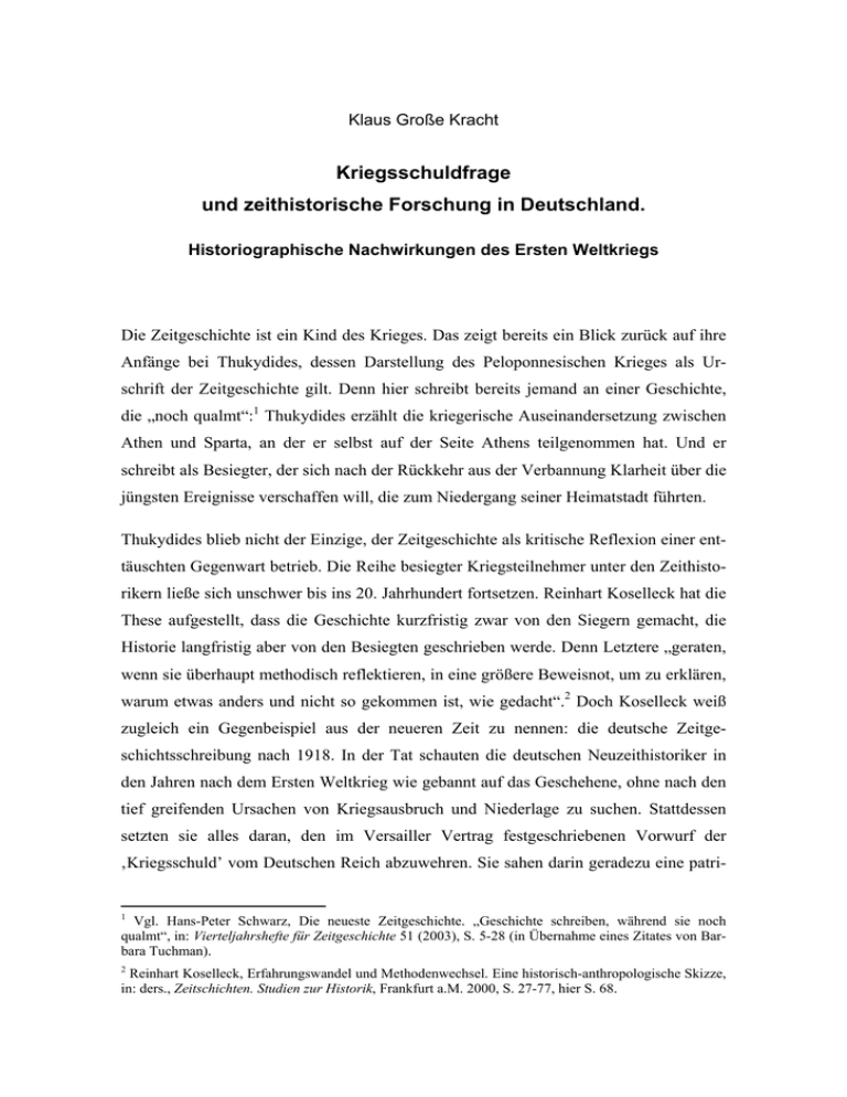 Klaus Große Kracht Kriegsschuldfrage und zeithistorische Forschung in Deutschland. Historiographische Nachwirkungen des Ersten Weltkriegs Die Zeitgeschichte ist ein Kind des Krieges. Das zeigt bereits ein Blick zurück auf ihre Anfänge bei Thukydides, dessen Darstellung des Peloponnesischen Krieges als Urschrift der Zeitgeschichte gilt. Denn hier schreibt bereits jemand an einer Geschichte, die „noch qualmt“:1 Thukydides erzählt die kriegerische Auseinandersetzung zwischen Athen und Sparta, an der er selbst auf der Seite Athens teilgenommen hat. Und er schreibt als Besiegter, der sich nach der Rückkehr aus der Verbannung Klarheit über die jüngsten Ereignisse verschaffen will, die zum Niedergang seiner Heimatstadt führten. Thukydides blieb nicht der Einzige, der Zeitgeschichte als kritische Reflexion einer enttäuschten Gegenwart betrieb. Die Reihe besiegter Kriegsteilnehmer unter den Zeithistorikern ließe sich unschwer bis ins 20. Jahrhundert fortsetzen. Reinhart Koselleck hat die These aufgestellt, dass die Geschichte kurzfristig zwar von den Siegern gemacht, die Historie langfristig aber von den Besiegten geschrieben werde. Denn Letztere „geraten, wenn sie überhaupt methodisch reflektieren, in eine größere Beweisnot, um zu erklären, warum etwas anders und nicht so gekommen ist, wie gedacht“.2 Doch Koselleck weiß zugleich ein Gegenbeispiel aus der neueren Zeit zu nennen: die deutsche Zeitgeschichtsschreibung nach 1918. In der Tat schauten die deutschen Neuzeithistoriker in den Jahren nach dem Ersten Weltkrieg wie gebannt auf das Geschehene, ohne nach den tief greifenden Ursachen von Kriegsausbruch und Niederlage zu suchen. Stattdessen setzten sie alles daran, den im Versailler Vertrag festgeschriebenen Vorwurf der ‚Kriegsschuld’ vom Deutschen Reich abzuwehren. Sie sahen darin geradezu eine patri- 1 Vgl. Hans-Peter Schwarz, Die neueste Zeitgeschichte. „Geschichte schreiben, während sie noch qualmt“, in: Vierteljahrshefte für Zeitgeschichte 51 (2003), S. 5-28 (in Übernahme eines Zitates von Barbara Tuchman). 2 Reinhart Koselleck, Erfahrungswandel und Methodenwechsel. Eine historisch-anthropologische Skizze, in: ders., Zeitschichten. Studien zur Historik, Frankfurt a.M. 2000, S. 27-77, hier S. 68. 2 otische Pflicht und kamen dieser umso lieber nach, als die Geschichtswissenschaft seit Ende des 19. Jahrhunderts ihre angestammte Bildungsfunktion für das politische Bewusstsein der führenden Schichten immer mehr zu verlieren drohte. Die Abwehrhaltung gegenüber dem Kriegsschuldvorwurf während der Weimarer Republik bildete gewissermaßen den ‚habitualen Konsens’ der deutschen Zeitgeschichtsforschung, der das geistige Sozialisationsmilieu für die nachfolgende Historikergeneration bereitstellte. Erst in den sechziger Jahren des 20. Jahrhunderts konnte der Bann dieser frühen ‚Kriegsschuldforschung’ in der bundesrepublikanischen Zeitgeschichtsschreibung definitiv durchbrochen und ein kritischerer Blick auf die Vorgeschichte des Ersten Weltkriegs durchgesetzt werden. Der Begriff der „Zeitgeschichte“ blieb von den Debatten um die Kriegsschuldfrage in Deutschland nicht unberührt. Zeitgeschichte als nachhistoristische Alternative Bekanntlich spielten die deutschen Neuzeithistoriker im ideologischen „Kulturkrieg“ der Jahre 1914-1918 eine zentrale Rolle.3 Friedrich Meinecke, Otto Hintze, Hermann Oncken und viele andere mehr standen an der propagandistischen Heimatfront, um „die junge, kraftvoll emporgekommene Macht, die das Deutsche Reich in der politischen Welt“ nun einmal darstelle,4 gegen den „Ansturm der westlichen Demokratie“5 mit den Waffen ihrer Gelehrsamkeit zu verteidigen. „Deutschland ist der Held und der Gegenstand dieses Krieges“, so brachte es der Freiburger Neuzeithistoriker Erich Marcks auf den Punkt: „Es ist der alte Strom unserer und der europäischen Geschichte, heute breiter als jeder frühere Kampf, aber es ist die Fortsetzung der alten Kämpfe, von 1700 und 1760 und 1800 […]. Ein großer Zusammenhang umschließt all dieses Völkerringen und trägt uns heute hoch empor, auf die Höhe der Notwendigkeit und des Lebenskampfes: 3 Vgl. Christoph Cornelißen, Politische Historiker und deutsche Kultur. Die Schriften von Georg von Below, Hermann Oncken und Gerhard Ritter im Ersten Weltkrieg, in: Wolfgang J. Mommsen (Hg.), Kultur und Krieg: Die Rolle der Intellektuellen, Künstler und Schriftsteller im Ersten Weltkrieg, München 1996, S. 119-142; Ernst Schulin, Weltkriegserfahrung und Historikerreaktion, in: ders./Wolfgang Küttler/Jörn Rüsen (Hg.), Geschichtsdiskurs Bd. 4: Krisenbewußtsein, Katastrophenerfahrung und Innovation 1880-1945, Frankfurt 1997, S. 165-188. 4 Otto Hintze/Friedrich Meinecke/Hermann Oncken/Hermann Schumacher, Vorwort, in: dies. (Hg.), Deutschland und der Weltkrieg, Leipzig/Berlin 1915, IIIf. 5 Ernst Troeltsch, Der Ansturm der westlichen Demokratie, in: Adolf von Harnack u.a., Die deutsche Freiheit. Fünf Vorträge, Gotha 1917, S. 79-113. 3 er muß sein, er geht um alles, um Vergangenheit und Zukunft, er reißt uns mit sich, bis zum Äußersten unserer Kraft, er ist uns heilig.“6 Auf einmal, so musste es scheinen, empfing die Geschichtswissenschaft, die sich in den Jahren vor dem Krieg immer wieder dem Vorwurf bloßen Spezialistentums und lebensferner Fragestellungen ausgesetzt sah, einen neuen Impuls aus der politischen Konstellation der Gegenwart. Den Preis, den sie dafür bezahlte, war jedoch häufig genug eine ideologische Trübung des historischen Blicks und eine nationalistische Voreingenommenheit, der sich selbst jene Historiker, die wie Friedrich Meinecke die „tiefe Ehrfurcht vor den Tatsachen und Quellen“ anmahnten, nicht völlig entziehen konnten.7 Auch ihn, so schrieb Meinecke 1916, habe „der Krieg auf den allgemeinen Kampfplatz der nationalen Kräfte gerufen“.8 Doch habe er feststellen müssen, dass die Historie dem deutschen Volk nicht mehr das Gleiche bedeute wie in den Zeite