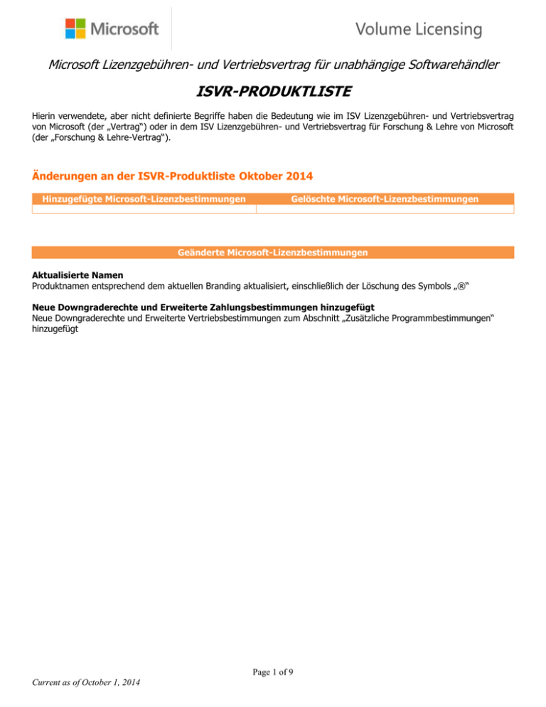 Microsoft Lizenzgebühren- und Vertriebsvertrag für unabhängige Softwarehändler ISVR-PRODUKTLISTE Hierin verwendete, aber nicht definierte Begriffe haben die Bedeutung wie im ISV Lizenzgebühren- und Vertriebsvertrag von Microsoft (der „Vertrag“) oder in dem ISV Lizenzgebühren- und Vertriebsvertrag für Forschung & Lehre von Microsoft (der „Forschung & Lehre-Vertrag“). Änderungen an der ISVR-Produktliste Oktober 2014 Hinzugefügte Microsoft-Lizenzbestimmungen Gelöschte Microsoft-Lizenzbestimmungen Geänderte Microsoft-Lizenzbestimmungen Aktualisierte Namen Produktnamen entsprechend dem aktuellen Branding aktualisiert, einschließlich der Löschung des Symbols „®“ Neue Downgraderechte und Erweiterte Zahlungsbestimmungen hinzugefügt Neue Downgraderechte und Erweiterte Vertriebsbestimmungen zum Abschnitt „Zusätzliche Programmbestimmungen“ hinzugefügt Page 1 of 9 Current as of October 1, 2014 D) Informationen zum Produktschlüssel C) Produktmigrationsgewährungen B) Elektronischer Download A) Zus. Produktbestimmungen Produktliste* Name des Produkts Access 2013 BizTalk Server 2013 R2 Branch, Standard und Enterprise Edition BizTalk Server 2013 R2 Enterprise Edition (Laufzeitbeschränkte Verwendung) BizTalk Server 2013 R2 Standard Edition (Laufzeitbeschränkte Verwendung) Microsoft Dynamics CRM Server 2013 Edition Excel 2013 Exchange Server Standard und Enterprise 2013 Forefront Identity Manager 2010 R2 InfoPath 2013 Lync Server 2013 MapPoint 2013 MapPoint Fleet 2013 Microsoft Office Audit and Control Management Server 2013 Office Multi-Language Pack 2013 Office Professional Plus 2013 OneNote 2013 Outlook 2013 PowerPoint 2013 Project Professional 2013 Project Server 2013 Project Standard 2013 Publisher 2013 SharePoint Server 2013 SQL Server 2014 Standard Core und Enterprise Core Edition SQL Server 2014 Standard und Business Intelligence Edition SQL Server 2014 Standard und Business Intelligence Edition (Laufzeitbeschränkte Verwendung) System Center 2012 R2 Configuration Manager System Center 2012 R2 Client Management Suite System Center 2012 R2 Datacenter System Center 2012 R2 Standard Visio Professional 2013 Visio Standard 2013 Visual Studio Premium 2013 Visual Studio Professional 2013 Visual Studio Ultimate 2013 Visual Studio Test Professional 2013 Visual Studio Team Foundation Server 2013 CAL für Windows Server 2012-Remotedesktopdienste Word 2013 x m x x m x x s x x x x x x x x x Page 2 of 9 x x x x x x x x m m m m m s m m s m m x x x x x x x *Für die Positionen A, B, C und D in der rechten Spalte gelten die zusätzlichen Bestimmungen in den Abschnitten A - D unten. Current as of October 1, 2014 s m s x r m A) Zusätzliche Produktbestimmungen 1. Desktop-Anwendungsprodukte des Microsoft Office-Systems. Die folgenden zusätzlichen Anforderungen gelten für Ihre Verwendung Lizenzierter Office-Desktop-Anwendungsprodukte (ausgenommen Office Multi-Language Pack 2013, Project Professional 2013 und Visio 2013): Maximale Anzahl qualifizierter Desktops. Sie sind berechtigt, Endbenutzern die mit der Vereinheitlichten Lösung Integrierten Office-Produkte mit einer beliebigen Anzahl qualifizierter Desktops anzubieten. Wenn Sie Endbenutzern mit mindestens 250 qualifizierten Desktops eine solche Vereinheitlichte Lösung anbieten, darf die Vereinheitliche Lösung nur auf nicht qualifizierten Desktops installiert und verwendet werden, und die Gesamtanzahl der auf nicht qualifizierten Desktops installierten Vereinheitlichten Lösungen darf 25 % der Gesamtanzahl qualifizierter und nicht qualifizierter Desktops bei dem jeweiligen Endbenutzer nicht überschreiten. „Qualifizierter Desktop“ bedeutet Desktop-PCs, tragbare Computer, Arbeitsstationen oder ähnliche Geräte, die vom oder zugunsten des Endbenutzers und seiner Verbundenen Unternehmen, die über eine Lizenz zur Verwendung der Vereinheitlichten Lösung verfügen, verwendet werden. Der Begriff „Qualifizierte Desktops“ umfasst jedoch nicht: (i) Computer, die als Server bestimmt sind und nicht als PCs verwendet werden, (ii) Systeme, die NUR für die Ausführung von Unternehmenssoftware (z. B. ein Buchhaltungs- oder Buchführungsprogramm, das von einem Buchhalter verwendet wird, oder ein CAD-Programm, das von einem Ingenieur oder Architekten verwendet wird) dediziert sind, oder (iii) Systeme, auf denen ein eingebettetes Betriebssystem ausgeführt wird (z. B. Windows 9.x Embedded, Windows XP Embedded). Klarstellungen zur Masterkopie. Ungeachtet anderer Bestimmungen des Vertrages und/oder Forschung & Lehre-Vertrages für Office-Desktop-Anwendungsprodukte (ausgenommen Office Multi-Language Pack 2013) sind Sie verpflichtet, für jeweils 50 Lizenzen der Office-Produkte, die Sie in Ihre vereinheitlichte Lösung integriert vertreiben, eine Masterkopie der Office-Produkte über Microsoft Worldwide Fulfillment zu erwerben. Sie dürfen die Masterkopien nur zu dem Zweck verwenden, die Office-Produkte für die Integration und den Vertrieb Ihrer Vereinheitlichten Lösung zu kopieren. Wir stellen Ihnen Kontakt- und sonstige Informationen für Microsoft Worldwide Fulfillment bereit. 2. Microsoft MapPoint 2013/Fleet 2013 Mapping Kits. Die folgenden Lizenzierten Produkte sind nicht zur Nutzung in oder Lieferung nach Argentinien, Armenien, Aserbaidschan, China, Guyana, Indien, Iran, Israel, Japan, Korea (Süd- und Nordkorea), Kuba, Marokko, Myanmar (Burma), Nordkorea, Pakistan, Palästinensergebiete (Westjordanland/Gazastreifen), Russland, Serbien, Sudan, Syrien, Taiwan, Türkei, Venezuela oder Zypern autorisiert: Microsoft MapPoint 2013 Microsoft MapPoint Fleet 2013 3. CAL für Windows Server-Remotedesktopdienste. Sie dürfen CAL-Produktlizenzen für Windows ServerRemotedesktopdienste wie unten angegebenen an einen Endbenutzer lizenzieren, ohne die Produkte in Ihre Vereinheitlichte Lösung zu integrieren, vorausgesetzt: a. Sie nehmen die Microsoft-Lizenzbestimmungen für die CAL-Produkte in den jeweiligen Endbenutzervertrag auf und b. Ihre