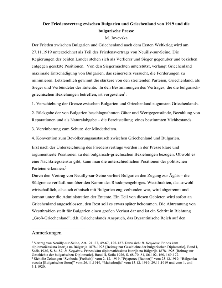 Der Friedensvertrag zwischen Bulgarien und Griechenland von 1919 und die bulgarische Presse M. Jovevska Der Frieden zwischen Bulgarien und Griechenland nach dem Ersten Weltkrieg wird am 27.11.1919 unterzeichnet als Teil des Friedensvertrags von Neuilly-sur-Seine. Die Regierungen der beiden Länder stehen sich als Verlierer und Sieger gegenüber und beziehen entgegen gesetzte Positionen. Von den Siegermächten unterstützt, verlangt Griechenland maximale Entschädigung von Bulgarien, das seinerseits versucht, die Forderungen zu minimieren. Letztendlich gewinnt die stärkere von den streitenden Parteien, Griechenland, als Sieger und Verbündeter der Entente. In den Bestimmungen des Vertrages, die die bulgarischgriechischen Beziehungen betreffen, ist vorgesehen1: 1. Verschiebung der Grenze zwischen Bulgarien und Griechenland zugunsten Griechenlands. 2. Rückgabe der von Bulgarien beschlagnahmten Güter und Wertgegenstände, Bezahlung von Reparationen und als Naturalabgabe – die Bereitstellung eines bestimmten Viehbestands. 3. Vereinbarung zum Schutz der Minderheiten. 4. Konvention zum Bevölkerungsaustausch zwischen Griechenland und Bulgarien. Erst nach der Unterzeichnung des Friedensvertrags werden in der Presse klare und argumentierte Positionen zu den bulgarisch-griechischen Beziehungen bezogen. Obwohl es eine Nachkriegszensur gibt, kann man die unterschiedlichen Positionen der politischen Parteien erkennen.2 Durch den Vertrag von Neuilly-sur-Seine verliert Bulgarien den Zugang zur Ägäis – die Südgrenze verläuft nun über den Kamm des Rhodopengebirges. Westthrakien, das sowohl wirtschaftlich, als auch ethnisch mit Bulgarien eng verbunden war, wird abgetrennt und kommt unter die Administration der Entente. Ein Teil von diesen Gebieten wird sofort an Griechenland angeschlossen, den Rest soll es etwas später bekommen. Die Abtrennung von Westthrakien stellt für Bulgarien einen großen Verlust dar und ist ein Schritt in Richtung „Groß-Griechenland”, d.h. Griechenlands Anspruch, das Byzantinische Reich auf den Anmerkungen Vertrag von Neuilly-sur-Seine, Art. 21, 27, 49-67, 125-127. Dazu sieh: B. Kesjakov. Prinos kǎm diplomatičeskata istorija na Bǎlgarija 1878-1925 [Beitrag zur Geschichte der bulgarischen Diplomatie], Band I, Sofia 1925, S. 84-87; B. Kesjakov. Prinos kǎm diplomatičeskata istorija na Bǎlgarija 1878-1925 [Beitrag zur Geschichte der bulgarischen Diplomatie], Band II, Sofia 1926, S. 68-70, 81, 86-102, 160, 169-172. 2 Sieh die Zeitungen “Svoboda [Freiheit]” vom 2. 12. 1919 ,”Prjaporec [Banner]” vom 23.12.1919, “Bǎlgarska zvezda [Bulgarischer Stern]” vom 26.11.1919, “Makedonija” vom 13.12. 1919, 29.11.1919 und vom 1. und 3.1.1920. 1 Territorien von West- und Ostthrakien, dem Smyrna-Gebiet in Kleinasien und unter Anschluss von Konstantinopel wiederherzustellen. Der bereits vollzogene Anschluss bulgarischer Territorien an Griechenland wird in der Presse nicht kommentiert. Das Interesse der Öffentlichkeit gilt Westthrakien, das unter die Administration der Entente gebracht wird, und die kleinen Gebiete (ein Teil des Bezirkes Paschmakli), die Teil Griechenlands werden, stehen nicht im Mittelpunkt des Interesses. In nationalistisch ausgerichteten Zeitungen werden Äußerungen von Venizelos aus der fremden Presse übernommen, in denen Ansprüche Griechenlands auf Westthrakien angemeldet werden3. In den Zeitungen “Trakijets” und “Zarja” wird über griechische Versuche zur Kolonisierung in zu Bulgarien gehörenden thrakischen Gebieten berichtet4. Ungeachtet dessen, wird in den Zeitungen nicht einmal die Vermutung laut, dass Westthrakien Teil Griechenlands wird, um nicht den Eindruck zu erwecken, dass dies vielleicht akzeptiert wird. Auch die Frage der wirtschaftlichen Wiedergutmachung, der Reparationen an Griechenland, wird nicht explizit diskutiert. Die Tageszeitungen widmen ihre Aufmerksamkeit eher den politischen Fragen, weil sie in höherem Maße mit dem Nationalismus der Zeit einhergehen. Wenn die Zeitungen überhaupt die wirtschaftlichen Kontakte ins Auge fassen, so geschieht dies im Zusammenhang mit den politischen Interessen. Zum Beispiel erklären die Zeitung “Dnevnik”5 und das Organ der progressiv-liberalen Partei “Bǎlgaria” 6 die schlechter gewordenen Lebensbedingungen im besetzten Thrakien damit, dass der Schmuggel aus Thrakien nach Griechenland enorm gestiegen ist. Politisches Ziel dieser Materialien ist, zu suggerieren, dass für Westthrakien keine guten Aussichten bestehen, wenn es an das “verarmte” Griechenland angeschlossen wird. Ein weiteres Beispiel für die Nicht-Beachtung der wirtschaftlichen Beziehungen zwischen den beiden Ländern sind fehlende Informationen über die Normalisierung des Handels zwischen Bulgarien und Griechenland. Wenn man den Angaben im statistischen Gesamtjahresbuch Bulgariens berücksichtigt, belaufen sich die griechischen Einfuhren nach Bulgarien für das Jahr 1919 auf 53 341 Lew, d. h. sie sind um 53 000 Lew höher im Vergleich zu dem Kriegsjahr 1917.7 Dafür aber wird die Minderheitenfrage in der bulgarischen Presse sehr eingehend behandelt. Bis zum Jahr 1919 wurden in Griechenland Personen, die zu der bulgarischen Minderheit gehören, als “slawischsprachige Hellenen” bezeichnet, d. h. Griechen, die im Laufe des Sieh die Zeitung “Zarja” vom 31.10. und 14.12.1919. Die Zeitungen “Trakijec” vom 7.12.1919 und “ Zarja” vom 25.12. 1919. 5 Sieh die Zeitung “Dnevnik” vom 16.12.1919. 6 Sieh die Zeitung “Bǎlgarija” vom 13.12.1919. 7 Sieh: Obšt Godišnik za Bǎlgarija [Gesamtes Jahrbuch für Bulgarien] Sofia 1922, S. 475. 3 4 Jahrhunderte langen Zusammenlebens mit den Bulgaren die bulgarische Sprache übernommen haben. Mit der Konvention zum Bevölkerungsaustausch anerkennt Griechenland zum ersten Mal in der Geschichte die Existenz einer bulgarischen Minderheit im Lande. Gleichzeitig ist Griechenland das erste Nachbarland Bulgariens, das sich mit Art. 46 des Vertrags von Ne