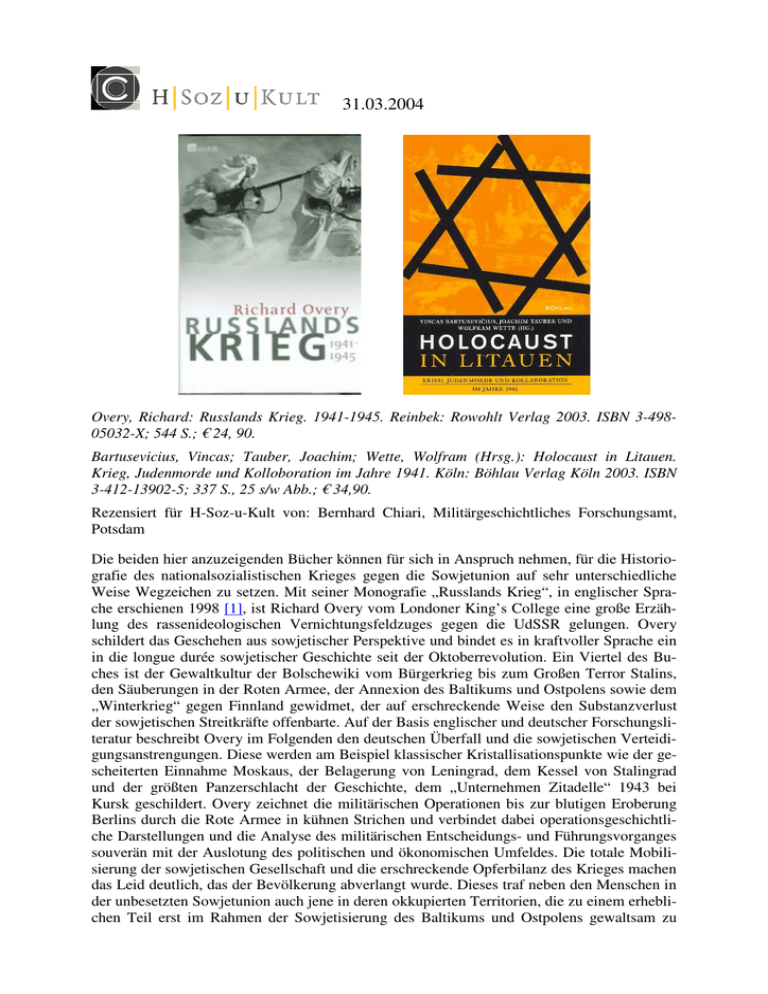31.03.2004 Overy, Richard: Russlands Krieg. 1941-1945. Reinbek: Rowohlt Verlag 2003. ISBN 3-49805032-X; 544 S.; € 24, 90. Bartusevicius, Vincas; Tauber, Joachim; Wette, Wolfram (Hrsg.): Holocaust in Litauen. Krieg, Judenmorde und Kolloboration im Jahre 1941. Köln: Böhlau Verlag Köln 2003. ISBN 3-412-13902-5; 337 S., 25 s/w Abb.; € 34,90. Rezensiert für H-Soz-u-Kult von: Bernhard Chiari, Militärgeschichtliches Forschungsamt, Potsdam Die beiden hier anzuzeigenden Bücher können für sich in Anspruch nehmen, für die Historiografie des nationalsozialistischen Krieges gegen die Sowjetunion auf sehr unterschiedliche Weise Wegzeichen zu setzen. Mit seiner Monografie „Russlands Krieg“, in englischer Sprache erschienen 1998 [1], ist Richard Overy vom Londoner King’s College eine große Erzählung des rassenideologischen Vernichtungsfeldzuges gegen die UdSSR gelungen. Overy schildert das Geschehen aus sowjetischer Perspektive und bindet es in kraftvoller Sprache ein in die longue durée sowjetischer Geschichte seit der Oktoberrevolution. Ein Viertel des Buches ist der Gewaltkultur der Bolschewiki vom Bürgerkrieg bis zum Großen Terror Stalins, den Säuberungen in der Roten Armee, der Annexion des Baltikums und Ostpolens sowie dem „Winterkrieg“ gegen Finnland gewidmet, der auf erschreckende Weise den Substanzverlust der sowjetischen Streitkräfte offenbarte. Auf der Basis englischer und deutscher Forschungsliteratur beschreibt Overy im Folgenden den deutschen Überfall und die sowjetischen Verteidigungsanstrengungen. Diese werden am Beispiel klassischer Kristallisationspunkte wie der gescheiterten Einnahme Moskaus, der Belagerung von Leningrad, dem Kessel von Stalingrad und der größten Panzerschlacht der Geschichte, dem „Unternehmen Zitadelle“ 1943 bei Kursk geschildert. Overy zeichnet die militärischen Operationen bis zur blutigen Eroberung Berlins durch die Rote Armee in kühnen Strichen und verbindet dabei operationsgeschichtliche Darstellungen und die Analyse des militärischen Entscheidungs- und Führungsvorganges souverän mit der Auslotung des politischen und ökonomischen Umfeldes. Die totale Mobilisierung der sowjetischen Gesellschaft und die erschreckende Opferbilanz des Krieges machen das Leid deutlich, das der Bevölkerung abverlangt wurde. Dieses traf neben den Menschen in der unbesetzten Sowjetunion auch jene in deren okkupierten Territorien, die zu einem erheblichen Teil erst im Rahmen der Sowjetisierung des Baltikums und Ostpolens gewaltsam zu 2 Bürgern der UdSSR gemacht worden waren. Auf etwa 40 Seiten subsumiert Overy die deutsche Judenvernichtung, einheimische Kollaboration und verschiedene Formen des bewaffneten Widerstands zum „Kampf im Innern“ (S. 201-239). Dem neuen Feindbild Stalins nach Kriegsende, der brutalen Verfolgung von mehr als 5 Millionen in den Osten „repatriierter“ Sowjetbürger, den spätstalinistischen Säuberungen und der Brechung „nationalistischen Widerstandes“ vor allem im Baltikum, in Polen und in der Ukraine ist ein eigenes Kapitel gewidmet. Overy erteilt der „Präventivkriegsthese“ über konkrete Angriffsabsichten der Sowjetunion gegenüber dem Deutschen Reich eine klare Absage. Die erkenntnisleitende Frage, wie die Sowjetunion nach Jahren des Terrors und des Kriegs im Inneren den Sieg über die deutsche Wehrmacht erringen konnte, beantwortet er mit dem Verweis auf von Stalin nach dem Desaster der ersten Kriegswochen entwickelte Führungsqualitäten, die Leistungen einer neuen Kriegsgeneration militärischer Führer sowie auf die Leidensfähigkeit und den Patriotismus der Bevölkerung. Overy beschreibt die sowjetischen Rüstungsanstrengungen, die Verlagerung kriegswichtiger Betriebe nach Osten, die personelle Mobilmachung und die rücksichtslose Brechung jeder Form von Widerstand im Innern als Voraussetzungen für den sowjetischen Sieg. Besonders dem deutschen Leser wird auffallen, wie wenig sich Overy bei der Bewertung des Stalinschen Terrorregimes von der Dimension der deutschen Verbrechen in der UdSSR beeindrucken lässt. Die Darstellung, ergänzt durch eindrucksvolles Fotomaterial, vermittelt schlüssige Erklärungsmuster für den sowjetischen Existenzkampf. Overy hat freilich in Kauf genommen, in seinem Überblick vieles generalisierend, manches vereinfachend darzustellen. So wird der sowjetische Terror zwar als eine Grunderfahrung der ersten Jahrhunderthälfte benannt, bezüglich seiner Opfer aber kaum spezifiziert und beispielsweise nicht in seiner nationalen Dimension bzw. als Machtinstrument der Führung im Kampf des Zentrums um die sowjetische Peripherie gezeigt. „Das sowjetische Volk“ habe der Entstalinisierung bedurft, um „den Krieg als seinen Krieg zu begreifen und nicht als Stalins Krieg“ (S. 490). Ein schärferer Blick auf die sowjetische Peripherie und auf die unterschiedlichen historischen Vorerfahrungen in der Sowjetunion und vor allem in den kurz vor dem deutschen Überfall annektierten Gebieten hätte gezeigt, dass es gerade die Opfer des Stalinismus waren, die es der deutschen Besatzungsmacht leicht und der sowjetischen Partisanenbewegung schwer machten, den von Overy in aller Brutalität geschilderten Kampf in den besetzten Gebieten zu führen. Das neue Weltkriegswerk der Russischen Akademie der Wissenschaften, das übrigens die Weltkriege erstmals als Epocheneinheit abhandelt, ist hier schon wesentlich weiter.[2] Overy handelt den Krieg im Krieg und nach dem Krieg, den der NKVD bis in die 50er-Jahre in den Ukrainischen und Weißrussischen Sowjetrepubliken, im Baltikum und in Polen gegen „nationalistischen Abschaum“ und „Vaterlandsverräter“ führte, und der im Übrigen in den Nachkriegsjahren selbst Verteidiger etwa der „Heldenstadt“ Leningrad traf, die den paranoiden Argwohn des alternden Diktators erweckten, auf nicht einmal zwei Seiten ab (S. 470f.). Gerade die brutale Resowjetisierung nach Kriegsende macht aber die Probleme deutlich, mit denen die sowjetische Füh