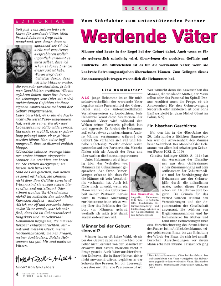 D O S S I E R E D I T O R I A L Vom Störfaktor zum unterstützenden Partner Seit fast zehn Jahren leite ich Kurse für werdende Väter. Mein Freund Johannes fragt mich manchmal, was daran denn so spannend sei: Ob ich nicht mal was Neues ausprobieren wolle? Eigentlich erstaunt es mich selbst, dass ich schon so lange Lust an dieser Arbeit habe. Woran liegt das? Vielleicht daran, dass ich hier Männer erlebe, die von sehr persönlichen, ja intimen Geschichten erzählen: Wie sie erfahren haben, dass ihre Partnerin schwanger war. Oder mit welch ambivalenten Gefühlen sie ihrer eigenen Anwesenheit während der Geburt entgegensehen. Einer berichtet, dass ihn die Nachricht «Du wirst Papi» umgehauen hat, weil sie seiner Berufs- und Lebensplanung völlig widersprach. Ein anderer erzählt, dass er jahrelang gebangt habe, ob er je Vater werden könne. Nun sei er hoffnungsvoll, dass es diesmal endlich klappe. Glückliche Männer, traurige Männer, stolze Männer, skeptische Männer. Sie erzählen, sie hören zu. Sie stellen Rückfragen; sie lassen sich berühren. Sind das die gleichen, von denen es sonst oft heisst, sie könnten nicht über ihre Gefühle sprechen? Warum sind sie ausgerechnet hier so offen und mitteilsam? Oder stimmt an dem Vor-Urteil etwas nicht? Ist vielleicht das männliche Sprechen einfach – anders? Als ich vor elf und vor sechs Jahren selbst Vater wurde, war ich sehr froh, dass ich im Geburtsvorbereitungskurs und im Gebärsaal Hebammen begegnete, die mir viel Respekt entgegenbrachten. Mir – mitsamt meinem Glück, meiner Nachdenklichkeit, meinen Fragen, meiner Ambivalenz. Solche Hebammen tun gut. Mir und anderen Vätern. Werdende Väter Hubert Kössler-Ackaert 4 Schweizer Hebamme 11/2004 Sage-femme suisse Männer sind heute in der Regel bei der Geburt dabei. Auch wenn es für sie gelegentlich schwierig wird, überwiegen die positiven Gefühle und Eindrücke. Am hilfreichsten ist es für die werdenden Väter, wenn sie konkrete Betreuungsaufgaben übernehmen können. Zum Gelingen dieses Zusammenspiels tragen wesentlich die Hebammen bei. Lisa Bammatter* Wer wünscht denn die Anwesenheit des Mannes, die werdende Mutter, der Mann selbst oder das Personal im Spital? Daraus resultiert auch die Frage, ob die Anwesenheit für den Geburtsvorgang förderlich oder hinderlich ist oder ohne Einfluss bleibt (s. dazu Michel Odent im Fokus, S. 9). A L S junge Hebamme ist es für mich selbstverständlich: der werdende Vater begleitet seine Partnerin bei der Geburt. Dabei sind die unterschiedlichsten Verhaltensweisen zu beobachten. Jede Hebamme kennt diese Situationen: der werdende Vater wird während den Wehen seiner Partnerin plötzlich laut Ein bisschen Geschichte und aggressiv. Er fordert die Hebamme Bei den bis in die 40er-Jahre des auf, sofort etwas zu unternehmen. Andere Männer verstummen während der 20. Jahrhunderts üblichen HausgeburGeburt. Sie verhalten sich still und bei- ten war die Anwesenheit des Mannes nahe unbeteiligt. Wieder andere reden keine Seltenheit. Der Mann half der Hebpausenlos auf ihre Partnerin ein. Manche amme, vor allem bei schwierigen Geburfühlen sich als Anwalt der Frau und ten (Favre 1982, S. 110). Gemäss Bullinger (2000, S. 111) hat überwachen die Betreuungspersonen. der Ausschluss der EhemänUnter Hebammen wird häuner aus dem Gebärzimmer fig über das Verhalten von einen Zusammenhang mit dem Männern im Gebärzimmer geAufkommen der Geburtsmedisprochen. Aus ihren Bemerzin und der Verdrängung der kungen erkenne ich, dass für Hebammen aus der Geburtsdie Männer oft kein Verständhilfe durch die männlichen nis vorhanden ist. Auch ich Ärzte, wobei dieser Prozess fühle mich unwohl, wenn ein schon im 14. Jahrhundert beMann während der Geburtsarbeit seiner Partnerin nervös Lisa Bammatter, Li- gann. Die Gründe für das wird. In meiner Ausbildung thografin, Hebamme, Verbot wurden laufend den HFG Stufe 1 in Geburtszur Hebamme habe ich zu we- hilfe, Kursleiterin Ge- Veränderungen und der Arnig über das Erlebnis der Ge- burtsvorbereitung und gumentation der Gesellschaft burt von Männern gelernt, Rückbildung, arbeitet in angepasst. Sie reichten von der Gebärabteilung eiHygienemassnahmen und Inweshalb ich mich jetzt damit nes Regionalspitals. fektionsrisiko für Mutter und auseinandersetzen will. Kind über Befürchtungen über eine Verschlechterung des Sexuallebens Männer bei der Geburt: des Paares beim Anblick des Mannes seisinnvoll? ner gebärenden Frau, bis zur Erhaltung Männer haben oft keine Wahl, ob sie der Würde der Frau, die sich bei unwillbei der Geburt dabei sein möchten oder kürlichen Ausscheidungen vor ihrem lieber nicht, es wird von der Gesellschaft Mann schämen müsste. Tatsächlich ging erwartet und darum meistens nicht in Frage gestellt. Auch Väter aus hier fremden Kulturen, die in ihrer Heimat sicher * Lisa Sabina Bammatter, Väter bei der Geburt. Das Geburtserlebnis der Väter – Aufgaben der Hebamnicht anwesend wären, begleiten in der men gegenüber dem werdenden Vater. Einzelarbeit Schweiz ihre Frauen. Ich bin überzeugt, HFG Stufe 1, Schwerpunkt Geburtshilfe. Aarau, Juni dass dies nicht für alle Paare sinnvoll ist. 2003. im Gebärzimmer es den Ärzten wohl darum, ihre uneingeschränkte Expertenmacht jeder Kontrolle zu entziehen (Bullinger 2000, S. 112). In vielen Spitälern der Siebzigerjahre war nur den Frauen mit einer privaten Krankenversicherung die Begleitung durch ihre Männer erlaubt, da diese Frauen in einem separaten Zimmer gebären konnten. Alle anderen Frauen gebaren in Kreisssälen, wo die Gebärbetten nur durch Vorhänge voneinander getrennt waren und die Anwesenheit von Ehemännern nicht möglich war. Heute sind die werdenden Väter selbst im Operationssaal bei der Kaiserschnittgeburt dabei. Bei extremen Notfallsituationen, in denen eine eiligst durchgeführte Vollnarkose notwendig ist, möchte niemand, auch ich als Hebamme nicht, den Partner der Gebärenden mit dabei haben. Dann besteht keinerlei Gelegenhei