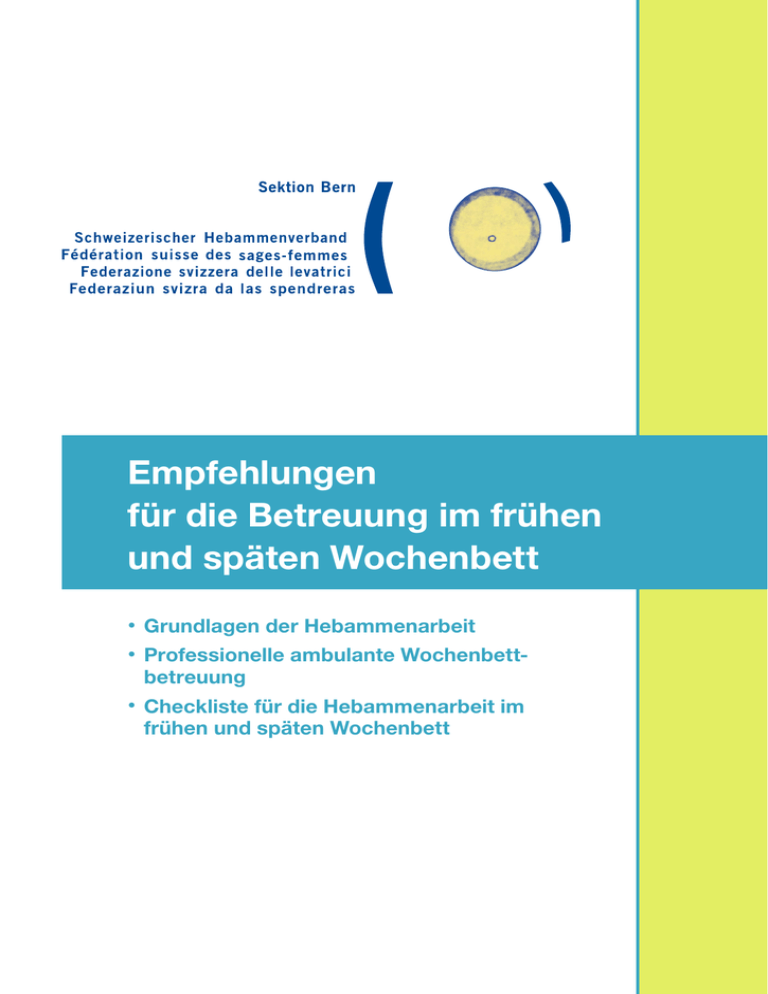 Empfehlungen für die B ­ etreuung im frühen und späten Wochenbett • Grundlagen der Hebammenarbeit • Professionelle ambulante Wochenbett­ betreuung • Checkliste für die Hebammenarbeit im ­frühen und späten Wochenbett Impressum Herausgeberin Sektion Bern Schweizerischer Hebammenverband SHV 3000 Bern www.bernerhebamme.ch [email protected] Autorinnen Sabine Graf, Boll, [email protected] (Kapitel 1 bis 6) Anja Hurni, Bern, [email protected] (Kapitel 3 und 4) Lektorat Layout Matthias Hui, Bern SatzPunkt, Hanspeter Walser, Bern 1. Auflage Bern, April 2014 alle Rechte vorbehalten © 2014 SHV Sektion Bern Die Hebammenempfehlungen werden alle zwei Jahre aktualisiert, erstmals 2016 und bei Bedarf früher. Inhalt 1 Einleitung und Hintergrund ���������������������������������������������������������������������������������������������������������������������������������� 4 1.1 Empfehlungen für Hebammen – eine Notwendigkeit ��������������������������������������������������������������������������������������� 4 1.2 Empfehlungen für die Wochenbettbetreuung – Vorgehensweise und Gliederung ������������������������������������������ 5 1.3Literatur���������������������������������������������������������������������������������������������������������������������������������������������������������������� 6 2 Grundlagen der Hebammenarbeit ���������������������������������������������������������������������������������������������������������������������� 7 2.1Einleitung ������������������������������������������������������������������������������������������������������������������������������������������������������������� 7 2.2 In der Hebammenarbeit verwendete Konzepte ������������������������������������������������������������������������������������������������ 7 2.3 Die Aufgabe und Rolle der Hebamme: Betreuung als gekonnte Nicht-Intervention �������������������������������������� 11 2.4 Das Spezifische der Hebammenarbeit: Hebammenkompetenzen und -fertigkeiten ������������������������������������ 12 2.5Die ganzheitliche Betreuung durch die Hebamme: Vernetzung mit und Abgrenzung zu anderen Fachpersonen und -disziplinen im Gesundheitswesen �������������������������������������������������������������������� 13 2.6 Die Qualitätssicherung der professionellen Hebammenarbeit 2.7 Die Problematik des heutigen Versorgungsmodells und die Stärkung der Hebammenrolle ������������������������ 16 ���������������������������������������������������������������������� 14 2.8Literatur ������������������������������������������������������������������������������������������������������������������������������������������������������������� 18 3Professionelle ambulante ­Wochenbettbetreuung ��������������������������������������������������������������������������������������� 20 3.1Einleitung ���������������������������������������������������������������������������������������������������������������������������������������������������������� 20 3.2 «Es ist wichtig, wie wir geboren werden»: Die Bedeutung der Zeit nach der Geburt �����������������������