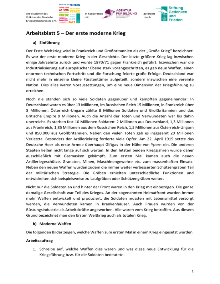 Arbeitsblätter des Volksbundes Deutsche Kriegsgräberfürsorge e.V. in Kooperation mit gefördert durch Arbeitsblatt 5 – Der erste moderne Krieg a) Einführung Der Erste Weltkrieg wird in Frankreich und Großbritannien als der „Große Krieg“ bezeichnet. Es war der erste moderne Krieg in der Geschichte. Der letzte größere Krieg lag inzwischen einige Jahrzehnte zurück und wurde 1870/71 gegen Frankreich geführt. Inzwischen war die Industrialisierung auf europäischer Ebene stark vorangeschritten, es gab neue Waffen, einen enormen technischen Fortschritt und die Forschung feierte große Erfolge. Deutschland war nicht mehr in einzelne kleine Fürstentümer aufgeteilt, sondern inzwischen eine vereinte Nation. Dies alles waren Voraussetzungen, um eine neue Dimension der Kriegsführung zu erreichen. Noch nie standen sich so viele Soldaten gegenüber und kämpften gegeneinander: In Deutschland waren es über 13 Millionen, im Russischen Reich 15 Millionen, in Frankreich über 8 Millionen; Österreich-Ungarn zählte 8 Millionen Soldaten und Großbritannien und das Britische Empire 9 Millionen. Auch die Anzahl der Toten und Verwundeten war bis dahin unerreicht. Es starben fast 10 Millionen Soldaten: 2 Millionen aus Deutschland, 1,3 Millionen aus Frankreich, 1,85 Millionen aus dem Russischen Reich, 1,5 Millionen aus Österreich-Ungarn und 850.000 aus Großbritannien. Neben den vielen Toten gab es insgesamt 20 Millionen Verletzte. Besonders der Artilleriekrieg forderte viele Opfer. Am 22. April 1915 setzte das Deutsche Heer als erste Armee überhaupt Giftgas in der Nähe von Ypern ein. Die anderen Staaten ließen nicht lange auf sich warten. In den letzten beiden Kriegsjahren wurde daher ausschließlich mit Gasmasken gekämpft. Zum ersten Mal kamen auch die neuen Artilleriegeschütze, Granaten, Minen, Maschinengewehre etc. zum massenhaften Einsatz. Neben den neuen Waffen wurden zudem die immer weiter verbesserten Schützengräben Teil der militärischen Strategie. Die Gräben erhielten unterschiedliche Funktionen und entwickelten sich beispielsweise zu Laufgräben oder Schützengräben weiter. Nicht nur die Soldaten an und hinter der Front waren in den Krieg mit einbezogen. Die ganze damalige Gesellschaft war Teil des Krieges. An der sogenannten Heimatfront wurden immer mehr Waffen entwickelt und produziert, die Soldaten mussten mit Lebensmittel versorgt werden, die Verwundeten kamen in Krankenhäuser. Auch Frauen wurden von der Rüstungsindustrie als Arbeitskräfte angeworben. Alle waren vom Krieg betroffen. Aus diesem Grund bezeichnet man den Ersten Weltkrieg auch als totalen Krieg. b) Moderne Waffen Die folgenden Bilder zeigen, welche Waffen zum ersten Mal in einem Krieg eingesetzt wurden. Arbeitsauftrag 1. Schreibe auf, welche Waffen dies waren und was diese neue Entwicklung für die Kriegsführung bzw. für die Soldaten bedeutete. 1 Arbeitsblätter des Volksbundes Deutsche Kriegsgräberfürsorge e.V. in Kooperation mit gefördert durch Abbildung 1: Commonwealth-Soldaten beim Laden des Livens Gas-Granaten-Werfers (Quelle: Wikimedia Commons) Abbildung 2: Luftaufnahme eines deutschen Gasangriffs, Öffnen von Gasbehältern. Links Gaswolken, die vom Wind weitergetrieben werden, rechts die auf den Angriff wartende Infanterie. (1916). Der erste große Gasangriff in der Geschichte erfolgte im April 1915 durch das Deutsche Heer in Flandern. (Quelle: Bundesarchiv, Wikimedia Commons) via Abbildung 3: Maschinengewehr in der Wytschaete-Stellung, 182. Infanterie-Regiment, Winter 1915/16, Schützengraben. (Quelle: Webseite „100 Jahre Erster Weltkrieg“) 2 Arbeitsblätter des Volksbundes Deutsche Kriegsgräberfürsorge e.V. in Kooperation mit gefördert durch Abbildung 4: Soldaten des Portugiesischen Expeditionskorps beim Laden eines Stokes-Mörsers, um 1918. (Quelle: Wikimedia Commons) Abbildung 5: „Dicke Bertha“ – Artilleriegeschütz (Quelle: Wikipedia) Abbildung 6: Im ersten Weltkrieg entwickelten die britische und die französische Armeen die ersten Panzer. Auch Flugzeuge kamen erstmals zum Einsatz, sowohl an der Front als auch für Luftbildaufnahmen. (Britischer Panzer mit Flugzeugunterstützung) (Quelle: Wikipedia) 3 Arbeitsblätter des Volksbundes Deutsche Kriegsgräberfürsorge e.V. in Kooperation mit gefördert durch Abbildung 7: Einsatz von U-Booten (U-Boot des Deutschen Heeres) (Quelle: Wikimedia Commons) Abbildung 8: Deutsche Hochseeflotte. Gegen die traditionelle Übermacht der britischen Seeflotte hatte die deutsche Marine keine Chance sich durchzusetzen. Die britische Armee blockierte von Ende 1914 bis zum Kriegsende die Zufahrtswege in der Nordsee zu deutschen Häfen. Die Blockade hatte direkte Auswirkungen auf die Rohstoffund Materialversorgung in Deutschland. (Quelle: Wikimedia Commons) Abbildung 9: Schützengraben an der Hooge-Stellung (Quelle: Wikimedia Commons) 4 Arbeitsblätter des Volksbundes Deutsche Kriegsgräberfürsorge e.V. in Kooperation mit gefördert durch Abbildung 10: Englischer Schützengraben bei Warneton im Mai 1918. (Quelle: Webseite „100 Jahre Erster Weltkrieg“) c) Die sogenannte Heimatfront In einem modernen Krieg war die Zulieferung von Waffen, die Rüstungsindustrie, die Weiterentwicklung von neuen Waffen und Versorgung der Front mit medizinischem Material und Nahrungsmitteln sehr wichtig. Hierfür war unerlässlich, dass die sogenannte Heimatfront ihren „Kriegsbeitrag“ leistete. So wurden Frauen vor allem von der Rüstungsindustrie angeworben. Sie übernahmen sämtliche Tätigkeiten der Männer und ihre Familienrolle veränderte sich. Rüstungsindustrie und Heimatfront Abbildung 11: Deutscher Rüstungsbetrieb – Munitionsfabrik (1916). (Quelle: Bundesarchiv, via Wikimedia Commons) 5 Arbeitsblätter des Volksbundes Deutsche Kriegsgräberfürsorge e.V. in Kooperation mit gefördert durch Abbildung 12: Frauen arbeiten in Rüstungsbetrieb (1915). einem englischen (Quelle: Wikimedia Commons) Arbeitsauftrag 2. Frauen arbeiteten vermehrt für die R