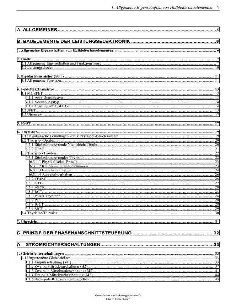 1. Allgemeine Eigenschaften von Halbleiterbauelementen 1 A. ALLGEMEINES .......................................................................................................................4 B. BAUELEMENTE DER LEISTUNGSELEKTRONIK ................................................................6 1. Allgemeine Eigenschaften von Halbleiterbauelementen....................................................................................................... 6 2. Diode ......................................................................................................................................................................................... 7 2.1 Allgemeine Eigenschaften und Funktionsweise................................................................................................................... 7 2.2 Leistungsdioden................................................................................................................................................................. 10 3. Bipolartransisistor (BJT) ...................................................................................................................................................... 11 3.1 Allgemeine Funktion ......................................................................................................................................................... 11 4. Feldeffekttransistor ............................................................................................................................................................... 13 4.1 MOSFET ........................................................................................................................................................................... 13 4.1.1 Anreicherungstyp ....................................................................................................................................................... 13 4.1.2 Verarmungstyp........................................................................................................................................................... 14 4.1.4 Leistungs-MOSFETs.................................................................................................................................................. 14 4.2 JFET .................................................................................................................................................................................. 15 4.3 Übersicht ........................................................................................................................................................................... 17 5. IGBT ....................................................................................................................................................................................... 17 6. Thyristor................................................................................................................................................................................. 19 6.1 Physikalische Grundlagen von Vierschicht-Bauelementen ............................................................................................... 19 6.2 Thyristor-Diode................................................................................................................................................................. 20 6.2.1 Rückwärtssperrende Vierschicht-Diode..................................................................................................................... 20 6.2.2 DIAC.......................................................................................................................................................................... 21 6.3 Thyristor-Trioden .............................................................................................................................................................. 22 6.3.1 Rückwärtssperrender Thyristor .................................................................................................................................. 22 6.3.1.1 Physikalisches Prinzip ........................................................................................................................................ 22 6.3.1.2 Kennlinien und Gleichungen .............................................................................................................................. 23 6.3.1.3 Einschaltverhalten............................................................................................................................................... 24 6.3.1.4 Ausschaltverhalten.............................................................................................................................................. 26 6.3.2 TRIAC ....................................................................................................................................................................... 26 6.3.3 GTO ........................................................................................................................................................................... 27 6.3.4 ASCR ......................................................................................................................................................................... 28 6.3.5 RCT............................................................................................................................................................................ 28 6.3.6 Photo-Thyristor .......................................................................................................................................................... 28 6.3.7 PUT............................................................................................................................................................................ 28 6.3.8 IGCT .........................................................................................................................