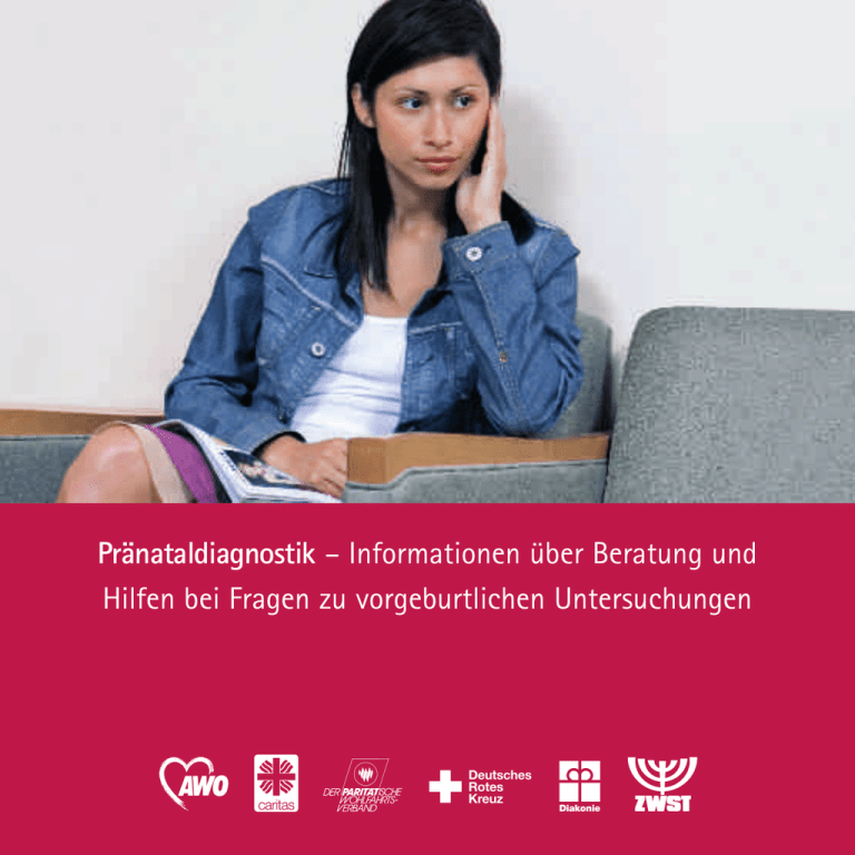 Pränataldiagnostik – Informationen über Beratung und Hilfen bei Fragen zu vorgeburtlichen Untersuchungen Inhalt Warum diese Broschüre? ................................................. 4 Wie wird unser Kind sein? – „Hauptsache gesund“? ........... 5 Guter Hoffnung sein – Trotz oder wegen Pränataldiagnostik? ................................................................... 6 Verständnis und ein anderer Blick Was Beratung leisten kann ............................................ 7 Zeit zum Nachdenken................................................................ 8 Was passiert bei der psychosozialen Beratung?.................... 9 Welche Untersuchung wofür? – Medizinische Beratung ... 10 ■ Informierte Zustimmung – Informed Consent ................. 10 ■ Recht auf Nichtwissen.......................................................... 11 Über Risiken und Hoffnungen – Humangenetische Beratung..................................................................................... 11 Beratung – auch nach der Diagnose..................................... 13 Schwangerenvorsorge...................................................... 13 Vorsorge in der gynäkologischen Praxis.............................. 13 Der Ultraschall....................................................................... 14 ■ Ergebnisse mit Fragezeichen............................................... 14 Vorsorge durch die Hebamme................................................ 15 Risikoschwangerschaft – Kein Grund zur Sorge................. 16 Mehr Gewissheit? – Zusatzleistungen in der Schwangerenvorsorge ............................................................. 17 ■ Pränataldiagnostik ............................................................ 18 Pränataldiagnostik auf eigenen Wunsch – nicht-invasive Methoden ........................................................ 19 ■ Das Frühscreening ................................................................ 19 ■ Auch hier bedeutet ein auffälliger Befund noch keine Diagnose ...................................................................... 20 Der Triple-Test ....................................................................... 21 Von Risiken und Gewissheiten............................................ 21 ■ Und wenn doch „etwas nicht stimmt“? ............................ 22 ■ Zeit des Wartens ................................................................... 23 Weiterführende invasive Untersuchungen ........................... 23 ■ Ursachen von Krankheiten und Behinderungen ............ 24 ■ Was mit Pränataldiagnostik entdeckt werden kann........ 25 ■ Wenn die Chromosomen verändert sind........................... 26 ■ ■ Vorgeburtliche Therapien ................................................. 28 Medikamente als häufigste Therapie..................................... 28 Operationen im Mutterleib sind selten ................................. 28 Unser Kind ist krank oder behindert ........................ 29 Beratungsangebote und Hilfen .............................................. 29 Vorbereitungen auf das Kind ................................................. 30 Leben mit dem Kind ................................................................ 30 Hilfen für Sie und Ihre Familie.............................................. 32 Frühförderung........................................................................... 32 Medizinische Indikation zum Schwangerschaftsabbruch.................................... 33 Abschied von einem Kind ............................................. 34 Was passiert mit meinem Kind? ............................................ 34 Anhang ................................................................................... 35 Stichwortverzeichnis ............................................................ 35 Untersuchungsmethoden im Überblick ............................. 36 ■ Schwangeren- und Familienhilfeänderungsgesetz .......... 40 ■ Hilfreiche Adressen............................................................... 41 ■ ■ 3 Warum diese Broschüre? Wie wird es sein: Das Leben mit einem Kind? Plötzlich Mutter und Vater sein. Wie viel Verantwortung kommt auf uns zu, wie viel Freude, wie viel Sorge? Werdende Eltern stellen sich viele Fragen. Eine Frage lautet: Ist mein Kind gesund? Um das festzustellen, gibt es heute eine Reihe von Untersuchungen. Die Fruchtwasserentnahme und der Ultraschall sind zwei dieser Methoden. Sie gehören zur Pränataldiagnostik (pränatal = vorgeburtlich), kurz PND. Die Pränataldiagnostik – spezielle vorgeburtliche Untersuchungen – eröffnet Möglichkeiten während der Schwangerschaft, gesundheitliche Beeinträchtigungen oder Behinderungen festzustellen. Diese Broschüre gibt Ihnen darüber hinaus einen Überblick über die Methoden der Pränataldiagnostik und die möglichen Folgen, die diese Untersuchungen für Sie und Ihr Kind haben können. Darüber hinaus finden Sie in dieser Broschüre Informationen über Beratungsangebote und wo Sie diese Hilfe und Begleitung erhalten, wenn Sie dies wünschen. Durch die Inanspruchnahme der Pränataldiagnostik können Frauen und Männer in schwierige Entscheidungssituationen geraten, da die Pränataldiagnostik schon vieles entdecken kann. Nicht immer, aber manchmal kann sie auch Heilung anbieten. HINWEIS: Im Anhang finden Sie ein Stichwortverzeichnis sowie eine tabellarische Übersicht über Methoden der Pränataldiagnostik und hilfreiche Adressen unter anderem auch von Beratungsstellen. Manche schwangere Frau weiß vielleicht nicht, ob sie diese speziellen Untersuchungen überhaupt wünscht, was sie im Einzelnen bedeuten und welche Konsequenzen sie nach sich ziehen können. Damit Sie wissen, was auf Sie zukommt, haben wir für Sie wichtige Informationen zur Pränataldiagnostik, vor allem aber zur Beratung im Zusammenhang mit Pränataldiagnostik in dieser Broschüre zusammengestellt. Denn: Ein qualif