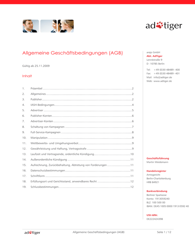 Allgemeine Geschäftsbedingungen (AGB) arejo GmbH Abt. AdTiger Lennéstraße 9 D - 10785 Berlin Gültig ab 25.11.2009 Inhalt Tel: + 49 (0)30 48489 - 400 Fax: + 49 (0)30 48489 - 401 Mail: [email protected] Web: www.adtiger.de 1. Präambel ............................................................................................................2 2. Allgemeines ........................................................................................................2 3. Publisher .............................................................................................................2 4. IASH-Bedingungen ..............................................................................................4 5. Advertiser ...........................................................................................................5 6. Publisher-Konten .................................................................................................6 7. Advertiser-Konten ...............................................................................................6 8. Schaltung von Kampagnen .................................................................................7 9. Full-Service-Kampagnen ......................................................................................8 10. Manipulation ......................................................................................................9 11. Wettbewerbs- und Umgehungsverbot .................................................................9 12. Gewährleistung und Haftung, Vertragsstrafe .......................................................9 13. Laufzeit und Vertragsende, ordentliche Kündigung ............................................10 14. Außerordentliche Kündigung ............................................................................11 15. Aufrechnung, Zurückbehaltung, Abtretung von Forderungen ............................11 16. Datenschutzbestimmungen ...............................................................................11 Handelsregister 17. Schriftform .......................................................................................................11 Amtsgericht 18. Erfüllungsort und Gerichtsstand, anwendbares Recht ........................................12 HRB 84921 19. Schlussbestimmungen.......................................................................................12 Geschäftsführung Martin Weidemann Berlin-Charlottenburg Bankverbindung Berliner Sparkasse Konto: 1913059240 BLZ: 100 500 00 IBAN: DE45 1005 0000 1913 0592 40 USt-IdNr. DE222424398 Allgemeine Geschäftsbedingungen (AGB) Seite 1 / 12 1. 2. Präambel 1.1. Die arejo GmbH bietet unter www.adtiger.de und weiteren URLs eine Plattform zur Vermarktung von Webseiten und der Schaltung von Marketingkampagnen über das Internet an (im Folgenden AdTiger). 1.2. Die Vertragspartner nehmen diese Dienstleistung als Werbender (im Folgenden Advertiser) oder Webseitenbetreiber (im Folgenden Publisher) in Anspruch. Der Vertragspartner ist voll geschäftsfähig oder wird von einem voll geschäftsfähigen gesetzlichen Vertreter vertreten. 1.3. Diese Allgemeinen Geschäftsbedingungen regeln die Zusammenarbeit zwischen AdTiger und dem Vertragspartner. 1.4. Durch die Anmeldung bei AdTiger wird ein Vertragsverhältnis zwischen AdTiger und der anmeldenden Partei begründet. Allgemeines 2.1. Es gelten die jeweils unter www.adtiger.de veröffentlichten Allgemeinen Geschäftsbedingungen. AdTiger behält sich vor, diese jederzeit zu ändern. 2.2. Änderungen der Allgemeinen Geschäftsbedingungen werden dem Vertragspartner schriftlich oder per E-Mail bekannt gegeben. Sie gelten als genehmigt, wenn der Vertragspartner nicht innerhalb einer Frist von 2 Wochen ab Bekanntgabe schriftlich oder per E-Mail widerspricht. AdTiger wird den Vertragspartner bei der Bekanntgabe auf diese Folge seines Verhaltens besonders hinweisen. Unberührt hiervon bleibt das Recht des Vertragspartners, sich wegen Änderung der Allgemeinen Geschäftsbedingungen vom Vertrag zu lösen. 2.3. Allgemeinen Geschäftsbedingungen des Vertragspartners wird ausdrücklich widersprochen, soweit sie von den nachfolgenden Bedingungen abweichen. Die abweichenden Geschäftsbedingungen des Vertragspartners werden insoweit nicht Vertragsbestandteil. Von diesen Allgemeinen Geschäftsbedingungen abweichende Bedingungen des Vertragspartners können nur dann ganz oder zum Teil Bestandteil des Vertragsverhältnisses zwischen AdTiger und dem Vertragspartner werden, wenn die Parteien dies im Einzelfall ausdrücklich vereinbaren. 3. Publisher 3.1. Der Publisher bewirbt sich mit seiner Webseite um eine Teilnahme für die Dienstleistungen von AdTiger. AdTiger behält sich das Recht vor, Bewerbungen ohne Angabe von Gründen abzulehnen. 3.2. Betreibt der Publisher mehrere Webseiten, die er durch AdTiger vermarkten lassen möchte, muss er jede Webseite einzeln anmelden. Jede weitere Webseite wird wiederum durch AdTiger geprüft und kann ggf. abgelehnt werden. 3.3. Bei der Anmeldung legt der Publisher fest, ob die Webseite exklusiv, teil-exklusiv oder nicht-exklusiv durch AdTiger vermarktet werden soll. Hierbei bedeutet a. Exklusive Vermarktung: Der Publisher platziert mindestens eine durch AdTiger verwaltete Werbefläche im sofort-sichtbaren Bereich auf seiner Webseite, wobei die Mindestvertragslaufzeit hierfür 6 Monate beträgt. Die Werbefläche ist dann im sofort-sichtbaren Bereich platziert, wenn sie bei einer Auflösung von 1280x1024 Pixel, ohne zu scrollen, sichtbar ist. b. Teil-exklusive Vermarktung: Der Publisher darf weiterhin Google-Werbung oder Werbung regionaler Kunden schalten. Lediglich das Einbauen von Werbung von anderen Vermarktern als AdTiger auf der Seite des Publishers ist nicht gestattet. Außerdem hat der Publisher einen Vermerk auf seiner Webseite einzubauen, dass die Seite exklusiv durch AdTiger vermarktet wird. c. Nicht-exklusive Vermarktung: Der Publisher bestimmt selbst, ob, wann, wo und