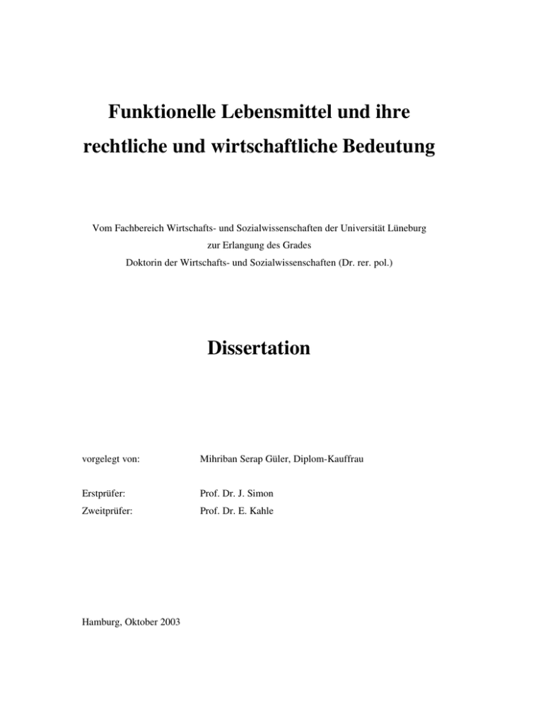 Funktionelle Lebensmittel und ihre rechtliche und wirtschaftliche Bedeutung Vom Fachbereich Wirtschafts- und Sozialwissenschaften der Universität Lüneburg zur Erlangung des Grades Doktorin der Wirtschafts- und Sozialwissenschaften (Dr. rer. pol.) Dissertation vorgelegt von: Mihriban Serap Güler, Diplom-Kauffrau Erstprüfer: Prof. Dr. J. Simon Zweitprüfer: Prof. Dr. E. Kahle Hamburg, Oktober 2003 Danksagung Mein besonderer Dank gilt Herrn Prof. Dr. J. Simon, der das Thema der Arbeit angeregt und mich unterstützt hat meinen eigenen Weg zu gehen. Vielen Dank auch an Herrn Prof. Dr. E. Kahle, der das Zweitgutachten übernommen hat. Mein ganz besonderer Dank gebührt meinem Betreuer Herrn Dr. R. Paslack für seine sehr förderliche wissenschaftliche Betreuung und sein Engagement von der ersten Stunde an. Ich danke ihm besonders für seine Motivation und positiven Gedanken während der gesamten Dauer dieser Arbeit. Ebenfalls danke ich allen, die mich auf unterschiedlichster Art und Weise unterstützt haben, insbesondere Herrn RA Dr. Moritz Hagenmeyer, Herrn RA Michael Welsch (BLL), Frau Dr. Brigitte Jähnig (AID) sowie dem Behr’s Verlag, Hamburg. Meinem lieben Lebensgefährten Martin Kohring danke ich für alles, was er für mich getan hat und die liebevollste Unterstützung während der gesamten Zeit. Sein Glaube an mich, gab mir zu jederzeit die nötige Kraft. Mein Dank an Martin lässt sich nicht in Worten ausdrücken. Meine Eltern haben meinen Ausbildungsweg vom ersten Studientag an mit ihrer ganzen Kraft begleitet und mich in jeder Situation unterstützt. Immer wieder fand auch meine Schwester in entscheidenden Phasen für mich sehr wertvolle und motivierende Worte. Der Anteil meines Lebensfährten und meiner Familie an der Ausfertigung dieser Arbeit ist unschätzbar. Der letzte Dank gilt speziell meiner lieben Mutter, die als stetiger Anlaufpunkt und durch ihre unermüdliche Unterstützung und Hilfe in intensiven und inspirierenden Gesprächen, die Grundlage für die Fertigstellung der Arbeit schaffte. Funktionelle Lebensmittel und ihre rechtliche und wirtschaftliche Bedeutung 1 Inhaltsverzeichnis Abkürzungsverzeichnis I Erster Teil Einleitung 1. Kapitel: Ausgangslage der Materie der funktionellen Lebensmittel 2. Kapitel: Gang der Untersuchung 6 10 Zweiter Teil Die staatliche Pflicht zum Schutz der Gesundheit 1. Kapitel: Gefahren im Lebensmittelbereich 13 2. Kapitel: Die staatliche Pflicht zum Schutz der Gesundheit in Deutschland 14 3. Kapitel: Das Recht auf Schutz der Sicherheit 17 4. Kapitel: Begriffsdefinition „Verbraucherschutz“ 18 Dritter Teil Funktionelle Lebensmittel - Begriffsklärung und Anwendungsbeispiele 1. Kapitel: Theoretische Ansätze 21 2. Kapitel: Basisdefinition 24 3. Kapitel: Wirkstoffe in funktionellen Lebensmitteln 25 a) 26 4. Antioxidantien b) Sekundäre Pflanzenstoffe 28 c) 29 Fettersatz- und -austauschstoffe d) Omega-3-Fettsäuren 31 e) 35 Bioaktive Peptide Kapitel: Typisierung funktioneller Lebensmittel 36 a) Produktgruppe 1: Probiotische Lebensmittelerzeugnisse 37 b) Produktgruppe 2: Präbiotische Lebensmittelerzeugnisse 42 5. Kapitel: Anwendungsbeispiele für funktionelle Lebensmittel 45 6. Kapitel: Ergebnis 52 Funktionelle Lebensmittel und ihre rechtliche und wirtschaftliche Bedeutung 2 Vierter Teil Das Wirkungsspektrum funktioneller Lebensmittel 1. Kapitel: Wissenschaftlich nachgewiesene Wirkungen funktioneller Lebensmittelerzeugnisse 53 2. Kapitel: Postulierte Wirkungen funktioneller Lebensmittelerzeugnisse 58 3. Kapitel: Toxikologische Risiken funktioneller Lebensmittelerzeugnisse 60 4. Kapitel: Ergebnis 63 Fünfter Teil Die Wirkungsnachweisverfahren für funktionelle Lebensmittel 1. Kapitel: Methodische Vorgehensweisen zum Nachweis der Wirksamkeit funktioneller Lebensmittelerzeugnisse 2. 65 Kapitel: Anforderungen an den wissenschaftlichen Nachweis der Wirksamkeit funktioneller Lebensmittelerzeugnisse 3. 70 Kapitel: Bewertung des gegenwärtigen Wissensstandes zur Wirksamkeit funktioneller Lebensmittel 72 4. Kapitel: Sicherheitsanforderungen an funktionelle Lebensmittelerzeugnisse 75 5. Kapitel: Ergebnis 79 Sechster Teil Die Marktsituation funktioneller Lebensmittel 1. Kapitel: Gegenwärtige Marktsituation funktioneller Lebensmittel 81 2. Kapitel: Generelle Entwicklungstendenzen funktioneller Lebensmittel 84 3. Kapitel: Ergebnis 86 Siebter Teil Konkretisierung des Krankheitsbegriffs 1. Kapitel: Historische Krankheits- und Gesundheitslehren a) Die Heilkunde der Naturvölker 89 89 Funktionelle Lebensmittel und ihre rechtliche und wirtschaftliche Bedeutung 3 b) Krankheitslehren in China 92 c) 97 Krankheitslehren im Alten Ägypten d) Krankheitslehren in der arabisch-islamischen Welt 100 e) Krankheitslehren in Deutschland vom Mittelalter bis zur Neuzeit 102 f) 109 Ergebnis 2. Kapitel: Präzisierung des heutigen Gesundheits- und Krankheitsbegriffs 110 3. Kapitel: Ergebnis 115 Achter Teil Das Verbot gesundheitsbezogener Werbung für funktionelle Lebensmittel 1. Kapitel: Entstehungsgeschichte des Verbotes krankheitsbezogener Werbung im deutschen Lebensmittelrecht 117 a) Werbung 119 b) Krankheit 122 c) Präzisierung des Bezuges zwischen Krankheit und Werbung 124 d) Beseitigung, Linderung oder Verhütung von Krankheiten 127 2. Kapitel: “Health Claims” - Stand der Diskussion in Deutschland 130 3. Kapitel: Diskutierte Vorschläge für die Europäische Union - Verordnung über nährwert-, wirkungs- und gesundheitsbezogene Angaben auf Lebensmitteln 4. Verordnungsentwurf SANCO/1832/2002 134 a) Ziele der Verordnung 136 b) Inhalt der Verordnung 137 c) Ablauf der Beantragung der Genehmigung 138 d) Grundsätzliche Bedenken gegen den Verordnungsentwurf 140 Kapitel: Ergebnis 141 Neunter Teil Die Abgrenzung von Lebensmitteln und Arzneimitteln 1. Kapitel: Unterschiedliche Anforderungen 143 2. Kapitel: Regelungen des Lebensmittel- und Bedarfsgegenständegesetzes (LMBG) 146 3. Kapitel: Regelungen des Arzneimittelgesetzes (AMG) 150 Funktionelle Lebensmittel und ihre r