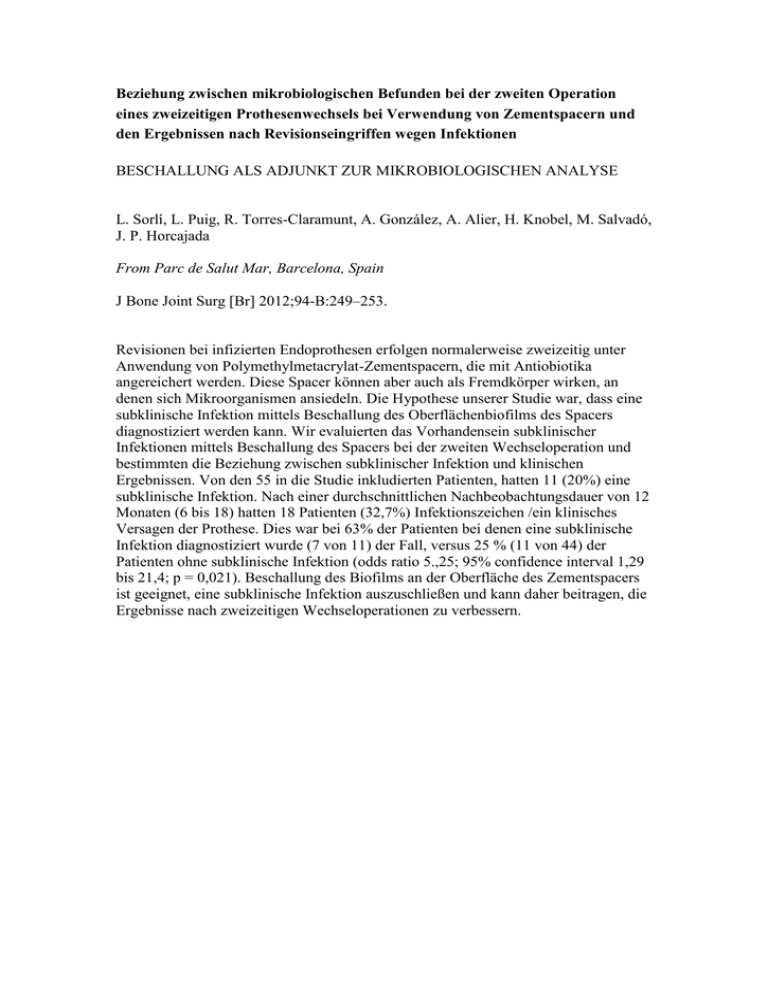 Beziehung zwischen mikrobiologischen Befunden bei der zweiten Operation eines zweizeitigen Prothesenwechsels bei Verwendung von Zementspacern und den Ergebnissen nach Revisionseingriffen wegen Infektionen BESCHALLUNG ALS ADJUNKT ZUR MIKROBIOLOGISCHEN ANALYSE L. Sorlí, L. Puig, R. Torres-Claramunt, A. González, A. Alier, H. Knobel, M. Salvadó, J. P. Horcajada From Parc de Salut Mar, Barcelona, Spain J Bone Joint Surg [Br] 2012;94-B:249–253. Revisionen bei infizierten Endoprothesen erfolgen normalerweise zweizeitig unter Anwendung von Polymethylmetacrylat-Zementspacern, die mit Antiobiotika angereichert werden. Diese Spacer können aber auch als Fremdkörper wirken, an denen sich Mikroorganismen ansiedeln. Die Hypothese unserer Studie war, dass eine subklinische Infektion mittels Beschallung des Oberflächenbiofilms des Spacers diagnostiziert werden kann. Wir evaluierten das Vorhandensein subklinischer Infektionen mittels Beschallung des Spacers bei der zweiten Wechseloperation und bestimmten die Beziehung zwischen subklinischer Infektion und klinischen Ergebnissen. Von den 55 in die Studie inkludierten Patienten, hatten 11 (20%) eine subklinische Infektion. Nach einer durchschnittlichen Nachbeobachtungsdauer von 12 Monaten (6 bis 18) hatten 18 Patienten (32,7%) Infektionszeichen /ein klinisches Versagen der Prothese. Dies war bei 63% der Patienten bei denen eine subklinische Infektion diagnostiziert wurde (7 von 11) der Fall, versus 25 % (11 von 44) der Patienten ohne subklinische Infektion (odds ratio 5.,25; 95% confidence interval 1,29 bis 21,4; p = 0,021). Beschallung des Biofilms an der Oberfläche des Zementspacers ist geeignet, eine subklinische Infektion auszuschließen und kann daher beitragen, die Ergebnisse nach zweizeitigen Wechseloperationen zu verbessern.