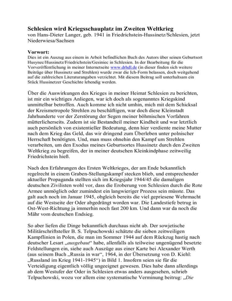Schlesien wird Kriegsschauplatz im Zweiten Weltkrieg von Hans-Dieter Langer, geb. 1941 in Friedrichstein-Hussinetz/Schlesien, jetzt Niederwiesa/Sachsen Vorwort: Dies ist ein Auszug aus einem in Arbeit befindlichen Buch des Autors über seinen Geburtsort Husynec/Hussinetz/Friedrichstein/Gesiniec in Schlesien. In der Bearbeitung für die Vorveröffentlichung in meiner Internetseite www.drhdl.de (in dieser finden sich weitere Beiträge über Hussinetz und Strehlen) wurde zwar die Ich-Form belassen, doch weitgehend auf die zahlreichen Literaturangaben verzichtet. Mit diesem Beitrag soll unterhaltsam ein Stück Hussinetzer Geschichte lebendig werden. Über die Auswirkungen des Krieges in meiner Heimat Schlesien zu berichten, ist mir ein wichtiges Anliegen, war ich doch als sogenanntes Kriegskind unmittelbar betroffen. Auch komme ich nicht umhin, mich mit dem Schicksal der Kreismetropole Strehlen zu beschäftigen, war doch diese Kleinstadt Jahrhunderte vor der Zerstörung der Segen meiner böhmischen Vorfahren mütterlicherseits. Zudem ist sie Bestandteil meiner Kindheit und war letztlich auch persönlich von existentieller Bedeutung, denn hier verdiente meine Mutter nach dem Krieg das Geld, das wir dringend zum Überleben unter polnischer Herrschaft benötigten. Und, man muss ohnehin den Kampf um Strehlen verarbeiten, um den Exodus meines Geburtsortes Hussinetz durch den Zweiten Weltkrieg zu begreifen, der in meiner deutschen Kleinkindphase zeitweilig Friedrichstein hieß. Nach den Erfahrungen des Ersten Weltkrieges, der am Ende bekanntlich regelrecht in einem Graben-Stellungskampf stecken blieb, und entsprechender aktueller Propaganda stellten sich im Kriegsjahr 1944/45 die damaligen deutschen Zivilisten wohl vor, dass die Eroberung von Schlesien durch die Rote Armee unmöglich oder zumindest ein langwieriger Prozess sein müsste. Das galt auch noch im Januar 1945, obgleich bereits die viel gepriesene Wehrmacht auf die Westseite der Oder abgedrängt worden war. Die Landestiefe betrug in Ost-West-Richtung ja immerhin noch fast 200 km. Und dann war da noch die Mähr vom deutschen Endsieg. So aber liefen die Dinge bekanntlich durchaus nicht ab. Der sowjetische Militärschriftsteller B. S. Telpuchowski schätzte die sieben zeitweiligen Kampflinien in Polen, die man im Sommer 1944 auf dem Rückzug hastig nach deutscher Lesart „ausgebaut“ habe, allenfalls als teilweise ungenügend besetzte Feldstellungen ein, siehe auch Auszüge aus einer Karte bei Alexander Werth (aus seinem Buch „Russia in war“, 1964, in der Übersetzung von D. Kiehl: „Russland im Krieg 1941-1945“) in Bild 1. Insofern seien sie für die Verteidigung eigentlich völlig ungeeignet gewesen. Dies habe dann allerdings ab dem Westufer der Oder in Schlesien etwas anders ausgesehen, schrieb Telpuchowski, wozu vor allem eine systematische Verminung beitrug: „Die Verminung betrug bis zu 2.000 Minen auf den Kilometer.“ Du heiliger Strohsack! Die beständigste Hauptkampflinie, auch HKL genannt, befand sich 1945 mitten in Hussinetz, wie hier noch zu berichten sein wird, und war immerhin innerhalb der Dorfflur an 1,5 km lang! Also lauerten bei unserer Rückkehr ins Heimatdorf über 2.000 scharfe Sprengladungen im Boden als der Krieg für den Rest der Deutschen bereits längst zu Ende war. Bild 1: Die Befreiung Polens und der Einmarsch in Deutschland („Russia in war“ (1964) von Alexander Werth): Mit dem ergänzend eingetragenen Pfeilen sollen die Frontverschiebungen in den letzten Kriegstagen angedeutet werden, die zum kuriosen Hussinetzer „East End“ der Ostfront führten. Die schlesische Angelegenheit, die zunächst auf russischer Seite laut sowjetischer Geschichtsschreibung vordergründig als „Befreiung des schlesischen Industriegebietes“ verstanden worden ist, gestaltete sich jedenfalls völlig anders als dazumal alle deutschen Kriegssagas verbreitet hatten, wenn sie auch insgesamt einschließlich aller Vorbereitungen über drei lange Monate währte. Die Invasion Schlesiens durch die Rote Armee begann am 8. Februar 1945 mit zwei massiven Angriffen nördlich und südlich von Breslau. Hitler hatte die Stadt bekanntlich zur Festung erklärt. Schon deshalb musste eine taktische Spaltung des Hauptstoßkeiles der 1. Ukrainischen Front unter Marschall I. S. Konew (Bild 2) vorgenommen werden. Bild 2: Marschall I. S. Konew (nach de.wikipedia.org) Man sollte dazu als Hussinetzer wissen, das anderenfalls - also ohne Breslau im Vorfeld - eine unerhörte russische Armada über den Landkreis Strehlen so schwungvoll hinweg gefegt wäre, dass möglicherweise die Bevölkerung gemäß dem Vernichtungsszenario von Königsberg kaum an Evakuierung bzw. Flucht hätte denken können. Hitlers Gegenspieler Stalin bestimmte jetzt nahezu allein das Kriegsgeschehen. Er besaß inzwischen die ungleich größeren Ressourcen, und er hatte es - gemessen etwa an den Stellungskriegs-Maßstäben des 1.Weltkrieges, auf die wir Deutschen vielleicht noch hofften - unerhört eilig. Was von uns übrig geblieben wäre, wagt man gar nicht auszudenken. Es kam also auch dahin gehend anders. Es kam insbesondere, zum vorläufigen Glück der Einwohner, unmittelbar vor Strehlen und Hussinetz zu drei wesentlichen Prioritäts-Entscheidungen auf Seiten der Russen: 1. Schaffung zweier Brückenköpfe auf dem Westufer der Oder, 2. Fortsetzung des Angriffes auf das Reich (Richtung Görlitz, also nördlich an uns vorbei), 3. Umkreisung von Breslau. Auf die Folgen kommen wir gleich zurück, doch sollten wir an dieser Stelle erst einmal erwähnen, welche deutschen Verbände in diesem Bereich betroffen waren. Diese Truppen muss man ja als gebürtiger Schlesier sogar unbedingt nennen, kämpften doch in ihnen vorzugsweise unsere Väter, insbesondere auch der meinige, wie man allerdings erst viel später erfuhr. Auch auf ihnen ruhten also in der bedrohten Heimat unbewusst (denn wir wussten zu dieser Zeit absolut nichts von ihrem Verbleib) unsere Hoffnungen ... vom Endsieg. E