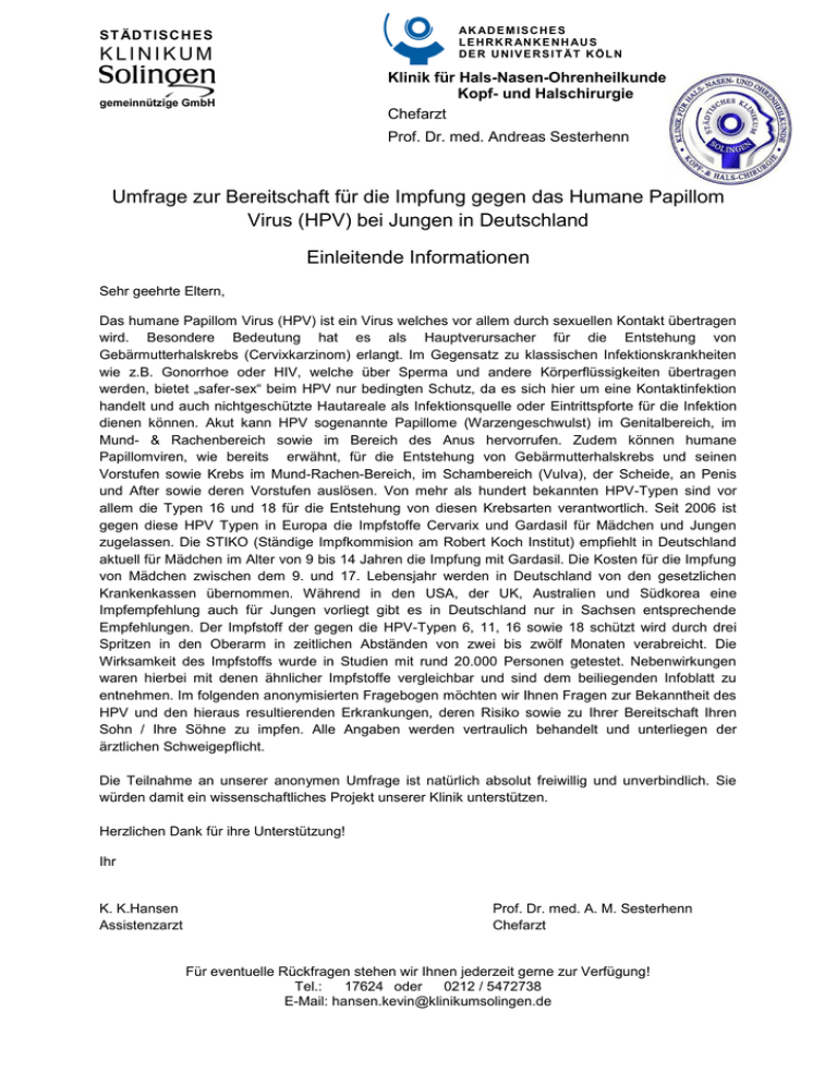 AK AD E M I S C H E S L E H R K R AN K E N H AU S D E R U N I V E R S I T ÄT K Ö L N ST ÄDT I SC H E S KLINIKUM Klinik für Hals-Nasen-Ohrenheilkunde Kopf- und Halschirurgie Chefarzt gemeinnützige GmbH Prof. Dr. med. Andreas Sesterhenn Umfrage zur Bereitschaft für die Impfung gegen das Humane Papillom Virus (HPV) bei Jungen in Deutschland Einleitende Informationen Sehr geehrte Eltern, Das humane Papillom Virus (HPV) ist ein Virus welches vor allem durch sexuellen Kontakt übertragen wird. Besondere Bedeutung hat es als Hauptverursacher für die Entstehung von Gebärmutterhalskrebs (Cervixkarzinom) erlangt. Im Gegensatz zu klassischen Infektionskrankheiten wie z.B. Gonorrhoe oder HIV, welche über Sperma und andere Körperflüssigkeiten übertragen werden, bietet „safer-sex“ beim HPV nur bedingten Schutz, da es sich hier um eine Kontaktinfektion handelt und auch nichtgeschützte Hautareale als Infektionsquelle oder Eintrittspforte für die Infektion dienen können. Akut kann HPV sogenannte Papillome (Warzengeschwulst) im Genitalbereich, im Mund- & Rachenbereich sowie im Bereich des Anus hervorrufen. Zudem können humane Papillomviren, wie bereits erwähnt, für die Entstehung von Gebärmutterhalskrebs und seinen Vorstufen sowie Krebs im Mund-Rachen-Bereich, im Schambereich (Vulva), der Scheide, an Penis und After sowie deren Vorstufen auslösen. Von mehr als hundert bekannten HPV-Typen sind vor allem die Typen 16 und 18 für die Entstehung von diesen Krebsarten verantwortlich. Seit 2006 ist gegen diese HPV Typen in Europa die Impfstoffe Cervarix und Gardasil für Mädchen und Jungen zugelassen. Die STIKO (Ständige Impfkommision am Robert Koch Institut) empfiehlt in Deutschland aktuell für Mädchen im Alter von 9 bis 14 Jahren die Impfung mit Gardasil. Die Kosten für die Impfung von Mädchen zwischen dem 9. und 17. Lebensjahr werden in Deutschland von den gesetzlichen Krankenkassen übernommen. Während in den USA, der UK, Australien und Südkorea eine Impfempfehlung auch für Jungen vorliegt gibt es in Deutschland nur in Sachsen entsprechende Empfehlungen. Der Impfstoff der gegen die HPV-Typen 6, 11, 16 sowie 18 schützt wird durch drei Spritzen in den Oberarm in zeitlichen Abständen von zwei bis zwölf Monaten verabreicht. Die Wirksamkeit des Impfstoffs wurde in Studien mit rund 20.000 Personen getestet. Nebenwirkungen waren hierbei mit denen ähnlicher Impfstoffe vergleichbar und sind dem beiliegenden Infoblatt zu entnehmen. Im folgenden anonymisierten Fragebogen möchten wir Ihnen Fragen zur Bekanntheit des HPV und den hieraus resultierenden Erkrankungen, deren Risiko sowie zu Ihrer Bereitschaft Ihren Sohn / Ihre Söhne zu impfen. Alle Angaben werden vertraulich behandelt und unterliegen der ärztlichen Schweigepflicht. Die Teilnahme an unserer anonymen Umfrage ist natürlich absolut freiwillig und unverbindlich. Sie würden damit ein wissenschaftliches Projekt unserer Klinik unterstützen. Herzlichen Dank für ihre Unterstützung! Ihr K. K.Hansen Assistenzarzt Prof. Dr. med. A. M. Sesterhenn Chefarzt Für eventuelle Rückfragen stehen wir Ihnen jederzeit gerne zur Verfügung! Tel.: 17624 oder 0212 / 5472738 E-Mail: [email protected] Fragebogen Erster Teil: Fragen zum humanen Papillomvirus 1. Haben Sie bereits vor dieser Umfrage einmal vom humanen Papillomvirus (HPV) gehört? ja nein weiß nicht 2. Wussten Sie dass das HPV sexuell übertragbar ist? ja nein weiß nicht 3. Kannten Sie die Art der Übertragung des humanen Papillomvirus? (Kontaktübertragung) ja nein weiß nicht 4. Haben Sie gewusst, dass HPV sog Papillome (Warzengeschwulst) bei Männern und Frauen im Genitalbereich, im Kehlkopf und Mund sowie im Analbereich auslösen kann? ja nein weiß nicht 5. Wussten Sie, dass HPV Gebärmutterhalskrebs auslösen kann? ja nein weiß nicht 6. Wussten Sie, dass HPV Krebs im Analbereich bei Männern sowie Krebs des Penis auslösen kann? ja nein weiß nicht 7. Wussten Sie, dass das HPV Krebs im Mund und Rachenbereich auslösen kann? ja nein weiß nicht Zweiter Teil: Fragen zum Impfstoff gegen das humane Papillomvirus 1. Wussten Sie, dass Impfungen gegen HPV existieren? ja nein weiß nicht 2. Würden Sie sich gegen HPV impfen lassen? ja nein weiß nicht 3. Warum würden Sie sich gegen HPV impfen lassen? Selbstschutz Schutz der/des Partnerin/Partners 2 weiß nicht 4. Warum würden Sie sich nicht gegen HPV impfen lassen? Kosten Bedenken bzgl. der Sicherheit eines Impfstoffes weiß nicht 5. Würden Sie ihre Kinder gegen HPV impfen lassen? ja nein weiß nicht 6. Warum würden Sie ihre Kinder gegen HPV impfen lassen? Selbstschutz Schutz der/des potentiellen Partnerin/Partners in der Zukunft weiß nicht 7. Warum würden Sie ihre Kinder nicht gegen HPV impfen lassen? Kosten Bedenken bzgl. der Sicherheit eines Impfstoffes weiß nicht 8. Wussten Sie, dass die Kosten für eine HPV Impfung in Deutschland bei den gesetzlichen Versicherungen aktuell lediglich bei Mädchen im Alter zwischen 9 und 17 Jahren übernommen werden? ja nein weiß nicht 9. Würden Sie Ihren Sohn gegen HPV impfen lassen? ja nein weiß nicht 10. Warum würden Sie ihren Sohn gegen HPV impfen lassen? Selbstschutz Schutz der/des potentiellen Partnerin/Partners in der Zukunft weiß nicht 11. Warum würden Sie ihren Sohn nicht gegen HPV impfen lassen? Kosten Bedenken bzgl. der Sicherheit eines Impfstoffes weiß nicht 12. Würden Sie Ihren Sohn gegen HPV impfen lassen wenn die Kosten übernommen werden würden? ja nein weiß nicht 13. Wären Sie gegeben falls bereit die Kosten für die Impfung ihres Sohnes selber zu tragen? ja nein weiß nicht 14. Gäbe es Unterschiede bzgl. ihrer Bereitschaft ihren Sohn oder ihre Tochter impfen zu lassen? ja nein weiß nicht 3 15. Weshalb gibt es eventuelle Unterschiede? Kosten Bedenken bzgl. der Sicherheit eines Impfstoffes weiß nicht sonstige: 16. In Australien ist 2014 die flächendeckende Impfung für Mädchen und Jungen von 1213 Jahren empfohlen worden. Würden Sie ein solches Vorgehe