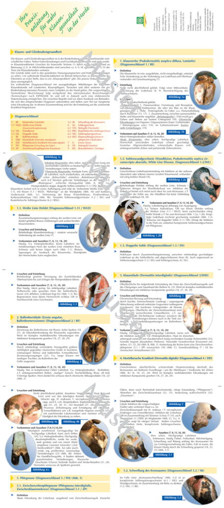Ein Verzeichnis für weiterführende Literatur kann bei der DLG angefordert werden. Schutzgebühr: Euro 3,- E-Mail: [email protected] Internet: www.DLG.org © DLG-Verlags-GmbH, Frankfurt am Main Telefon 0 69/2 47 88-0 Fax 0 69/2 4788-114 Eschborner Landstr. 122 D-60489 Frankfurt a. M. European Hoof Care DLG - Arbeitskreis Klauenpflege und -hygiene Deutsche LandwirtschaftsGesellschaft e.V. Ihr Pra e an xis lei für tun g m Kla eh r u ges en un in dh der eit He rde Klauen- und Gliedmaßengesundheit Diagnoseschlüssel 1 RE Klauenrehe (Laminitis) 1.1 WLD Weiße-Linie-Defekt (Zusammenhangstrennung) 1.2 1.3 2 3 4 5 5.1 WL DS BF DID DD PH ZP 1. Klauenrehe (Pododermatitis aseptica diffusa, Laminitis) (Diagnoseschlüssel 1 / RE) r te us M Die Klauen- und Gliedmaßengesundheit ist in der Rinderhaltung ein ernstzunehmender wirtschaftlicher Faktor. Neben Eutererkrankungen und Fruchtbarkeitsstörungen sind insbesondere Klauenkrankheiten Ursachen für finanzielle Verluste (1) durch einen Mehraufwand an Betreuung (2,3). In Milchviehbeständen sind zwischen ca. 6 % (4) u. nahezu 40 % (5) der Tiere mit Klauenbefunden vertreten. Die Gründe dafür sind in den geänderten Nutzungsansprüchen und Haltungsbedingungen zu sehen. Um auftretende Klauenkrankheiten im Betrieb beherrschen zu können, steht die Erkenntnis an erster Stelle, dass es ein „Klauenproblem“ gibt. Die präzise Dokumentation ist dazu unumgänglich. Ein einheitlicher Diagnoseschlüssel mit aussagekräftigen Abbildungen der einzelnen Klauenbefunde soll Landwirten, Klauenpflegern, Tierärzten und allen weiteren mit der Rinderhaltung betrauten Personen einen Leitfaden an die Hand geben. Die vorgeschlagene Nomenklatur (Bezeichnung) folgt weitgehend den internationalen Bezeichnungen (Terminologie) nach ESPINASSE (6) und soll in Zukunft auch eine elektronische Datenerfassung ermöglichen. Die einzelnen Begriffe sind vor allem Ausdruck von Befunden, die sich den entsprechenden Diagnosen unterordnen und stellen zum Teil nur Symptome einer Erkrankung dar. In diesem Zusammenhang wird bei der Entstehung auf die auslösende Krankheit hingewiesen. Wandläsion Doppelte Sohle Ballenhornfäule Klauenfäule (Dermatitis interdigitalis) Mortellarosche Krankheit (Dermatitis digitalis) Phlegmone (Schwellung des Fußes) Zwischenzehenphlegmone (Panaritium) 5.2 6 6.1 6.2 6.3 6.4 SK SG STG RSG SSG KSG 7 8 9 LI HS B/S Schwellung des Kronsaums Sohlengeschwür Steingalle (Druckstelle) Rusterholzsches Sohlengeschwür Sohlenspitzengeschwür Klauensohlengeschwür in untypischer Lokalisation Limax (Tylom) Hornspalt (Wandriss) Besonderheiten / Sonstiges ➤ Definition Die Klauenrehe ist eine ausgedehnte, nicht erregerbedingte, entzündliche Veränderung an der Verbindung von Lederhaut und Oberhaut verbunden mit Gewebsuntergang (7). ➤ Entstehung Noch nicht abschließend geklärt. Folge einer Mikrozirkulationsstörung der Lederhaut (8, 9). Beeinträchtigung des Hornwachstums. ➤ Ursachen Noch nicht abschließend geklärt. „Fütterungsrehe“: 1. Pansenazidose: Freisetzung und Resorption von Histamin und Endotoxinen, die über das Blut an die Klaue gelangen (15). 2. Hohe Proteingehalte im Futter: u.a. Histaminbildung durch Bakterien (15, 17). 3. Zusammenhang zwischen pansenstabiler Stärke und Klauenrehe ungeklärt. „Belastungsrehe“: Übermäßiges Gehen und Stehen auf hartem Untergrund (18). Chronische Erkrankungen von Organen / Organsystemen (Euter / Gebärmutter / Atmungsorgane usw.) (14), im Geburtszeitraum: hormonelle Umstellungen. (19). ➤ Vorkommen und Aussehen (7, 8, 13, 18, 20) Meist Hintergliedmaßen stärker betroffen. Akute Klauenrehe: eher selten, hochgradige Lahmheit, Hornschuh unverändert Lederhaut schwer geschädigt. Gestörtes Allgemeinbefinden, schmerzhafte Klauen, evtl. umfangsvermehrte Zehen und pulsierende Zehenarterien. Abbildung 1c 1.2. Sohlenwandgeschwür (Wandläsion, Pododermatitis septica circumscripta abaxialis, White Line Disease, Diagnoseschlüssel 1.2/WL) ➤ Definition Umschriebene Lederhautentzündung mit Infektion an der äußeren (abaxialen) oder seltener inneren (axialen) Klauenwand, verbunden mit eitrig-hohlen Wand (18). ➤ Ursachen und Entstehung Rehebedingte Defekte entlang der weißen Linie, Schmutz / Bakterien dringen bis Wandlederhaut vor. Infektion der Lederhaut breitet sich meist nach oben bis zum Kronsaum, z.T. auch unter der Sohle aus, das Wandhorn hat keine Verbindung mehr zur Lederhaut (18, 39). ➤ ➤ ➤ Vorkommen und Aussehen (7, 8, 13, 18, 20) Häufig. Lahmheitsgrad abhängig von Ausprägung. V.a. hintere Außenklaue. Oft nur kleine Defekte entlang der Weißen Linie (1.1 / WLD), beim nachschneiden eitrighohle Wände z.T. bis zum Kronsaum (Abb. 1.2a, 1.2b), freigelegte Lederhaut erscheint geschwürig verändert (Abb. 1.2). Teilweise mit doppelter Sohle (1.3 / DS). Dringt die Infektion in die Tiefe ein, entstehen komplizierte Sohlenwandgeschwüre mit Phlegmone. Definition Zusammenhangstrennungen entlang der weißen Linie mit dunkel gefärbten Rissen, Einblutungen und ausbrechenden Klauenrändern. Abbildung 1.1 A Ursachen und Entstehung Rehebedingte Klauenbeinsenkung / –rotation verursacht Verbreiterung der weißen Linie (7). Abbildung 1.2b Vorkommen und Aussehen (7, 8, 13, 18, 20) Häufig. V.a. Hintergliedmaßen. Keine Lahmheit. Im minderwertigen Horn der weißen Linie entstehen Risse, Schmutz und Keime folgen nach (Abb. 1.1). Bluteinlagerungen als Ausdruck der Klauenrehe, Wandplatte des Hornschuhes kann wegbrechen. Ursachen und Entstehung Rehebedingt gestörte Versorgung der hornbildenden Oberhaut kann bis zum Erliegen der Hornproduktion führen. Vorkommen und Aussehen (7, 8, 13, 18, 20) Eher häufig. Meist gering- bis mittelgradige Lahmheit. Teilbereiche oder gesamtes Horn der Sohlenfläche lassen sich abheben, Lederhaut liegt frei (Abb. 1.3). Bei Regeneration neue dünne Hornschicht sichtbar. Oft in Nachbarschaft eines Geschwüres. Abbildung 1.3 1.3. Doppelte Sohle (Diagnoseschlüssel 1.3 / DS) ➤ 3. Klaue