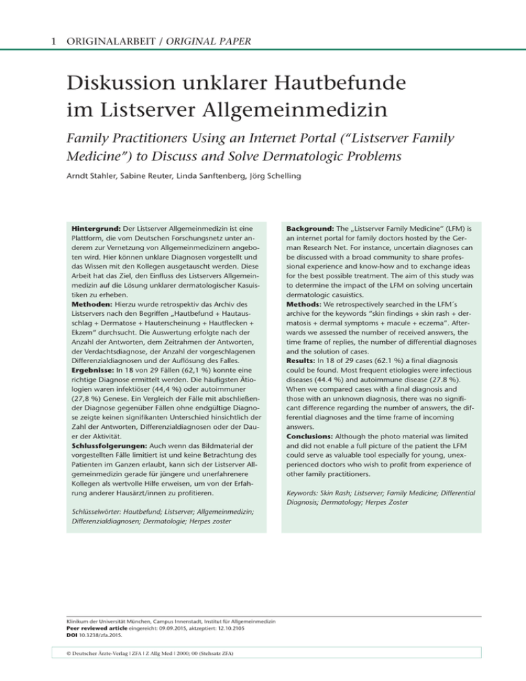 1 ORIGINALARBEIT / ORIGINAL PAPER Diskussion unklarer Hautbefunde im Listserver Allgemeinmedizin Family Practitioners Using an Internet Portal (“Listserver Family Medicine”) to Discuss and Solve Dermatologic Problems Arndt Stahler, Sabine Reuter, Linda Sanftenberg, Jörg Schelling Hintergrund: Der Listserver Allgemeinmedizin ist eine Plattform, die vom Deutschen Forschungsnetz unter anderem zur Vernetzung von Allgemeinmedizinern angeboten wird. Hier können unklare Diagnosen vorgestellt und das Wissen mit den Kollegen ausgetauscht werden. Diese Arbeit hat das Ziel, den Einfluss des Listservers Allgemeinmedizin auf die Lösung unklarer dermatologischer Kasuistiken zu erheben. Methoden: Hierzu wurde retrospektiv das Archiv des Listservers nach den Begriffen „Hautbefund + Hautausschlag + Dermatose + Hauterscheinung + Hautflecken + Ekzem“ durchsucht. Die Auswertung erfolgte nach der Anzahl der Antworten, dem Zeitrahmen der Antworten, der Verdachtsdiagnose, der Anzahl der vorgeschlagenen Differenzialdiagnosen und der Auflösung des Falles. Ergebnisse: In 18 von 29 Fällen (62,1 %) konnte eine richtige Diagnose ermittelt werden. Die häufigsten Ätiologien waren infektiöser (44,4 %) oder autoimmuner (27,8 %) Genese. Ein Vergleich der Fälle mit abschließender Diagnose gegenüber Fällen ohne endgültige Diagnose zeigte keinen signifikanten Unterschied hinsichtlich der Zahl der Antworten, Differenzialdiagnosen oder der Dauer der Aktivität. Schlussfolgerungen: Auch wenn das Bildmaterial der vorgestellten Fälle limitiert ist und keine Betrachtung des Patienten im Ganzen erlaubt, kann sich der Listserver Allgemeinmedizin gerade für jüngere und unerfahrenere Kollegen als wertvolle Hilfe erweisen, um von der Erfahrung anderer Hausärzt/innen zu profitieren. Schlüsselwörter: Hautbefund; Listserver; Allgemeinmedizin; Differenzialdiagnosen; Dermatologie; Herpes zoster Klinikum der Universität München, Campus Innenstadt, Institut für Allgemeinmedizin Peer reviewed article eingereicht: 09.09.2015, aktzeptiert: 12.10.2105 DOI 10.3238/zfa.2015. © Deutscher Ärzte-Verlag | ZFA | Z Allg Med | 2000; 00 (Stehsatz ZFA) Background: The „Listserver Family Medicine“ (LFM) is an internet portal for family doctors hosted by the German Research Net. For instance, uncertain diagnoses can be discussed with a broad community to share professional experience and know-how and to exchange ideas for the best possible treatment. The aim of this study was to determine the impact of the LFM on solving uncertain dermatologic casuistics. Methods: We retrospectively searched in the LFM´s archive for the keywords “skin findings + skin rash + dermatosis + dermal symptoms + macule + eczema”. Afterwards we assessed the number of received answers, the time frame of replies, the number of differential diagnoses and the solution of cases. Results: In 18 of 29 cases (62.1 %) a final diagnosis could be found. Most frequent etiologies were infectious diseases (44.4 %) and autoimmune disease (27.8 %). When we compared cases with a final diagnosis and those with an unknown diagnosis, there was no significant difference regarding the number of answers, the differential diagnoses and the time frame of incoming answers. Conclusions: Although the photo material was limited and did not enable a full picture of the patient the LFM could serve as valuable tool especially for young, unexperienced doctors who wish to profit from experience of other family practitioners. Keywords: Skin Rash; Listserver; Family Medicine; Differential Diagnosis; Dermatology; Herpes Zoster Stahler et al.: Diskussion unklarer Hautbefunde im Listserver Allgemeinmedizin Family practitioners using an internet portal (“Listserver Family Medicine”) to discuss and solve dermatologic problems Hintergrund Die Nutzung neuer Medien zur Fortbildung und Erweiterung des Wissens setzt sich in der Medizin durch. In einer Untersuchung aus dem Jahr 2003 hatten 34 % der Allgemeinärzte einen Internetanschluss in ihrer Praxis [1]. Innerhalb von fünf Jahren stieg diese Zahl auf 55,8 % [2]. Dennoch wurde 2002 bei der erstmaligen Befragung von Hausärzten über ihre favorisierten Fortbildungsmaßnahmen die Beschaffung von Informationen mithilfe des Internets kritisch gesehen. Dem Großteil der Befragten erschien die Nutzung wissenschaftlicher Zeitschriften, die Fortbildung durch Kollegen oder Qualitätszirkel wirkungsvoller [3]. 2008 zeichnete sich ein ähnliches Verteilungsmuster ab [4]. Dies führt zu der Frage, wie die zunehmende Vernetzung und die internetbasierte Recherche die allgemeinmedizinische Praxis am sinnvollsten unterstützen können. Seit dem Jahr 2000 existiert eine Plattform für die Diskussion mit anderen Allgemeinmedizinern: der „Listserver Allgemeinmedizin“. Dieser ist eine vom Deutschen Forschungsnetz (www. listserv.dfn.de) bereitgestellte Mailingliste (allgmed-l). In Form eines Internetforums werden Beiträge durch Abonnenten verfasst und können zusätzlich mit Befundbildern ausgestattet werden. Diese werden als E-Mail an alle in diese Liste eingetragenen Mitglieder versandt. Erfahrene Kollegen können auf diese anonymisierten Kasuistiken antworten. Sowohl Fragen als auch Antworten werden auf dem Listserver gespeichert und sind für registrierte Mitglieder einsehbar. Nach derzeitigem Stand (06/2015) sind auf den Servern des Deutschen Forschungsnetzes 759 Listen mit insgesamt 243.903 Teilnehmern verzeichnet. 680 dieser Listen sind momentan aktiv. Nach Angaben der Deutschen Gesellschaft für Allgemeinmedizin und Familienmedizin (DEGAM) dient dieser Server zur Klärung von Fragen hinsichtlich der „Diagnose, Prognose und Behandlung einzelner Patienten“ [5]. Eine neuere Untersuchung konnte die Nutzung von Diskussionsforen für den Erfahrungsaustausch von Kollegen bereits bestätigen [6]. Ein häufig diskutiertes Leitsymptom der Liste allgmed-l stellt der un- Abbildung 1 Übersicht über die analysierten Fälle zum Thema „unklarer Ha