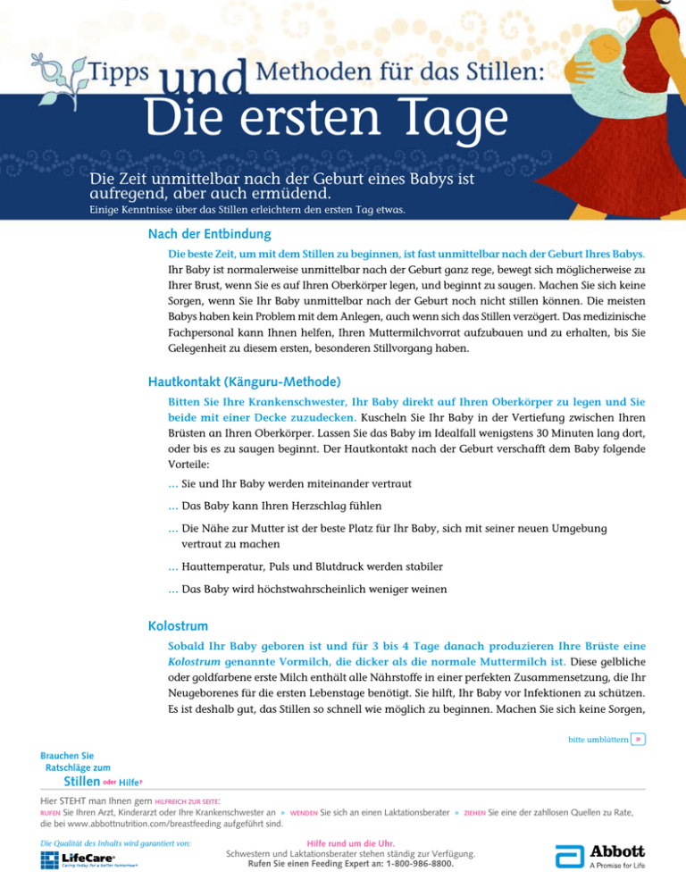 Die ersten Tage ie Zeit unmittelbar nach der Geburt eines Babys ist D aufregend, aber auch ermüdend. Einige Kenntnisse über das Stillen erleichtern den ersten Tag etwas. Nach der Entbindung Die beste Zeit, um mit dem Stillen zu beginnen, ist fast unmittelbar nach der Geburt Ihres Babys. Ihr Baby ist normalerweise unmittelbar nach der Geburt ganz rege, bewegt sich möglicherweise zu Ihrer Brust, wenn Sie es auf Ihren Oberkörper legen, und beginnt zu saugen. Machen Sie sich keine Sorgen, wenn Sie Ihr Baby unmittelbar nach der Geburt noch nicht stillen können. Die meisten Babys haben kein Problem mit dem Anlegen, auch wenn sich das Stillen verzögert. Das medizinische Fachpersonal kann Ihnen helfen, Ihren Muttermilchvorrat aufzubauen und zu erhalten, bis Sie Gelegenheit zu diesem ersten, besonderen Stillvorgang haben. Hautkontakt (Känguru-Methode) Bitten Sie Ihre Krankenschwester, Ihr Baby direkt auf Ihren Oberkörper zu legen und Sie beide mit einer Decke zuzudecken. Kuscheln Sie Ihr Baby in der Vertiefung zwischen Ihren Brüsten an Ihren Oberkörper. Lassen Sie das Baby im Idealfall wenigstens 30 Minuten lang dort, oder bis es zu saugen beginnt. Der Hautkontakt nach der Geburt verschafft dem Baby folgende Vorteile: … Sie und Ihr Baby werden miteinander vertraut … Das Baby kann Ihren Herzschlag fühlen … Die Nähe zur Mutter ist der beste Platz für Ihr Baby, sich mit seiner neuen Umgebung vertraut zu machen … Hauttemperatur, Puls und Blutdruck werden stabiler … Das Baby wird höchstwahrscheinlich weniger weinen Kolostrum Sobald Ihr Baby geboren ist und für 3 bis 4 Tage danach produzieren Ihre Brüste eine Kolostrum genannte Vormilch, die dicker als die normale Muttermilch ist. Diese gelbliche oder goldfarbene erste Milch enthält alle Nährstoffe in einer perfekten Zusammensetzung, die Ihr Neugeborenes für die ersten Lebenstage benötigt. Sie hilft, Ihr Baby vor Infektionen zu schützen. Es ist deshalb gut, das Stillen so schnell wie möglich zu beginnen. Machen Sie sich keine Sorgen, bitte umblättern Brauchen Sie Ratschläge zum Stillen oder Hilfe? Hier STEHT man Ihnen gern HILFREICH ZUR SEITE: Sie Ihren Arzt, Kinderarzt oder Ihre Krankenschwester an » die bei www.abbottnutrition.com/breastfeeding aufgeführt sind. Rufen Die Qualität des Inhalts wird garantiert von: Wenden Sie sich an einen Laktationsberater » Ziehen Hilfe rund um die Uhr. Schwestern und Laktationsberater stehen ständig zur Verfügung. Rufen Sie einen Feeding Expert an: 1-800-986-8800. Sie eine der zahllosen Quellen zu Rate, » o Tipps und Methoden für das Stillen: Der erste Tag wenn Ihr Baby während dieser ersten Stillvorgänge nur kleine Mengen zu sich nimmt. Bevor Ihr Milchvorrat ansteigt (normalerweise bis zum 3. oder 4. Tag) erhält Ihr Baby nur eine kleine Menge Kolostrum aus Ihren Brüsten — nur einige Teelöffel bis Esslöffel pro Stillvorgang. Diese kleine Menge reicht jedoch zur Ernährung Ihres Babys aus. Häufiges Stillen Stillen Sie Ihr Baby während der ersten paar Tage alle 1 bis 3 Stunden (jeweils vom Beginn des Vorgangs bis zum Beginn des nächsten Vorgangs gemessen), um: … Einen guten Milchvorrat aufzubauen … Ihrem Baby Nahrung, Antikörper und eine Vielzahl von gesundheitlichen Vorteilen zu geben … Ihrem Baby beim ersten Stuhlgang (Mekonium) zu helfen … Einem Milchstau vorzubeugen, wenn die Milch einschießt … Das Stillen zu üben, solange professionelle Hilfe gewöhnlich verfügbar ist, und bevor Ihre Brüste zu voll werden Zum Anfang Der Schlüssel zum erfolgreichen Stillen ist die richtige Haltung Ihrer Brust und des Babymundes. Eine gute Stillhaltung ermöglicht Ihrem Baby, sich voll an Ihre Brust anzulegen. Verwenden Sie ein Kissen, um den Körper Ihres Babys abzustützen. Häufiges Stillen regt die kontinuierliche Milchbildung an. Ein gutes Anlegen erfordert eventuell mehrere Versuche. Fangen Sie von vorn an, wenn Ihr Baby nicht richtig angelegt ist. Und machen Sie einfach eine Pause, wenn das erste Stillen nicht perfekt läuft! Es ist eine neue Erfahrung für Sie und für Ihr Baby, deshalb ist oft Geduld notwendig. Versuchen Sie es einfach nach ca. 30 Minuten noch einmal. Sie können auch gern um Hilfe bitten. Und denken Sie daran, ein Nickerchen zu machen, wenn Ihr Baby schläft! Nach einem Kaiserschnitt Nach einem Kaiserschnitt bringt ein frühzeitiges und häufiges Stillen viele Vorteile für Sie und Ihr Baby. Das Saugen Ihres Babys unterstützt den Rückbildungsprozess der Gebärmutter und beschleunigt Ihren Heilungsprozess. Das Stillen fördert auch die emotionale Bindung zwischen Ihnen und Ihrem Baby, was besonders wichtig ist, wenn Sie nach der Geburt getrennt wurden oder die Geburt traumatisch war. Brauchen Sie Ratschläge zum ° Stillen oder Hilfe? Hier STEHT man Ihnen gern HILFREICH ZUR SEITE: Sie Ihren Arzt, Kinderarzt oder Ihre Krankenschwester an » die bei www.abbottnutrition.com/breastfeeding aufgeführt sind. Rufen ©2011 Abbott Laboratories Inc. Januar 2011 Wenden 73150 German – The First Days Sie sich an einen Laktationsberater » Ziehen Sie eine der zahllosen Quellen zu Rate,
