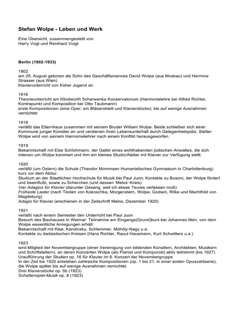 Stefan Wolpe - Leben und Werk Eine Übersicht, zusammengestellt von Harry Vogt und Reinhard Voigt Berlin (1902-1933) 1902 am 25. August geboren als Sohn des Geschäftsmannes David Wolpe (aus Moskau) und Hermine Strasser (aus Wien) Klavierunterricht von früher Jugend an 1916 Theorieunterricht am Klindworth Scharwenka Konservatorium (Harmonielehre bei Alfred Richter, Kontrapunkt und Komposition bei Otto Taubmann) erste Kompositionen (eine Oper, ein Bläseroktett und Klavierstücke); bis auf wenige Ausnahmen vernichtet 1918 verläßt das Elternhaus zusammen mit seinem Bruder William Wolpe. Beide schließen sich einer Kommune junger Künstler an und verdienen ihren Lebensunterhalt durch Gelegenheitsjobs. Stefan Wolpe wird von seinem Harmonielehrer nach einem Konflikt herausgeworfen. 1919 Bekanntschaft mit Else Schlohmann, der Gattin eines wohlhabenden jüdischen Anwaltes, die sich intensiv um Wolpe kümmert und ihm ein kleines Studio/Atelier mit Klavier zur Verfügung stellt. 1920 verläßt (um Ostern) die Schule (Theodor Mommsen Humanistisches Gymnasium in Charlottenburg) kurz vor dem Abitur. Studium an der Staatlichen Hochschule für Musik bei Paul Juon; Kontakte zu Busoni, der Wolpe fördert und beeinflußt, sowie zu Scherchen (und dessen 'Melos'-Kreis) Vier Adagios für Klavier (darunter Gesang, weil ich etwas Teures verlassen muß) Früheste Lieder (nach Texten von Kokoschka, Morgenstern, Wolpe, Godwin, Rilke und Mechthild von Magdeburg) Adagio für Klavier (erschienen in der Zeitschrift Melos, Dezember 1920) 1921 verläßt nach einem Semester den Unterricht bei Paul Juon Besuch des Bauhauses in Weimar: Teilnahme am Eingangs(Grund)kurs bei Johannes Itten, von dem Wolpe wesentliche Anregungen erhält. Bekanntschaft mit Klee, Kandinsky, Schlemmer, Móhóly-Nagy u.a. Kontakte zu dadaistischen Kreisen (Hans Richter, Raoul Hausmann, Kurt Schwitters u.a.) 1923 wird Mitglied der Novembergruppe (einer Vereinigung von bildenden Künstlern, Architekten, Musikern und Schriftstellern), an deren Konzerten Wolpe (als Pianist und Komponist) aktiv teilnimmt (bis 1927) Uraufführung der Studien op. 16 für Klavier im 6. Konzert der Novembergruppe In der Zeit bis 1925 entstehen zahlreiche Kompositionen (op. 1 bis 21, in einer ersten Opuszahlserie), die Wolpe später bis auf wenige Ausnahmen vernichtet. Drei Klavierstücke op. 5b (1923) Schattenspiel-Musik op. 8 (1923) 1924 Fünf Lieder von Friedrich Hölderlin op. 1 (bis 1927, revidiert 1935) Duo für zwei Geigen op. 2 Early Piece für Klavier (rev. und veröffentlicht 1955) 1925 verdient seinen Lebensunterhalt um 1925 als Pianist in Cabarets, als Stummfilm- und als SongBegleiter in Bars und Cafés. Beginn politischer Aktivitäten Eintritt in die KPD wird stark beeinflußt durch Alban Bergs Oper Wozzeck, die er im Klavierauszug gemeinsam mit H.H. Stuckenschmidt studiert. I. Sonate (später bezeichnet als Stehende Musik) für Klavier Drei Lieder nach Heinrich von Kleist Als er gegen seine Schöne (nach Klopstock) Bearbeitungen ostjüdischer Volkslieder op. 14 1926 Auftritte bei politischen Veranstaltungen (IAH und KdAS, Kampfbund der Arbeitersänger) Neun Vertonungen aus Gitanjali von Rabindranath Tagore Zwei Fabeln (nach Hans Sachs und Jean de La Fontaine) 1927 heiratet die Wiener Malerin Ola Okuniewska (geschieden 1933) Uraufführung der I. Sonate (Stehende Musik) im 19. Konzert der Novembergruppe (gespielt von Else C. Kraus) Rag-Caprice und Tango für Klavier Schöne Geschichten op.5 b (bis 1929, Kammeroper, nach szenischen Vorschlägen von Friedl Dicker) 1928 Zeus und Elida op. 5a (Musikalische Groteske nach Texten von Karl Wickershausen, Otto Hahn) Marsch Nr. 1 zu den Cinq Marches caractéristiques pour le Piano, an denen Wolpe 1928-31/34 arbeitet (veröffentlicht 1937 in Paris) 1929 intensive Theaterarbeit Komposition von Bühnenmusiken (für verschiedene Ensembles) und Agitprop- und Kampfliedern Bühnenmusiken u.a. zu Hamlet und zu Troilus und Cressida (Walter Mehring) An Anna Blume von Kurt Schwitters für Klavier und Musikal Clown, Dekret Nr. 2 - An die Armee der Künstler (nach W. Majakowski), Fantasie von Übermorgen (nach Erich Kästner) Zwei Lieder von Lenin und Weh für Stimme und Klavier Blues (E. Kästner) für Sprecher und Instrumente Tanz (Charleston) und Presto Agitato für Klavier 1930 Politische Satiren (nach Texten von Thomas Ring und Fedja Bönsch) Ballade von Karl Schmidt aus der grauen Stadt (nach Johannes R. Becher) für einstimmigen Chor und Klavier zahlreiche Arbeiter- und Agitproplieder nach Texten von Ring, Ottwald, Heine, Weinert u.a. 1931 Mitglied der "Truppe 31", einer Agitprop-Theatergruppe von Gustav von Wangenheim, für die Wolpe als Komponist und musikalischer Leiter (bis 1933) aktiv ist (mehr als 300 Aufführungen der Mausefalle in Berlin und auf Tournee durch Deutschland und die Schweiz) Die Mausefalle (Gustav von Wangenhaim) Passion eines Menschen: Revolutionäres Tanzspiel (Ludwig Renn) Lieder nach Texten von Ottwald, Moos, Stolle, Renn, Gumbel, Jensen u.a. (bis 1932) darunter auch: Es wird die neue Welt geboren 1932 Kantate vom Sport (nach einem Text von Siegfried Moos) für einstimmigen Chor und Instrumente Da liegt der Hund begraben (G. von Wangenheim), Bühnenmusik Proletarische Selbstkritik (Jensen) 1933 Scheidung von Ola Okuniewska Flucht aus Berlin, zusammen mit der rumänischen Pianistin Irma Schoenberg (über die Schweiz und Rußland) Besuch des Künstlerkongresses in Leningrad (vermutlich) Studiert (im Herbst 1933) für vier Monate bei Anton Webern in Wien Aufenthalt in Bukarest bei den Eltern von Irma Schoenberg (bis Anfang 1934) March and Variations op. 20 für zwei Klaviere (1932/33) Wer ist der Dümmste? (K.A. Wittfogel und G. von Wangenheim), letzte Aufführung: 4. März 1933) Zwei Studien für großes Orchester Jerusalem (1934-1938) 1934 Überfahrt nach Palästina (Mai 1934) Heiratet Irma Schoenberg (1949 geschieden) Bis 1938: In Jerusalem unterrichtet Wolpe am Konservatorium Theorie und Kompositio