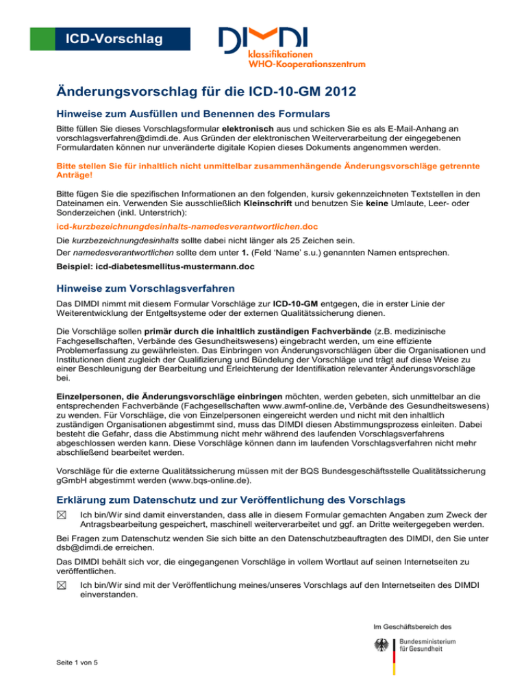 ICD-Vorschlag Änderungsvorschlag für die ICD-10-GM 2012 Hinweise zum Ausfüllen und Benennen des Formulars Bitte füllen Sie dieses Vorschlagsformular elektronisch aus und schicken Sie es als E-Mail-Anhang an [email protected]. Aus Gründen der elektronischen Weiterverarbeitung der eingegebenen Formulardaten können nur unveränderte digitale Kopien dieses Dokuments angenommen werden. Bitte stellen Sie für inhaltlich nicht unmittelbar zusammenhängende Änderungsvorschläge getrennte Anträge! Bitte fügen Sie die spezifischen Informationen an den folgenden, kursiv gekennzeichneten Textstellen in den Dateinamen ein. Verwenden Sie ausschließlich Kleinschrift und benutzen Sie keine Umlaute, Leer- oder Sonderzeichen (inkl. Unterstrich): icd-kurzbezeichnungdesinhalts-namedesverantwortlichen.doc Die kurzbezeichnungdesinhalts sollte dabei nicht länger als 25 Zeichen sein. Der namedesverantwortlichen sollte dem unter 1. (Feld ‘Name’ s.u.) genannten Namen entsprechen. Beispiel: icd-diabetesmellitus-mustermann.doc Hinweise zum Vorschlagsverfahren Das DIMDI nimmt mit diesem Formular Vorschläge zur ICD-10-GM entgegen, die in erster Linie der Weiterentwicklung der Entgeltsysteme oder der externen Qualitätssicherung dienen. Die Vorschläge sollen primär durch die inhaltlich zuständigen Fachverbände (z.B. medizinische Fachgesellschaften, Verbände des Gesundheitswesens) eingebracht werden, um eine effiziente Problemerfassung zu gewährleisten. Das Einbringen von Änderungsvorschlägen über die Organisationen und Institutionen dient zugleich der Qualifizierung und Bündelung der Vorschläge und trägt auf diese Weise zu einer Beschleunigung der Bearbeitung und Erleichterung der Identifikation relevanter Änderungsvorschläge bei. Einzelpersonen, die Änderungsvorschläge einbringen möchten, werden gebeten, sich unmittelbar an die entsprechenden Fachverbände (Fachgesellschaften www.awmf-online.de, Verbände des Gesundheitswesens) zu wenden. Für Vorschläge, die von Einzelpersonen eingereicht werden und nicht mit den inhaltlich zuständigen Organisationen abgestimmt sind, muss das DIMDI diesen Abstimmungsprozess einleiten. Dabei besteht die Gefahr, dass die Abstimmung nicht mehr während des laufenden Vorschlagsverfahrens abgeschlossen werden kann. Diese Vorschläge können dann im laufenden Vorschlagsverfahren nicht mehr abschließend bearbeitet werden. Vorschläge für die externe Qualitätssicherung müssen mit der BQS Bundesgeschäftsstelle Qualitätssicherung gGmbH abgestimmt werden (www.bqs-online.de). Erklärung zum Datenschutz und zur Veröffentlichung des Vorschlags Ich bin/Wir sind damit einverstanden, dass alle in diesem Formular gemachten Angaben zum Zweck der Antragsbearbeitung gespeichert, maschinell weiterverarbeitet und ggf. an Dritte weitergegeben werden. Bei Fragen zum Datenschutz wenden Sie sich bitte an den Datenschutzbeauftragten des DIMDI, den Sie unter [email protected] erreichen. Das DIMDI behält sich vor, die eingegangenen Vorschläge in vollem Wortlaut auf seinen Internetseiten zu veröffentlichen. Ich bin/Wir sind mit der Veröffentlichung meines/unseres Vorschlags auf den Internetseiten des DIMDI einverstanden. Im Geschäftsbereich des Seite 1 von 5 ICD-Vorschlag Pflichtangaben sind mit einem * markiert. 1. Verantwortlich für den Inhalt des Vorschlags Organisation * Offizielles Kürzel der Organisation * Internetadresse der Organisation * Anrede (inkl. Titel) * Name * Vorname * Straße * PLZ * Ort * E-Mail * Telefon * IQM Initiative Qualitätsmedizin e.V. IQM www.initiative-qualitaetsmedizin.de Herr Rohn Christian Friedrichstr. 166 10117 Berlin [email protected] 03034661051 2. Ansprechpartner (wenn nicht mit 1. identisch) Technische Universität Berlin, Fachgebiet Strukturentwicklung und Qualitätsmanagement im Gesundheitswesen Offizielles Kürzel der Organisation * TUB, SEQMGW Internetadresse der Organisation * www.seqmgw.tu-berlin.de Anrede (inkl. Titel) * Prof. Dr. med. Name * Thomas Vorname * Mansky Straße * Straße des 17. Juni 135 PLZ * 10623 Ort * Berlin E-Mail * [email protected] Telefon * 030 314-29805 Organisation * 3. Mit welchen Fachverbänden ist Ihr Vorschlag abgestimmt? * (siehe Hinweise am Anfang des Formulars) DIVI - Deutsche Interdisziplinäre Vereinigung für Intensiv- und Notfallmedizin e.V. DGU - Deutsche Gesellschaft für Unfallchirurgie e.V. Dem Antragsteller liegt eine/liegen schriftliche Erklärung/en seitens der beteiligten Fachgesellschaft/en über die Unterstützung des Antrags vor. 4. Prägnante Kurzbeschreibung Ihres Vorschlags (max. 85 Zeichen inkl. Leerzeichen) * Separater Kode für MRSA-Erreger, Unterscheidung ob im Krankenhausaufenthalt erworben Seite 2 von 5 ICD-Vorschlag 5. Art der vorgeschlagenen Änderung * Redaktionell (z.B. Schreibfehlerkorrektur) Inhaltlich Neuaufnahme von Schlüsselnummern Differenzierung bestehender Schlüsselnummern Textänderungen bestehender Schlüsselnummern Neuaufnahmen bzw. Änderungen von Inklusiva, Exklusiva und Hinweistexten Zusammenfassung bestehender Schlüsselnummern Streichung von Schlüsselnummern 6. Inhaltliche Beschreibung des Vorschlags * (inkl. Vorschlag für (neue) Schlüsselnummern, Inklusiva, Exklusiva, Texte und Klassifikationsstruktur; bitte geben Sie ggf. auch Synonyme und/oder Neuzuordnungen für das Alphabetische Verzeichnis an) Es wird beantragt, einen neuen separaten Kode für den Staphylococcus aureus mit Resistenzen gegen Oxacillin oder Methicillin (MRSA) einzuführen, um einerseits den MRSA-Erreger separat kodierbar zu machen und andererseits Kolonisation und behandlungsbedürftige Infektion, sowie den Erwerb des Erregers während oder vor dem aktuellen Krankenhausaufenthalt zu unterscheiden. U80.-! Erreger mit bestimmten Antibiotikaresistenzen, die besondere therapeutische oder hygienische Maßnahmen erfordern U80.0! Staphylococcus aureus mit Resistenz gegen Glykopeptid-Antibiotika, Chinolone, Streptogramine oder Oxazolidinone Exkl.: Staphylococcus aureus mit Resist
