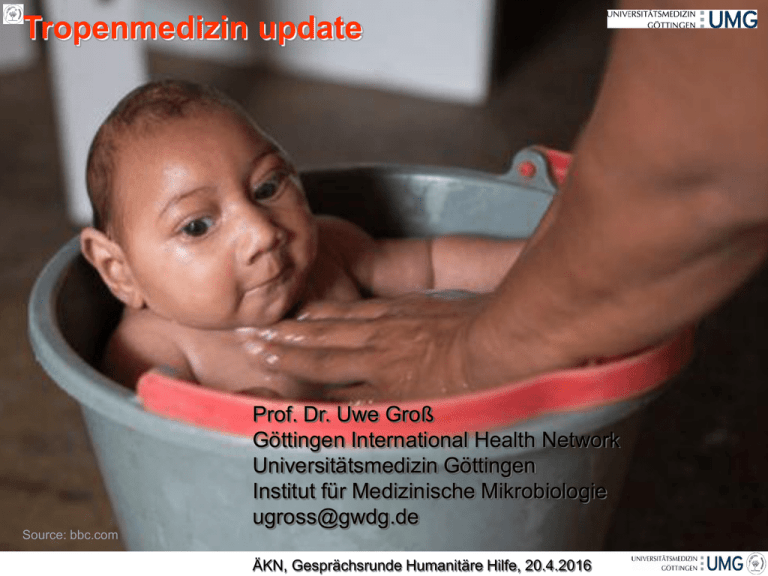 Tropenmedizin update Prof. Dr. Uwe Groß Göttingen International Health Network Universitätsmedizin Göttingen Institut für Medizinische Mikrobiologie [email protected] Source: bbc.com ÄKN, Gesprächsrunde Humanitäre Hilfe, 20.4.2016 Tropenmedizin Update 2015/2016 Masern West-Nil-Fieber Polio Mumps Diphtherie Meningitis Polio Tollwut Ebola Polio Cholera Dengue Masern Pest Chikungunya Zika Ebola-Epidemie noch nicht vorbei……. Liberia Ebola hämorrhagisches Fieber: Am 30. März ist erneut eine 30-jährige Frau aus Monrovia verstorben. Sie war zuvor mit ihren 3 Kindern nach Guinea gereist. Zwei der Kinder sind ebenfalls erkrankt. Es ist bereits das dritte Mal, dass die Epidemie wieder aufflammt, nachdem das Land bereits für ebolafrei erklärt worden war. Zuletzt hatte die WHO Mitte Januar den Ausbruch für beendet erklärt. Im März 2014 wurden die ersten Infektionen aus dem Nachbarland Guinea importiert, danach hat sich die Erkrankung landesweit ausgebreitet. Insgesamt sind in Liberia während des Ausbruchs 10.675 Menschen erkrankt und 4.809 von ihnen verstorben. Eine Infektion erfolgt entweder über Fledermäuse (z.B. Besuch von Höhlen), Kontakt mit infizierten und erkrankten Wildtieren (Affen und Antilopen, typischerweise beim Jagen oder Verzehren von ungenügend durchgebratenem Fleisch) oder über Körperflüssigkeiten von Patienten (Blut, Urin, Stuhl). Da weitere Erkrankungen nicht ausgeschlossen werden können, rät das Auswärtige Amt dringend die Nachrichtenlage aufmerksam zu verfolgen, sich von sichtbar Kranken fernzuhalten und bei Reisen ins Landesinnere besondere Vorsicht walten zu lassen. CRM 08.04.2016 Guinea Ebola hämorrhagisches Fieber: Am 29. Dezember 2015 hat die WHO den Ausbruch nach fast 2 Jahren für beendet erklärt. Am 17. März 2016 ist die Erkrankung in der Präfektur Nzérékouré (Waldguinea) wieder aufgeflammt. Seitdem wurden 9 bestätigte Fälle gemeldet. Bis auf einen sind alle Erkrankten verstorben. Die ersten Erkrankungen wurden im Dezember 2013 gemeldet. Insgesamt sind in Guinea bisher 3.804 Menschen erkrankt, 2.536 davon sind an den Symptomen des hämorrhagischen Fiebers verstorben. Eine Infektion erfolgt entweder über Fledermäuse (z.B. Besuch von Höhlen), Kontakt mit Infizierten oder erkrankten Wildtieren (Affen und Antilopen, typischerweise beim Jagen oder Verzehren von ungenügend durchgebratenem Fleisch) oder über Körperflüssigkeiten von Patienten (Blut, Urin, Stuhl). Daher ist das Infektionsrisiko für (touristisch) Reisende gering. Da Neuerkrankungen nicht ausgeschlossen werden können, wird Reisenden geraten die Nachrichtenlage aufmerksam zu verfolgen, sich von sichtbar Kranken fernzuhalten und bei Reisen besondere Vorsicht walten zu lassen. CRM, 08.04.2016 Ebola in Westafrika (Stand: 27.3.2016) Guinea 3.373 2.957 2.216 Liberia 9.482 3.150 4.241 Sierra Leone 11.742 8.484 3.687 Total 24.597 14.591 10.144 Guinea’s prefectures of Nzérékoré and Macenta: 9 Ebola cases since late February. 8 people have died and one child remains in treatment. CDC, WHO, 27.3.2016 Ebola-Impfung ist sicher und effektiv WHO/S. Hawkey Guinea Phase III efficacy vaccine trial show that VSV-EBOV (Merck, Sharp & Dohme) is highly effective against Ebola While the vaccine up to now shows 100% efficacy in individuals, more conclusive evidence is needed on its capacity to protect populations through what is called “herd immunity”. To that end, the Guinean national regulatory authority and ethics review committee have approved continuation of the trial. The technique being used in vaccine trial is called "ring vaccination" which was used in the 1970s to eradicate smallpox. Ring vaccination controls an outbreak by vaccinating all suspected individuals in an area around the outbreak. Mali Meningitis: Während der Trockenzeit (Dezember-April) kommt es in den Ländern des "Afrikanischen Meningitisgürtels" regelmäßig zu Meningitis-Epidemien. Seit Anfang des Jahres wurden bereits 234 Verdachtsfälle gemeldet, 13 Menschen sind verstorben. Neben Meningokokken wurden auch vermehrt Pneumokokken als Ursache identifiziert. Für Risikoreisende ist eine Impfung zu empfehlen. CRM 08.04.2016 Benin Meningitis: Bis einschließlich der 12. KW wurden bereits 307 Infektionen und 33 Todesfälle gemeldet. Als Erreger wurden überwiegend Pneumokokken identifiziert. Während der Trockenzeit (Dezember-April) kommt es in den Ländern des "Afrikanischen Meningitisgürtels" regelmäßig zu Meningitis-Epidemien. Für Risikoreisende ist eine Impfung zu empfehlen. CRM 08.04.2016 Burkina Faso Meningitis: Seit Anfang des Jahres wurden bereits 1.414 Infektionen und 157 Todesfälle gemeldet. Neben Meningokokken wurden auch Pneumokokken als Erreger identifiziert. Während der Trockenzeit (Dezember-April) kommt es in den Ländern des "Afrikanischen Meningitisgürtels" regelmäßig zu MeningitisEpidemien. Reisende sollten Impfschutz beachten. CRM 08.04.2016 Sambia Cholera: Seit Anfang Februar wurden aus 5 Distrikten mehrere Hundert Erkrankungen gemeldet, zahlreiche Menschen sind verstorben. Die meisten Infektionen wurden aus der Hauptstadt Lusaka gemeldet, hier wurden mehr als 600 Fälle und 12 Todesfälle verzeichnet. Die Behörden planen in Zusammenarbeit mit der Hilfsorganisation "Ärzte ohne Grenzen" und der WHO die bisher größte Impfkampagne gegen Cholera. Hygiene und ggf. Impfschutz beachten. CRM 12.04.2016 Tansania Cholera: Seit Februar letzten Jahres gibt es in verschiedenen Regionen meist kleinere Ausbrüche. Ausgehend von Dar es Salaam sind seit Mitte August in 23 Regionen mindestens 300 Menschen verstorben, es gibt etwa 20.000 Erkrankte. Auch auf Sansibar wurden mehr als 1.200 Infektionen und mindestens 7 Todesfälle verzeichnet. Im März wurden innerhalb von 2 Wochen 50 Neuinfektionen registriert. Hygiene beachten, Impfschutz für Risikoreisende erwägen. CRM 08.04.2016 Haiti: Diphtherie in Port-au-Prince In den vergangenen Wochen und Monaten wurden aus Haiti vereinzelte Todesfälle