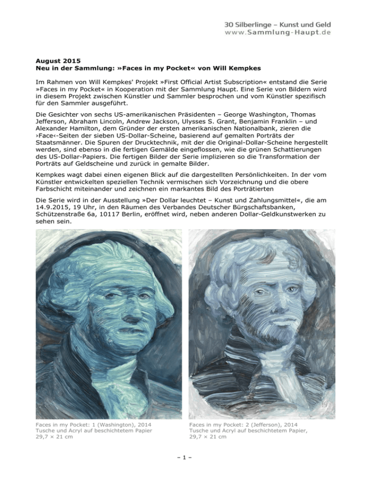 August 2015 Neu in der Sammlung: »Faces in my Pocket« von Will Kempkes Im Rahmen von Will Kempkes' Projekt »First Official Artist Subscription« entstand die Serie »Faces in my Pocket« in Kooperation mit der Sammlung Haupt. Eine Serie von Bildern wird in diesem Projekt zwischen Künstler und Sammler besprochen und vom Künstler spezifisch für den Sammler ausgeführt. Die Gesichter von sechs US-amerikanischen Präsidenten – George Washington, Thomas Jefferson, Abraham Lincoln, Andrew Jackson, Ulysses S. Grant, Benjamin Franklin – und Alexander Hamilton, dem Gründer der ersten amerikanischen Nationalbank, zieren die ›Face‹-Seiten der sieben US-Dollar-Scheine, basierend auf gemalten Porträts der Staatsmänner. Die Spuren der Drucktechnik, mit der die Original-Dollar-Scheine hergestellt werden, sind ebenso in die fertigen Gemälde eingeflossen, wie die grünen Schattierungen des US-Dollar-Papiers. Die fertigen Bilder der Serie implizieren so die Transformation der Porträts auf Geldscheine und zurück in gemalte Bilder. Kempkes wagt dabei einen eigenen Blick auf die dargestellten Persönlichkeiten. In der vom Künstler entwickelten speziellen Technik vermischen sich Vorzeichnung und die obere Farbschicht miteinander und zeichnen ein markantes Bild des Porträtierten Die Serie wird in der Ausstellung »Der Dollar leuchtet – Kunst und Zahlungsmittel«, die am 14.9.2015, 19 Uhr, in den Räumen des Verbandes Deutscher Bürgschaftsbanken, Schützenstraße 6a, 10117 Berlin, eröffnet wird, neben anderen Dollar-Geldkunstwerken zu sehen sein. Faces in my Pocket: 1 (Washington), 2014 Tusche und Acryl auf beschichtetem Papier 29,7 × 21 cm Faces in my Pocket: 2 (Jefferson), 2014 Tusche und Acryl auf beschichtetem Papier, 29,7 × 21 cm –1– Faces in my Pocket: 5 (Lincoln), 2014 Tusche und Acryl auf beschichtetem Papier 29,7 × 21 cm Faces in my Pocket: 10 (Hamilton), 2014 Tusche und Acryl auf beschichtetem Papier, 29,7 × 21 cm Will Kempkes, geboren 1986, lebt und arbeitet in Berlin. Sein Werk umfasst Malerei, Zeichnungen und Videokunst. Er absolvierte sein Kunsstudium u. a. bei den Professoren Robert Lucander und Hito Steyerl an der Universität der Künste in Berlin, am Hunter College in New York City und am CENFAD in Kuala Lumpur (Malaysia). Er wird in Berlin von der Anna Jill Lüpertz Gallery vertreten. Einzelausstellungen Vale Tudo, 2015, AJLArt, Berlin And Now We Come- All Hot Pursuit, 2013, AJLArt, Berlin Camel Police Force, 2011, Bar Babette Berlin Heads, WK 07-09, 2010 Remise Freies Museum Berlin Haushalt1 Bat Mural, 2008 Stadt Bath In Heat, 2007 Kapitalistischer Realismus 2.0, Berlin –2– Faces in my Pocket: 20 (Jackson), 2014 Tusche und Acryl auf beschichtetem Papier 29,7 × 21 cm Faces in my Pocket: 50 (Grant), 2014 Tusche und Acryl auf beschichtetem Papier, 29,7 × 21 cm Gruppenausstellungen (Auswahl) Art Karlsruhe (Kunstmesse), 2015 Karlsruhe 1398, 2014, AJLart Berlin Handlungsbereitschaft, 2012, Kunstsäle Berlin Official Participation at Draftmen's Congress, 7 Berlin Biennale, 2012 Paperwork, 2012, AJL Art at U37 Berlin 17 Tage danach, 2011, 129 Gallery, Berlin Giftshop, 2011 Bar Babette, Berlin Handlungsbereitschaft, 2011 MicaMoca Berlin Marlon Fritz Will Jan, 2010, Sammlung Lützow Berlin Umsetzen, Freies Museum Berlin, 2010 2 Good 2B4Gotten, 2010, Forgotten Bar, Berlin 40 Jahre NBK, 2009, Kunst und Öffentlichkeit, NBK Berlin Unbekannte Werke der Sammlung Lützow, 2008, Artnews Projects 4. Berliner Kunstsalon, 2007 Website des Künstlers mit weiteren Informationen und Werkabbildungen www.willkempkes.com –3– Faces in my Pocket: 100 (Franklin), 2014 Tusche und Acryl auf beschichtetem Papier 29,7 × 21 cm biografische Skizzen zu den Persönlichkeiten siehe folgende Seiten Zusammenstellung unter Verwendung von Texten des Künstlers; biografische Skizzen auf Grundlage der Wikipedia-Artikel zu den Persönlichkeiten Dr. Hermann Büchner, Kurator, Sammlung Haupt, [email protected] –4– 1$ George Washington war er einer der Gründerväter der USA und deren erster Präsident. Während seiner Präsidentschaft traf Washington wegweisende Entscheidungen, die die Entwicklung der Vereinigten Staaten von Amerika als republikanische Demokratie bis heute prägen. Er wirkte vor allem auf eine gegenüber den Einzelstaaten und dem Kongress handlungsfähige Zentralgewalt hin und bildete das neu geschaffene Amt bewusst aus, indem er Präzedenzfälle schuf. 2$ Thomas Jefferson war von 1801 bis 1809 der dritte Präsident der Vereinigten Staaten, der hauptsächliche Verfasser der amerikanischen Unabhängigkeitserklärung und einer der einflussreichsten Staatstheoretiker der USA. Von 1797 bis 1801 war er außerdem der zweite amerikanische Vizepräsident. Jefferson war einer der Gründer der DemokratischRepublikanischen Partei der Vereinigten Staaten. In seine Zeit als Präsident fielen der Kauf von Louisiana, die Lewis-und-Clark-Expedition und ein fehlgeschlagenes Handelsembargo gegen Großbritannien und Frankreich. Er gilt als »Vater der Universität von Virginia«, setzte sich für eine Trennung von Religion und Staat, für eine große Freiheit des Einzelnen und für eine starke föderale Struktur der Vereinigten Staaten ein. Darüber hinaus trat Jefferson als Architekt hervor. 5$ Abraham Lincoln amtierte von 1861 bis 1865. Seine Präsidentschaft gilt als eine der bedeutendsten in der Geschichte der Vereinigten Staaten: Die Wahl des Sklavereigegners veranlasste zunächst sieben, später weitere vier der sklavenhaltende Südstaaten aus der Union auszutreten und einen eigenen Staatenbund, die Konföderierten Staaten von Amerika zu bilden. Lincoln führte die verbliebenen Nordstaaten durch den daraus entstandenen Sezessionskrieg. Er setzte die Wiederherstellung der Union durch und betrieb erfolgreich die Abschaffung der Sklaverei in den USA. Unter seiner Regierung schlug das Land den Weg zum zentral regierten, modernen Industriestaat ein und schuf so die Basis für seinen Aufstie