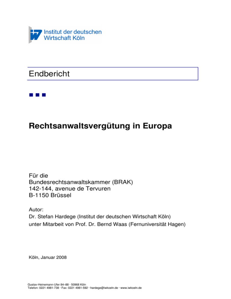 Endbericht Rechtsanwaltsvergütung in Europa Für die Bundesrechtsanwaltskammer (BRAK) 142-144, avenue de Tervuren B-1150 Brüssel Autor: Dr. Stefan Hardege (Institut der deutschen Wirtschaft Köln) unter Mitarbeit von Prof. Dr. Bernd Waas (Fernuniversität Hagen) Köln, Januar 2008 Gustav-Heinemann-Ufer 84–88 · 50968 Köln Telefon: 0221 4981-738 · Fax: 0221 4981-592 · [email protected] · www.iwkoeln.de Institut der deutschen Wirtschaft Köln Rechtsanwaltsvergütung Inhalt Executive Summary 3 1. Einleitung 5 2. 2.1 2.2 2.2.1 2.2.2 Theoretische Grundlagen Marktversagen – asymmetrische Information Formen der Regulierung Verhaltensregulierung Marktzugangsregulierung 6 6 7 8 8 3. 3.1 3.2 3.3 3.3.1 3.3.2 3.4 Der Markt für Rechtsdienstleistungen in Deutschland Die Angebotsseite – relevante Marktdaten Die Nachfrageseite – der Preis als Wettbewerbsparameter Der Regulierungsrahmen Der Regulierungsrahmen in Deutschland Regulierung im internationalen Vergleich Schlussfolgerungen für den Wettbewerb 10 11 14 17 18 21 31 4. 4.1 4.2 4.2.1 4.2.2 Rechtsanwaltsvergütung im internationalen Vergleich Untersuchung der Weltbank – Bestehende Empirie Umfrage zur Rechtsanwaltsvergütung Methodik Ergebnisse 33 33 37 38 43 5. 5.1 5.2 Erfahrungen in anderen Ländern Niederlande England und Wales 52 52 56 6. Zusammenfassung und Schlussfolgerungen 59 Literatur 63 Anhang 1: Anwaltsvergütung im Ausland 66 Anhang 2: Fragebogen – Rechtsanwaltsvergütung in Europa 70 Bericht vom Januar 2008 Seite 2 von 73 Institut der deutschen Wirtschaft Köln Rechtsanwaltsvergütung Executive Summary Die EU-Kommission strebt eine Intensivierung des Wettbewerbs im Bereich juristischer Dienstleistungen an, die unter anderem zu geringeren Preisen für anwaltliche Dienstleistungen führen soll. Gesetzlich determinierte Vergütungsregelungen, wie sie derzeit in Deutschland in der Form von Mindestpreisen für die gerichtliche Vertretung gelten, stehen dabei in der Kritik. Vor diesem Hintergrund untersucht die vorliegende Studie die Wettbewerbssituation auf dem deutschen Markt für juristische Dienstleistungen. Zudem werden Anwaltskosten im internationalen Vergleich betrachtet, wobei auch der Versuch unternommen wird, die Höhe der Anwaltsvergütung für die gerichtliche Vertretung in Deutschland durch eine Umfrage international zu vergleichen. Die Angebotsseite des Marktes für juristische Dienstleistungen ist durch einen relativ intensiven, funktionsfähigen Wettbewerb gekennzeichnet. Die Anwaltsdichte ist im Vergleich zu vielen europäischen Ländern höher und die Zahl der Rechtsanwälte hat in den letzten Jahren stetig zugenommen. Die Umsätze deutscher Anwälte und Kanzleien sind im europäischen Vergleich eher unterdurchschnittlich. Da eine höhere Vergütung unter sonst gleichen Bedingungen zu höheren Umsätzen führt, könnte dies auf eine in Deutschland geringere Durchschnittsvergütung im internationalen Vergleich schließen lassen. Unterschiedliche Untersuchungen deuten darauf hin, dass sich Nachfrager bei der Wahl des Anwalts eher an Qualität und Reputation als an der Vergütungshöhe orientieren. Dieses Verhalten kann einem intensiven Preiswettbewerb zwischen den Rechtsanwälten – und damit sinkenden Preisen – entgegen wirken. Eine Ursache für dieses Verhalten besteht in der geringen Transparenz des Marktes und den hohen Informations- und Transaktionskosten. Informationssysteme und -verpflichtungen können die Transparenz steigern und so den Wettbewerb intensivieren. Auch die Existenz und Orientierung an einer Vergütungsregelung kann die Transparenz erhöhen und die Transaktionskosten senken. Dies ermöglicht ex ante eine bessere Kosteneinschätzung für den Mandanten, ermöglicht Preisvergleiche und kann sich damit positiv auf die Inanspruchnahme anwaltlicher Leistungen auswirken. Die Intensität der Regulierung im Bereich der juristischen Dienstleistungen – die durch Indikatoren der OECD dokumentiertet wird – ist in Deutschland im internationalen Vergleich überdurchschnittlich hoch. Einen wesentlichen Anteil daran hat die Mindestpreisregulierung, die für die Vertretung vor Gericht gilt. Es herrscht in Deutschland ein Nebeneinander freier Vergütungsvereinbarungen und regulierter Mindestpreise. In anderen Regulierungsbereichen (z.B. Werbung und Ausbildungsanforderungen) liegen die Indikatorwerte für Deutschland in etwa im Durchschnitt der betrachteten Länder. Um die anwaltliche Vergütung international zu vergleichen, bedarf es aussagefähiger allgemeingültiger Daten, die derzeit nicht vorliegen. Als Anhaltspunkt können Erhebungen der Weltbank in der Studie „Doing Business“ dienen. Darin wird anhand eines konkreten Beispielfalls die Höhe der entstehenden Anwaltskosten in unterschiedlichen Ländern bestimmt. Ein Vergleich dieser Daten unter 22 europäischen Ländern kommt zu dem Ergebnis, dass diese Kosten in Deutschland trotz der herrschenden Regulierung gering sind. Nur in vier Ländern sind die Kosten niedriger als in Deutschland, während sie in vielen anderen Staaten – auch in solchen, in Bericht vom Januar 2008 Seite 3 von 73 Institut der deutschen Wirtschaft Köln Rechtsanwaltsvergütung denen nur eine geringe Regulierungsdichte herrscht – zum Teil merklich höher ausfallen. Das Potenzial für Kostensenkungen in Deutschland durch Liberalisierungen – zum Beispiel durch die Aufhebung der Mindestpreise für die Vertretung vor Gericht – wäre auf der Grundlage dieses Kostenmaßstabs vergleichsweise begrenzt. Wären die Kosten außergewöhnlich hoch, würden derartige Reformmaßnahmen mehr Erfolg versprechen. Um den Kenntnisstand bezüglich der Anwaltskosten im internationalen Vergleich zu verbessern, wurde eine Expertenbefragung anhand von unterschiedlichen Modellfällen durchgeführt. Die Rücklaufquote war allerdings zu gering, um repräsentative Aussagen für einen Preisvergleich treffen zu können. Unter dieser Einschränkung ist die Vergütung deutscher Rechtsanwälte im 