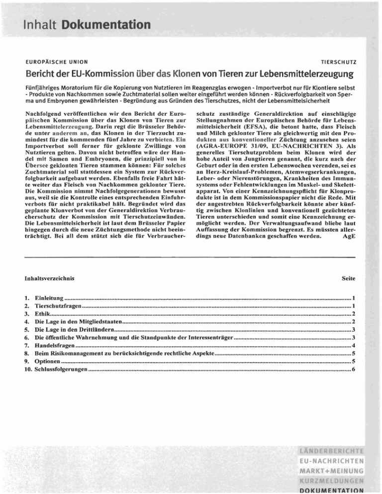 Inhalt Dokumentation EUROPÄISCHE UNION TIERSCHUTZ Bericht der EU-Kommission über das Klonen von TIeren zur lebensmittelerzeugung Fünfjähriges Moratorium für die Kopierung von Nutztieren im Reagenzglas erwogen - Importverbot nur für Klontiere selbst - Produkte von Nachkommen sowie Zuchtmaterial sollen weiter eingeführt werden können - Rückverfolgbarkeit von Sper­ ma und Embryonen gewährleisten - Begründung aus Gründen des TIerschutzes. nicht der Lebensmittelsicherheit Nachfolgend veröffentlichen wir den Bericht der Euro­ pllischen Kommission über das Klonen von Tieren zur Lebensmittelerzeugung. Darin regt die Brüsseler Behör­ de unter anderem an, das Klonen in der Tierzucht zu­ mindest für die kommenden fünf Jahre zu verbieten. Ein Importverbot soll ferner für geklonte Zwillinge von Nutztieren gelten. Davon nicht betroffen wäre der Han­ del mit Samen und Embryonen, die prinzipiell von in Übersee geklonten Tieren stammen können: Für solches Zuchtmaterial soll stattdessen ein System zur Rückver­ folgbarkeit aufgebaut werden. Ebenfalls freie Fahrt hät­ te weiter das Fleisch von Nachkommen geklonter Tiere. Die Kommission nimmt Nachfolgegenerationen bewusst aus, weil sie die Kontrolle eines entsprechenden Einfuhr­ verbots für nicht praktikabel hält. Begründet wird das geplante KJonverbot von der Generaldirektion Verbrau­ cherschutz der Kommission mit Tierschutzeinwänden. Die Lebensmittelsicherheit ist laut dem Brüsseler Papier hingegen durch die neue Züchtungsmethode nicht beein­ trächtigt. Bei all dem stützt sieb die für Verbraucher­ schutz zuständige Generaldirektion auf einschlägige Stellungnahmen der Europäischen Behörde für Lebens­ mittelsicberheit (EFSA), die betont hatte, dass Fleisch und Milcb geklonter Tiere als gleicbwertig mit den Pro­ dukten aus konventioneller Zücbtung anzusehen seien (AGRA-EUROPE 31/09, EU-NACHRICHTEN 3). Als generelles Tierschutzproblem beim Klonen wird der hohe Anteil von Jungtieren genannt, die kurz nach der Geburt oder in den ersten Lebenswochen verenden, sei es an Herz-Kreislauf-Problemen, Atemwegserkrankungen, Leber- oder Nierenstörungen, Krankheiten des Immun­ systems oder Fehlentwicklungen im Muskel- und Skelett­ apparat. Von einer Kennzeichnungspfticht für Klonpro­ dukte ist in dem Kommissionspapier nicht die Rede. Mit der angestrebten Rückverfolgbarkeit könnte aber künf­ tig zwischen Klonlinien und konventionell gezüchteten Tieren unterschieden und somit eine Kennzeichnung er­ möglicht werden. Der Verwaltungsaufwand bliebe laut Auffassung der Kommission begrenzt. Es müssten aller­ dings neue Datenbanken geschaffen werden. AgE Inhaltsverzeichnis 1. 2. 3. 4. 5. 6. 7. 8. 9. 10. Einleitung Tierschutzfragen Etbik Die Lage in den Mitgliedstaaten Die Lage in den Drittiändern Die öffentliche Wahrnehmung und die Standpunkte der Interessenträger Handelsfragen Beim Risikomanagement zu berücksichtigende rechtliche Aspekte Optionen Schlussfolgerungen Seite 1 1 2 2 3 3 4 5 5 6 __ DOKUMENTATION­ DOKUMENTATION 1. Einleitung Mit diesem Bericht wird eine Bewertung der Technologie des Klonens fiir die Zwecke der Lebensmittelerzeugung vorgelegt. Dabei sollen die relevanten Aspekte des Klonens anhand des geltenden Rechtsrahmens beleuchtet werden. Das Klonen I ist ein relativ neues Zuchtverfahren, das die unge­ schlechtliche Reproduktion von Tieren ermöglicht, welche eine hohe Produktivität, geringe Krankheitsanfälligkeit und hohe Anpassungsfähigkeit an das Produktionsumfeld bewiesen ha­ ben. Der Bericht beschränkt sich auf Tiere, die fiir die Zwecke der Lebensmittelerzeugung gezüchtet werden. Das gewonnene Tier (der Klon) ist eine nahezu genaue genetische Kopie des Ursprungstiers. Wie bei jedem anderen Zuchtverfahren ist es wichtig, Risikobewertungen der kritischen Aspekte vorzuneh­ men, um mögliche Risiken fiir die Lebensmittelsicherheit sowie die Gesundheit und das Wohlergehen der Tiere abzuwägen. In diesem Bericht werden auch weitere Aspekte untersucht, wie die ethische Dimension, Auswirkungen auf den Handel und das Recht der Verbraucher, über das Erzeugungsverfahren infor­ miert zu werden. In einem Gutachten der Europäischen Behörde fiir Lebensmittel­ sicherheit (EFSA) vom 15. Juli 2008 2 wurden Probleme bei der Bewertung des Klonens genannt, die auf die begrenzte Anzahl der verfUgbaren Studien zurückzufiihren waren. Darin wurde auch festgestellt, dass die Gesundheit und das Wohlergehen ei­ nes bedeutenden Anteils der Klone beeinträchtigt waren, und zwar oftmals schwerwiegend und mit tödlichem Ausgang. Laut Gutachten gab es keine Anzeichen dafiir, dass im Hinblick auf die Lebensmittelsicherheit Unterschiede zwischen dem Fleisch und der Milch von Klonen und deren Nachkommen im Vergleich zu Fleisch und Milch von konventionell erzeugten Tieren bestan­ den. Schließlich wurden in dem Gutachten auch keine Auswir­ kungen auf die Umwelt prognostiziert; allerdings wurde einge­ räumt, dass hierzu nur in begrenztem Umfang Daten vorlagen. Am 26. Juni 2009 veröffentlichte die EFSA eine weitere Stel­ lungnahme über den Einsatz des Klonens bei Tieren. 3 Darin wurden die Schlussfolgerungen und Empfehlungen des EFSA­ Gutachtens von 2008 bestätigt und hinzugefügt, dass die uner­ wünschten Wirkungen, die Klone beeinträchtigen und zu Entwicklungsstörungen führen, hauptsächlich auf die "epigene­ tische Dysregulation"4 zurückzufiihren seien. Das Fehlen der Plazentaentwicklung nach dem Klonen gilt als eine der Ursa­ chen fiir die geringe Erfolgsquote des Verfahrens. Allerdings sind die unerwünschten Wirkungen bei verschiedenen Arten unterschiedlich. So tritt das LOS (Large-Offspring-Syndrom) zwar bei Rindern, nicht aber bei Schweinen auf. Dieser Zustand kann zu Schwierigkeiten bei der Geburt und zu Gesundheitspro­ blemen beim Ersatzmuttertier sowie zu Totgeburten führen. Für die Zwecke dieses Berichts (und wie in den Stellungnah­ men der EFSA und der EGE) bezeichnet "Klonen" di
